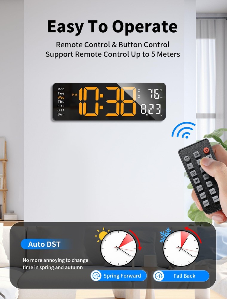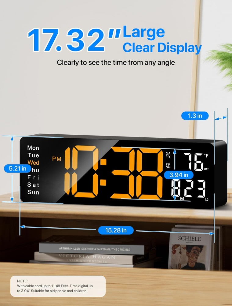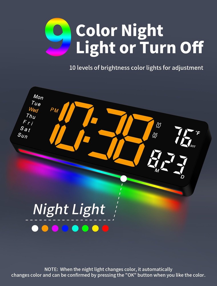 Large 17.3-Inch LED Display: Width: 15.28 inches. Height: 5.21 inches. this clock displays the time, date, day of the week, and temperature in large, bold digits. The 3.92-inch digital display is designed for easy readability from any angle and distance, making it perfect for seniors or those with visual impairments RGB Modern Night Light: Personalize your ambiance with the included bottom night light, offering 8 fixed colors and 1 multi-color option. Create a cozy atmosphere in your living room or utilize it as a night light in your bedroom, reducing the need for bright lights during late-night activities Remote-Controlled Clock: Effortlessly manage your wall clock with a remote control, operating within a 32 feet range. Featuring a simple interface, this clock is perfect for seniors or individuals with limited mobility, offering convenient access to essential clock functions. Automatic Daylight Saving Time and Auto/Manual Brightness: Seamlessly adjust to daylight saving time with a long press of the "-" button. Choose from 10 brightness levels using the remote control for personalized comfort, while the built-in automatic dimming sensor intelligently adapts to ambient lighting changes Have to Plug-in: It's NOT battery operated. It must work with 5V/2A power adapter and 11.5 feet cable cord (included). While 2 AAA batteries (not included) maintain memory function during power outages, Note: The clock requires a power cord to function and cannot run on battery power alone