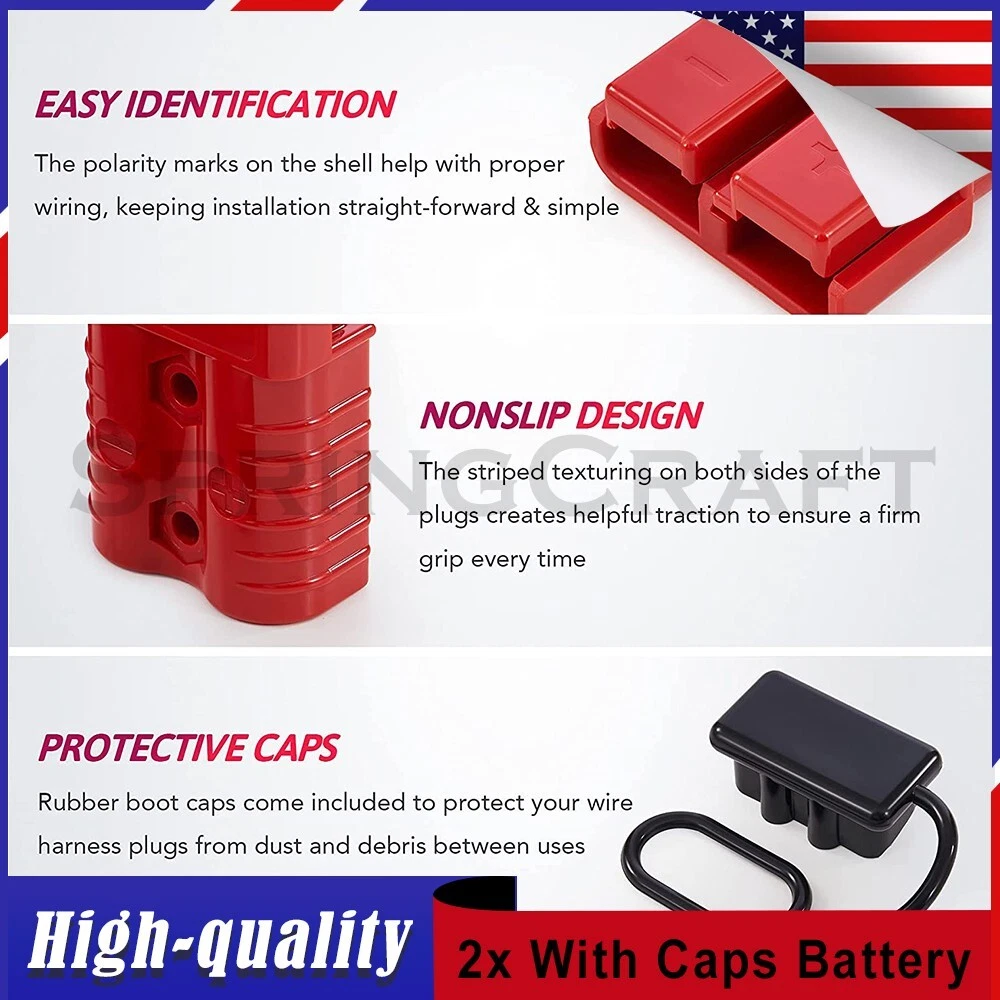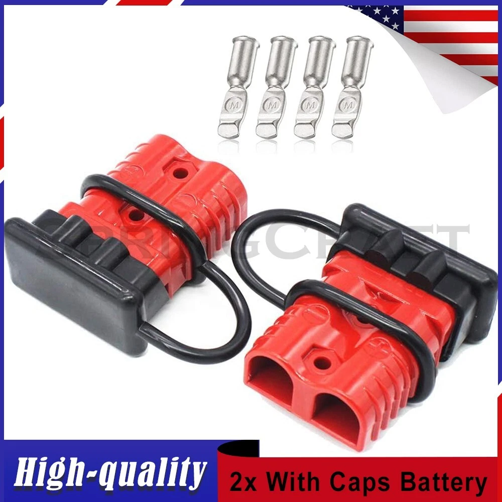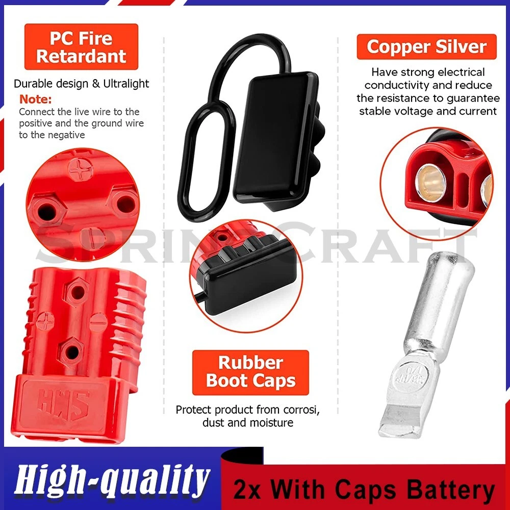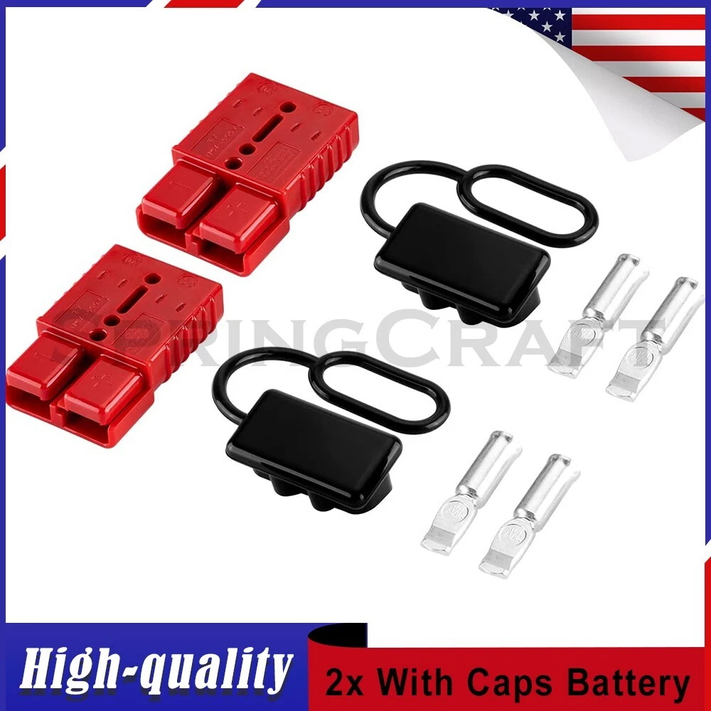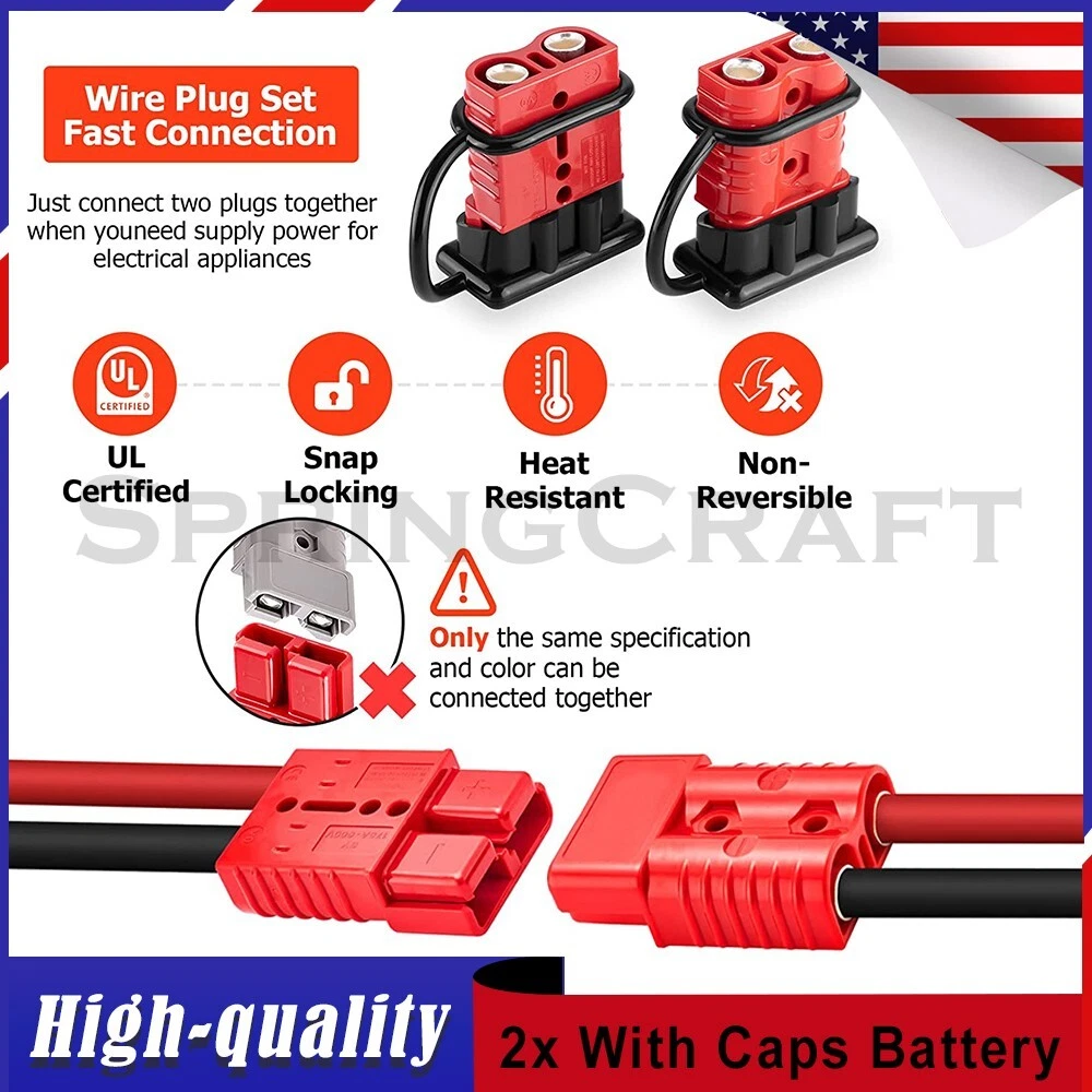 Features: WIRE CONNECTOR SET: This handy electrical wire connection set includes 2 clearly marked quick connect plugs that let you patch and disconnect 1/0 AWG (10-50mm²) wire pathways from 12V, 24V, or 36V batteries, supporting currents up to 175 amps WIDE APPLICATION: Our versatile weatherproof QC plugs offer a simple, convenient way to handle direct power connections to car batteries; truck, ATV, and RV winches, lifts, and cranes; and trolling and outboard motors on boats and watercraft, as well as home and industrial applications like lathes, chargers, and power inverters BUILT TO LAST: Each wire harness's unibody polycarbonate housing provides superior resistance to wear, corrosion, water, and heat for its full service life of over 10,000 connections; the 4 copper terminal pins are silver plated to minimize resistance and maximize stability and dependability; and the attached boot caps keep debris out between uses EASY TO USE: These quick connectors provide built-in texturing and polarity marks for sure grip and easy use; their genderless design attaches & detaches quickly and smoothly; and use is as easy as stripping the ends of your wires, fitting them into the terminals, and securing them with a crimping tool Specification: Material: Polycarbonate, Rubber, Copper Max. Current: 175A Voltage: 600V Wire Size Range: 1/0 AWG (10-50mm²) Operating Temperature Range: −4 to 221°F Terminal Pin Diameter: 0.5 in. Connector Dimensions: 3 1/8" x 2 1/8" x 1" (L*W*T) Connected Set Dimensions: 5 1/4" x 2 1/8" x 1" (L*W*T) Package Included : 2x Connector Plugs + 2x Dust Covers + 4x Terminal Pins