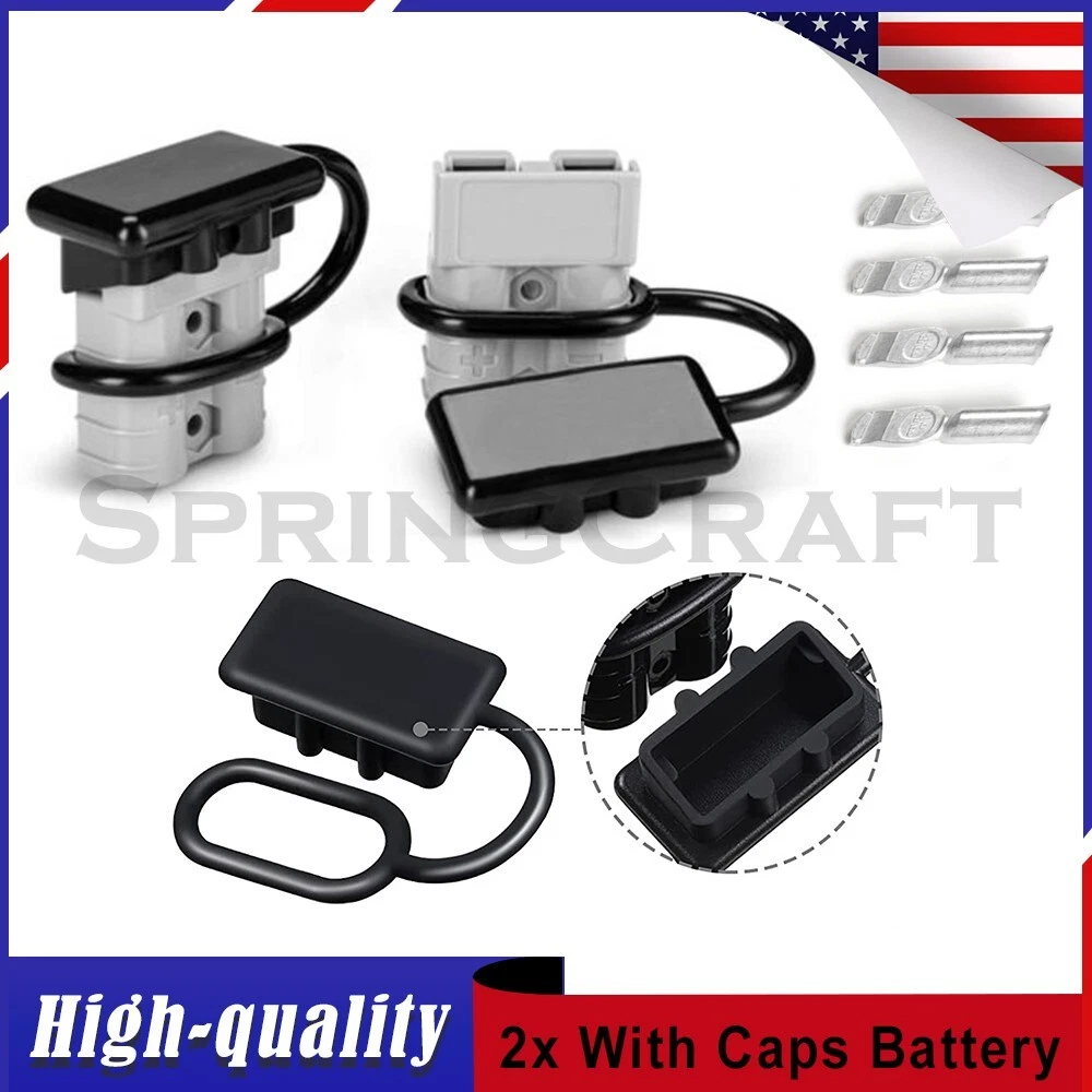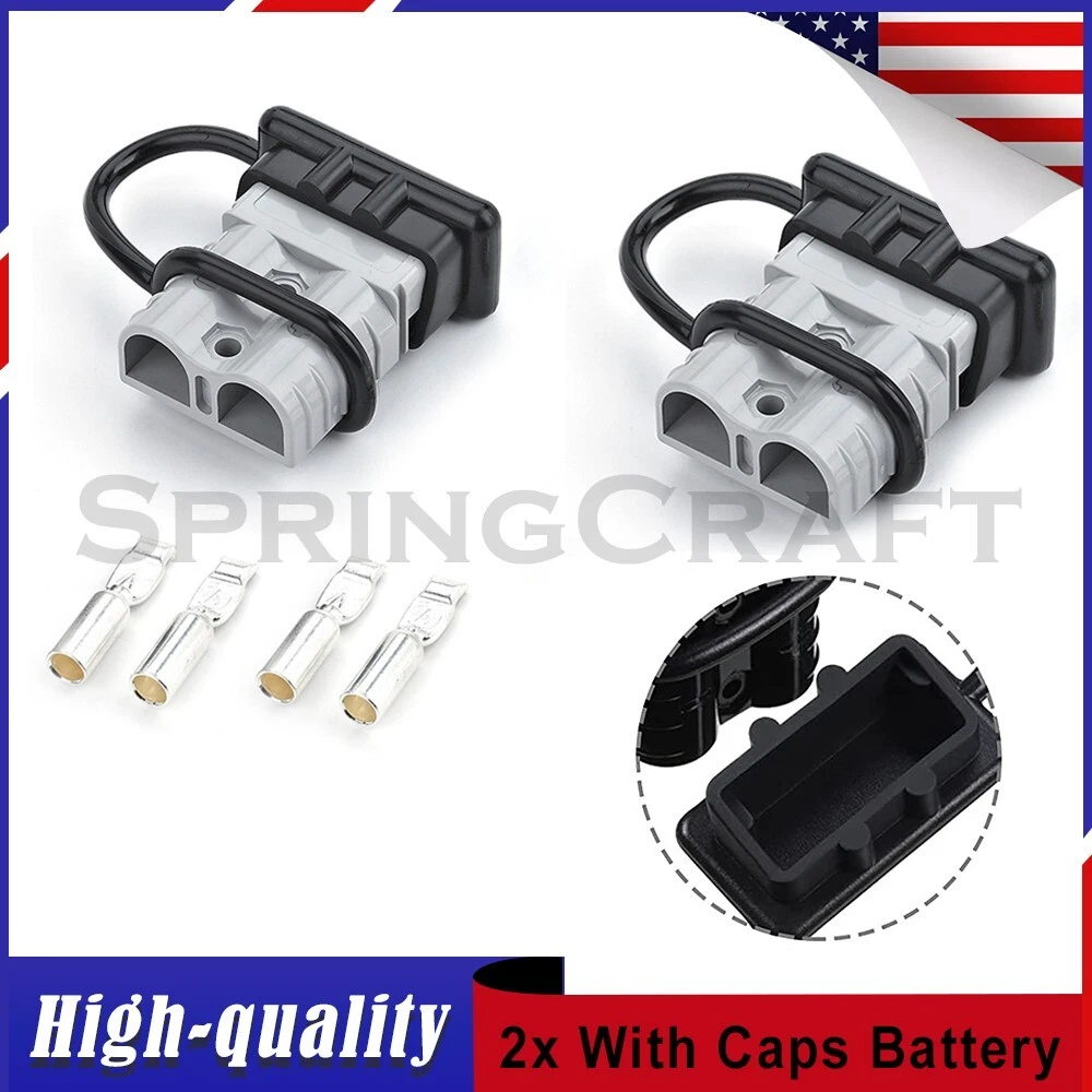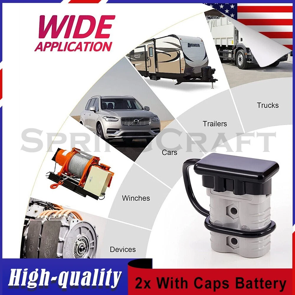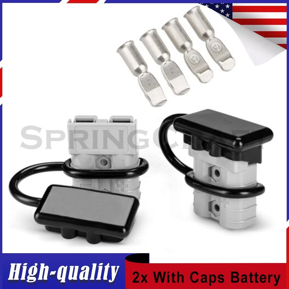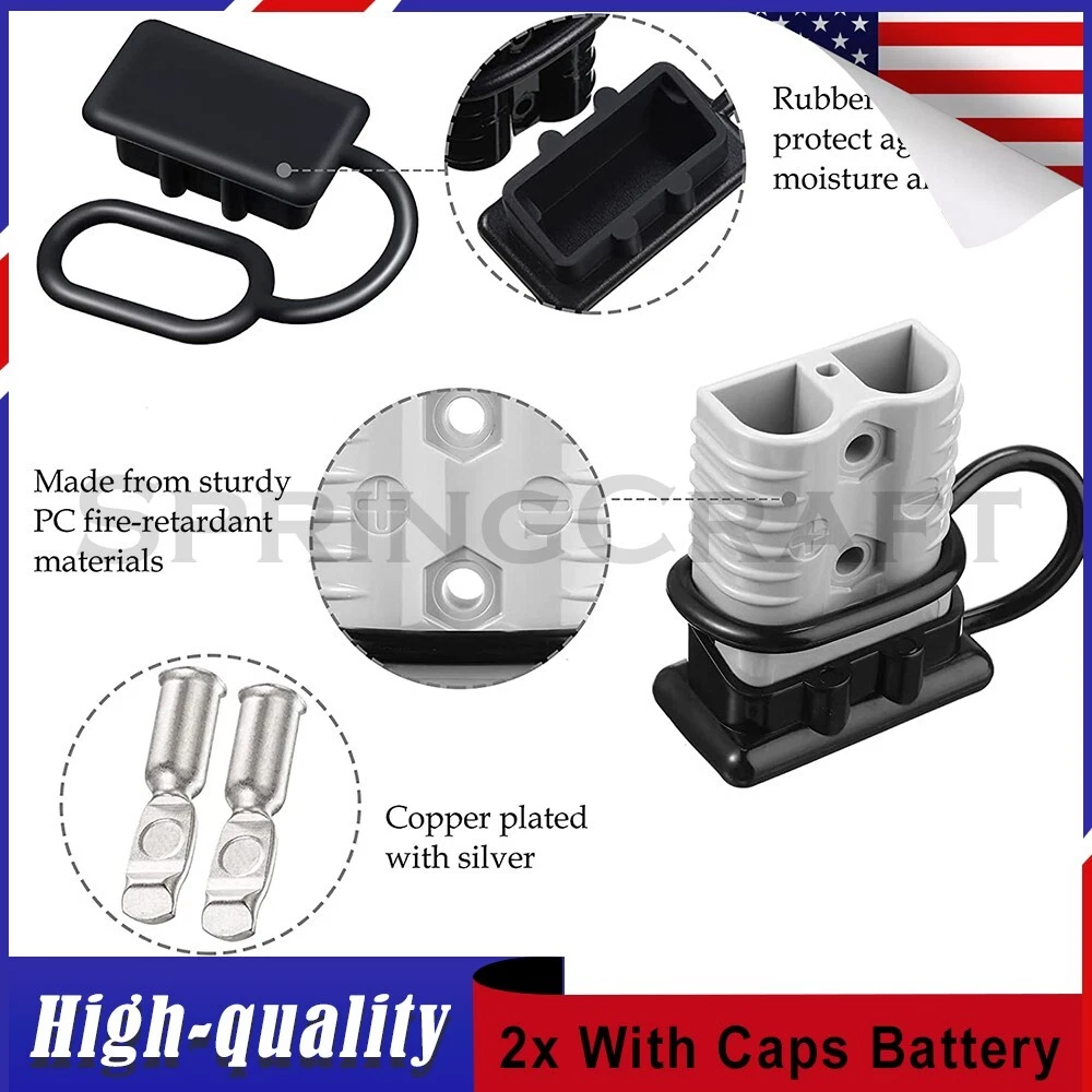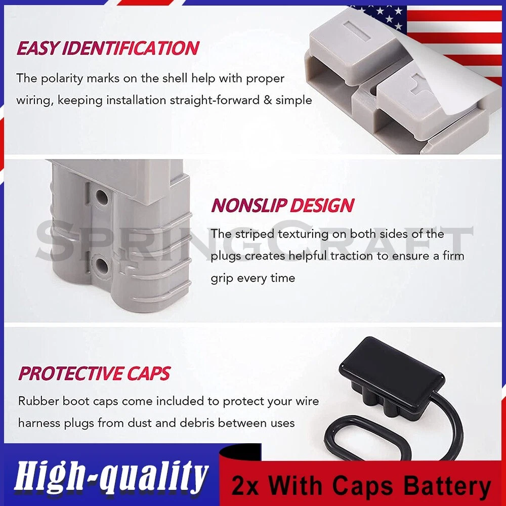 Features: WIRE CONNECTOR SET: This handy electrical wire connection set includes 2 clearly marked quick connect plugs that let you patch and disconnect 1/0 AWG (10-50mm²) wire pathways from 12V, 24V, or 36V batteries, supporting currents up to 175 amps WIDE APPLICATION: Our versatile weatherproof QC plugs offer a simple, convenient way to handle direct power connections to car batteries; truck, ATV, and RV winches, lifts, and cranes; and trolling and outboard motors on boats and watercraft, as well as home and industrial applications like lathes, chargers, and power inverters BUILT TO LAST: Each wire harness's unibody polycarbonate housing provides superior resistance to wear, corrosion, water, and heat for its full service life of over 10,000 connections; the 4 copper terminal pins are silver plated to minimize resistance and maximize stability and dependability; and the attached boot caps keep debris out between uses EASY TO USE: These quick connectors provide built-in texturing and polarity marks for sure grip and easy use; their genderless design attaches & detaches quickly and smoothly; and use is as easy as stripping the ends of your wires, fitting them into the terminals, and securing them with a crimping tool Specification: Material: Polycarbonate, Rubber, Copper Max. Current: 175A Voltage: 600V Wire Size Range: 1/0 AWG (10-50mm²) Operating Temperature Range: −4 to 221°F Terminal Pin Diameter: 0.5 in. Connector Dimensions: 3 1/8" x 2 1/8" x 1" (L*W*T) Connected Set Dimensions: 5 1/4" x 2 1/8" x 1" (L*W*T) Package Included : 2x Connector Plugs + 2x Dust Covers + 4x Terminal Pins