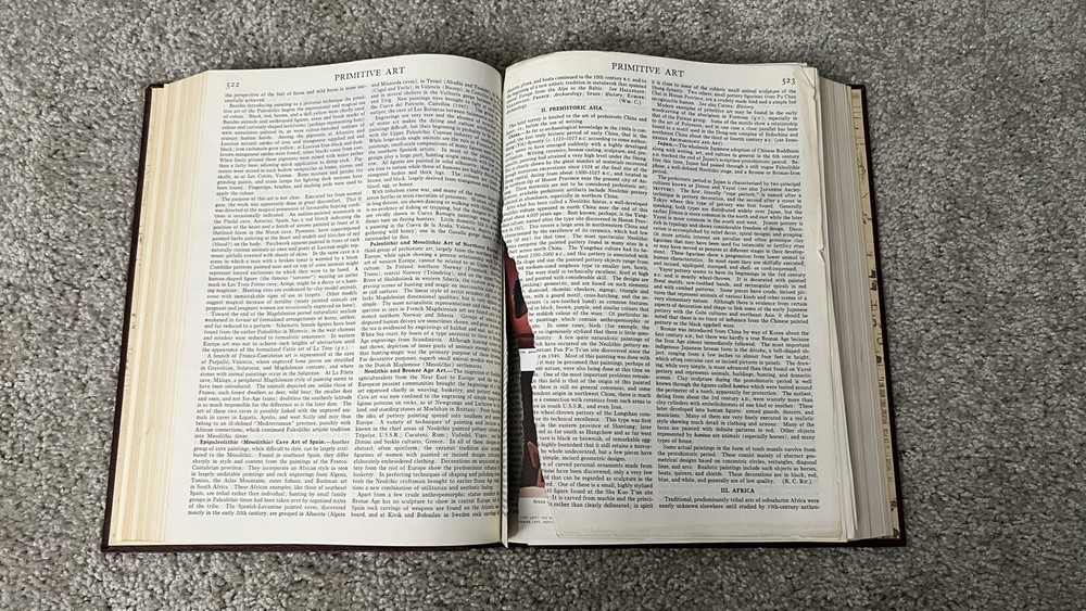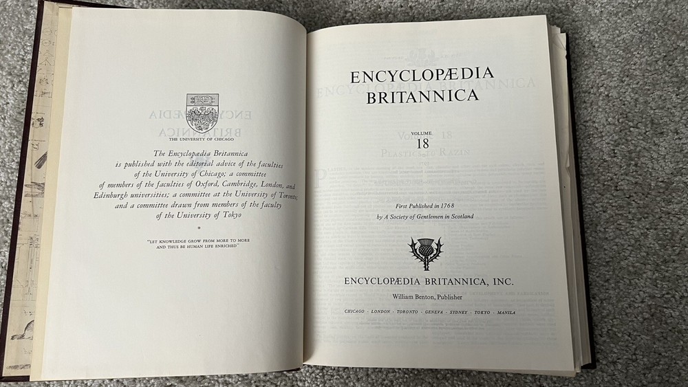 This is a hardback copy of the 18th volume of the Encyclopedia Britannica, published in 1966 by Encyclopædia Britannica, Inc. It contains a variety of topics and subjects, making it a great reference book for collectors and enthusiasts alike. The binding is intact and shows some signs of wear and tear, which is expected given its age. This unit is a great addition to any collection or library, and would make a fantastic gift for someone special. It is in fair condition with a few pages ripped as pictured. The ripped pages are included. The cover has some wear Selling as is. Please see all images before purchasing. -Volume 18 only -Fast tracking provided -Message me with any questions