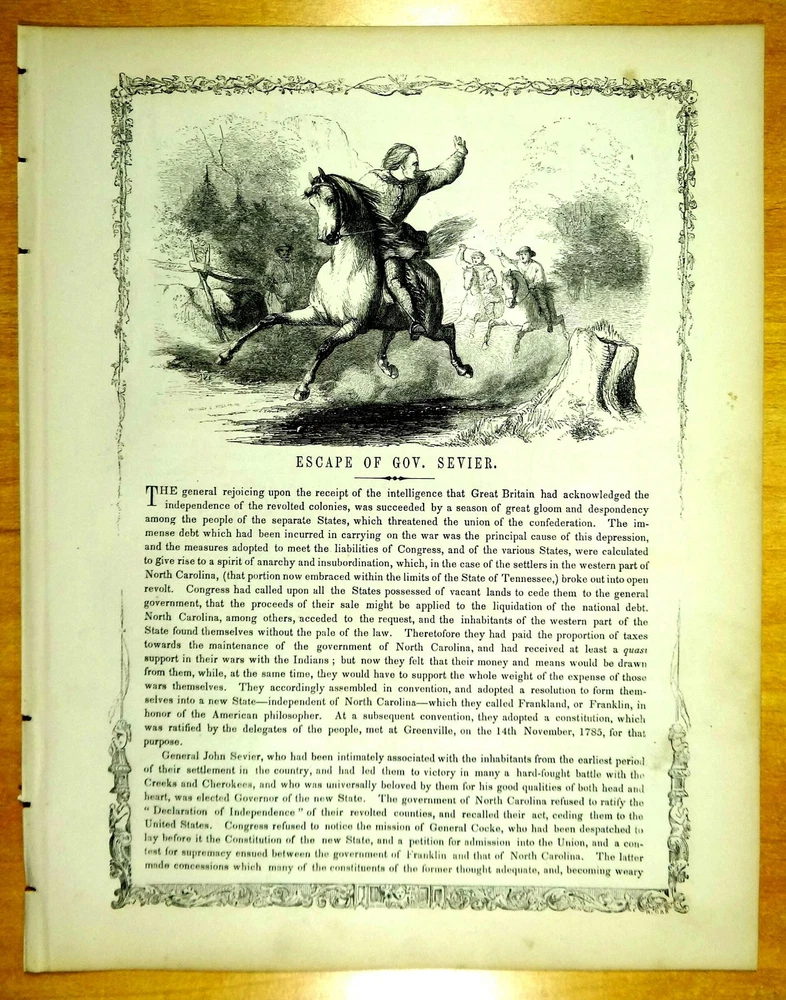 Antique Print with Narrative: " ESCAPE GOVERNOR SEVIER. " 1880's Western North Carolina. New State of Franklin. Story continues and concludes on back side of sheet. Approx. 8 5/16" x 10 3/4". From the book ILLUSTRATED AMERICAN ADVERTISER. Vol. V. THE HISTORICAL PICTURE GALLERY; or SCENES AND INCIDENTS IN AMERICAN HISTORY, A Collection of Interesting and Thrilling Narratives from the Written and Unwritten, Legendary and Traditionary, History of the United States. By John R. Chapin, with Illustrations by the Author. Published by D. Bigelow & Co., Boston 1856. Condition: Lightly age toned, a little foxing. Very good+ condition. A rare historical Americana print with narrative. -------------------------------------------------------------------- ***Please see our other auctions and ebay store listings. On May-20-07 at 13:17:47 PDT, seller added the following information: On Feb-21-12 at 21:22:44 PST, seller added the following information: