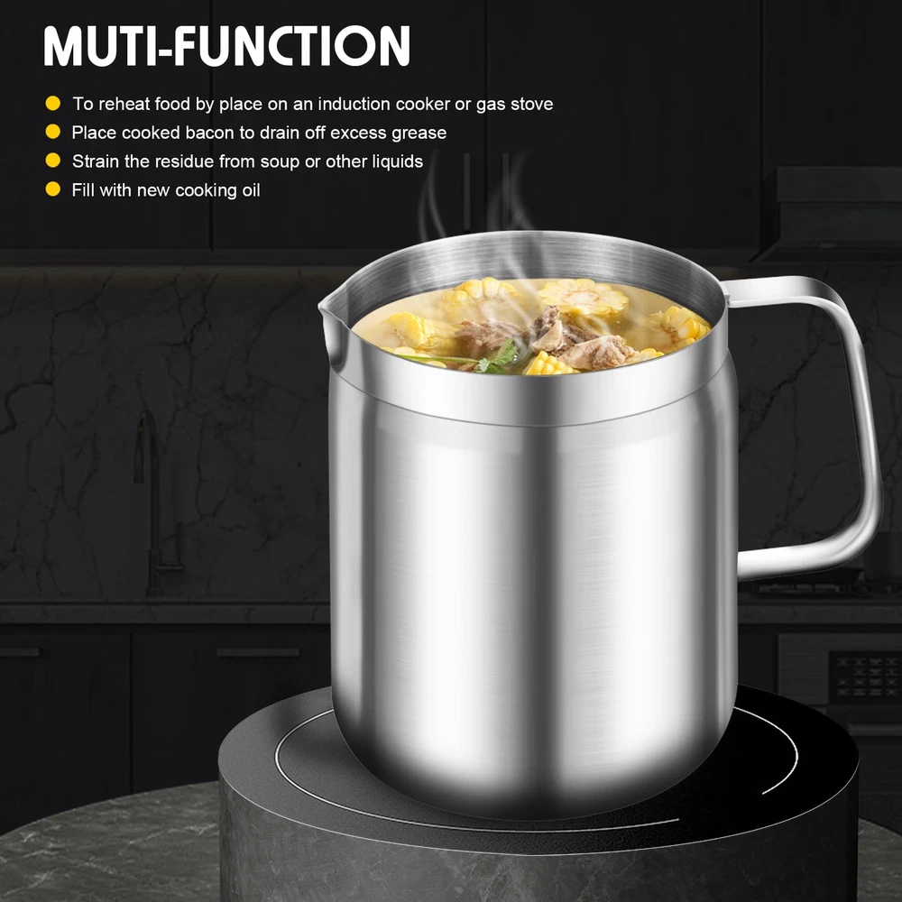 【Extreme Thick】This grease can for kitchen with strainer is extreme thickened style that thicker than most of other brands, sturdy, heavy and durable that even if dropped on the ground but nothing change. The maximum capacity is 1700ml/58oz. 【Rustproof and Fine Mesh】This grease container for kitchen that made of 304 stainless steel material, which will not rust and harmless to the human body completely . It contains 80 fine mesh is which can effectively filter residue in used oil or soup. 【Multi-function】1. it is usually used as cooking oil filter and bacon grease keeper, that worked out effectively to solve the problem of cooking oil disposal. You can make other delicious food with used oil, that help you save more money; 2. You can use it as a cooked bacon keeper to drain off excess grease if you don’t like too greasy breakfast; 3. You can remove the soup dregs from the soup by use it;4. You use it to reheat liquid food whether it's a battery stove or a gas stove. 【Healthy&Convenient】The lid can perfectly cover the oil pot to avoid insects entering. The spout is an eagle spout design that is easy to pour out the used oil cleanly without other spoon. It is comfortable to use the Ergonomic design of the handle . By using our cooking oil containerwill make your house cooking more creative and convenient. 【After sales】 When you encounter any quality problems, you can ask us to replace a new set for you at the first time. strive to give our customers the best and more comfortable online shopping experience.