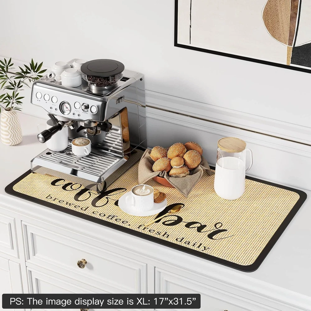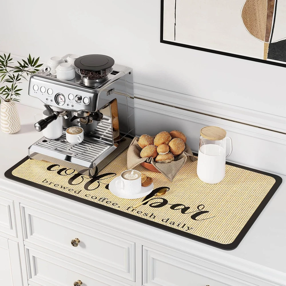【Super Absorbent & Quick Drying】Our dish drying mat is made of highly absorbent material, allowing it to quickly absorb water and keep your utensils and kitchen countertop dry. Whether for everyday use or cooking gatherings, it is an ideal choice. 【Easy to Clean & Storage】This kitchen counter mat is very easy to clean. Just rinse with water or wipe gently with mild detergent. After cleaning, it can be laid flat on the countertop or hung to dry. The soft and durable material can be easily rolled up and stored in a drawer, taking up no space. 【Anti-slip & Durable】The rubber-backed bottom of the dish drying rack mat has a good anti-slip effect. Provides great support for items such as bowls, plates, cups and draining racks, preventing items from shifting. The 0.2-inch thickness gives its kitchen countertop mat higher durability and wear resistance as well as service life. 【Wide range of uses】We offer a variety of sizes and colors to choose from, it can be used as bar mats, coffee mats, coffee pot mats, drawer storage mats, dish rack mats, pet feeding mats and other occasions that need to be kept dry. And can be cut into any size according to your needs to meet your different needs. 【Essential Kitchen Accessory】The kitchen drying mats is a must-have accessory for your kitchen. With its excellent water absorption, Temperature Resistance, non-slip properties, and easy cleaning, it adds convenience and comfort to your kitchen experience. coffee mat, coffee bar accessories, espresso accessories, kitchen decor and accessories, coffee bar mat, offee matt for counter, coffee station organizer for countertop, dish drying mat, espresso machine accessories, bar mats for countertop, coffee accessories, drying matt kitchen counter, coffee bar decor