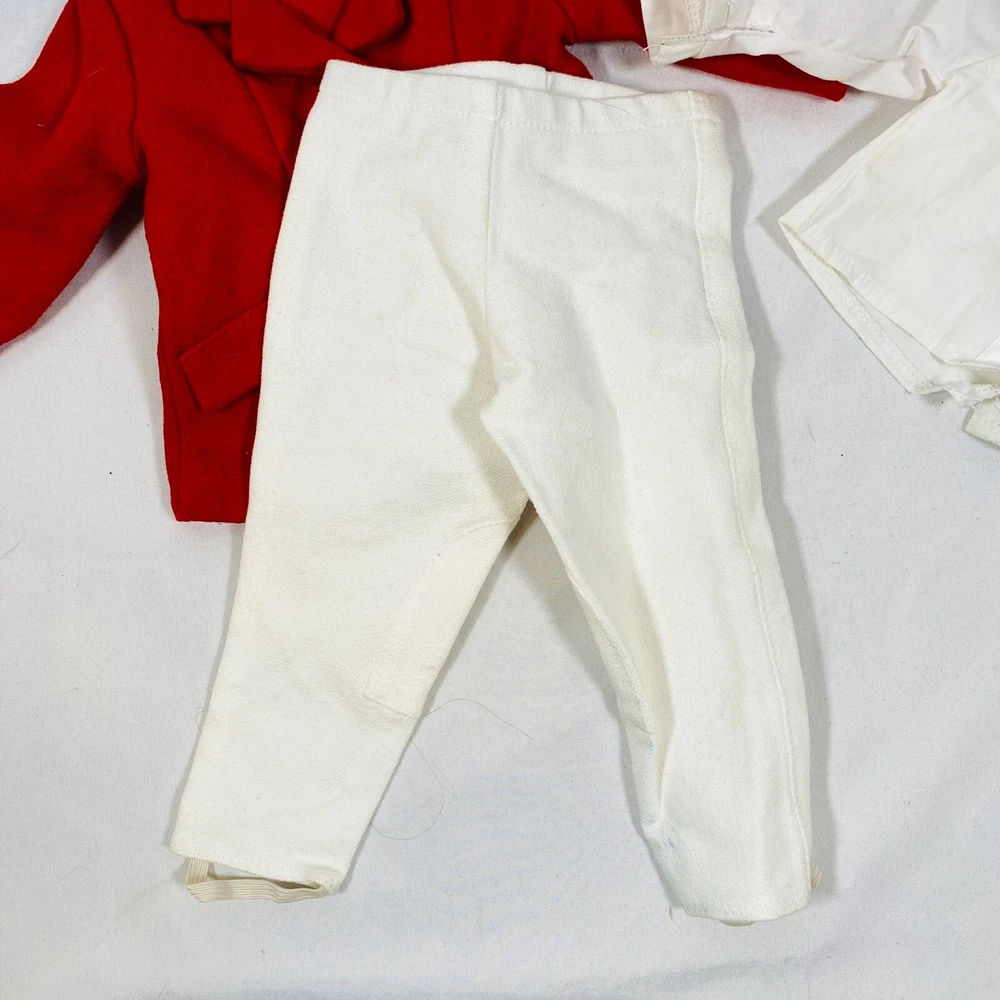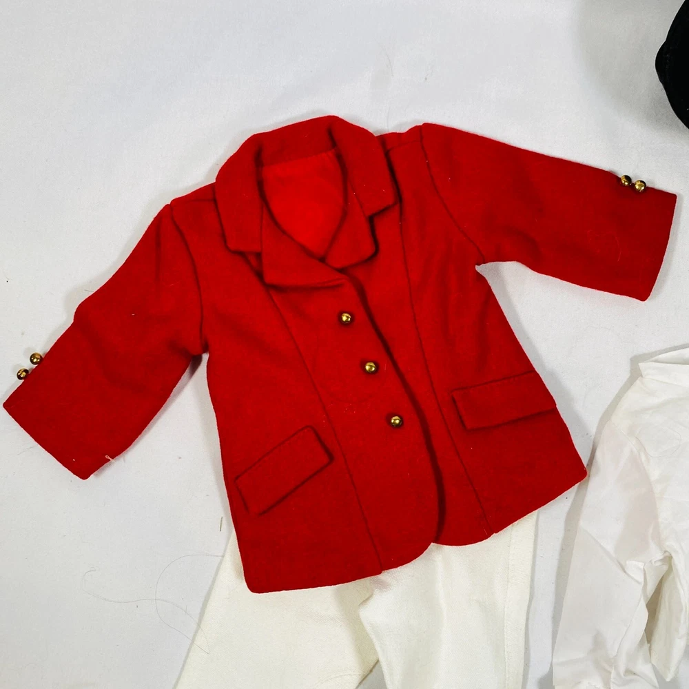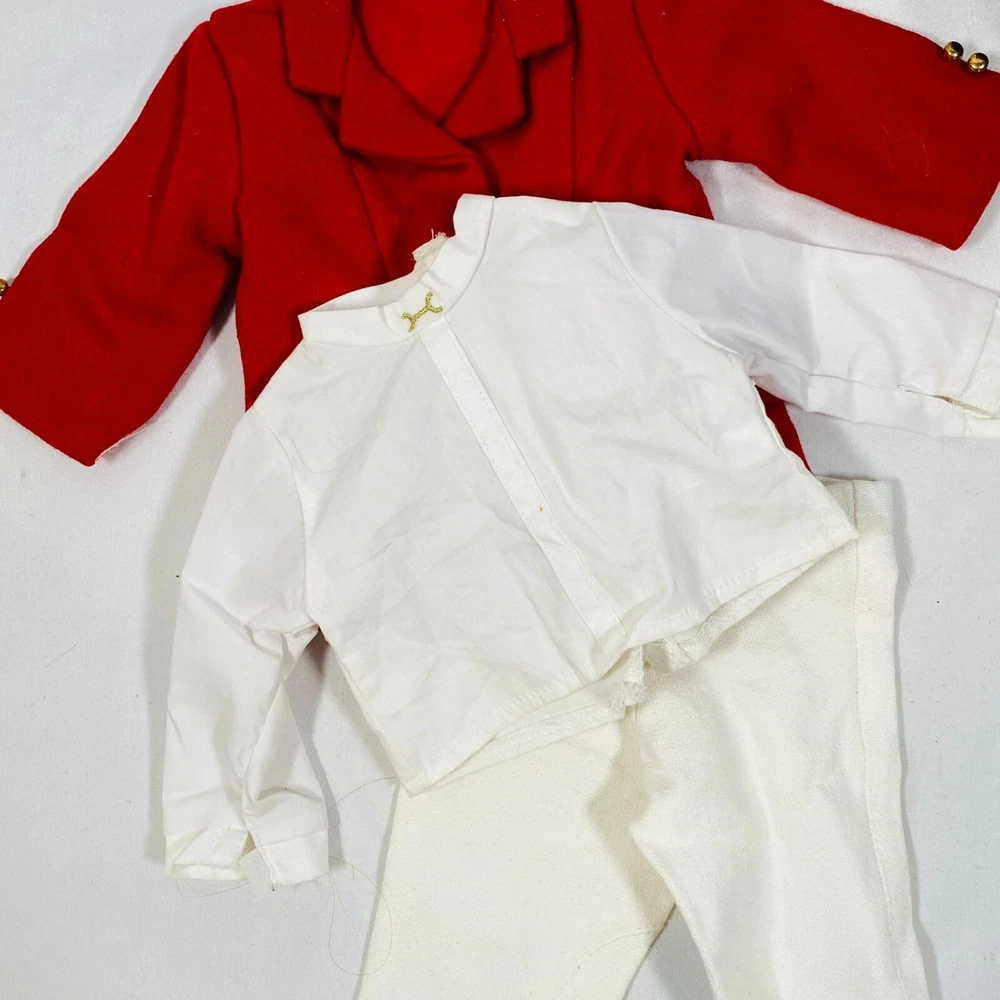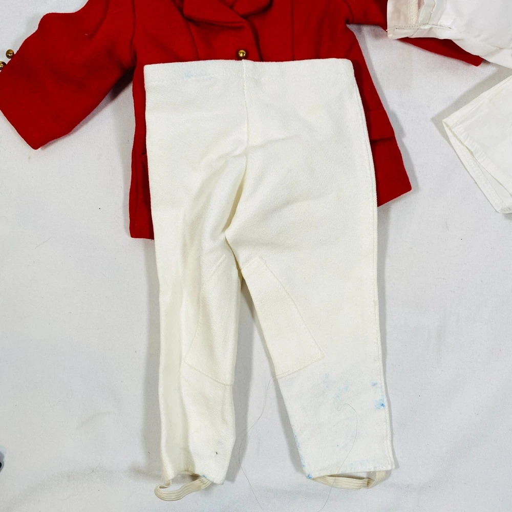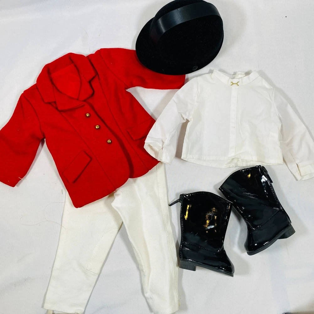 18" American Girl Doll 2004 JLY "Equestrian Outfit", Complete Set. Includes Red Riding Jacket, White Blouse, White Breeches/Pants, Black Riding Helmet, and Tall Patent Leather Boots. In gently played with condition, only flaws noted are one tiny mark on blouse and some kind of blue smudges on pants, both pictured, and may wash out. Please see all pictures for exact cosmetic condition and other details, and ask any questions before purchasing. We are a husband and wife team with a growing family, and greatly appreciate your support of our small business. Please browse our eBay store for a variety of other American Girl items. We hope you enjoy this set!