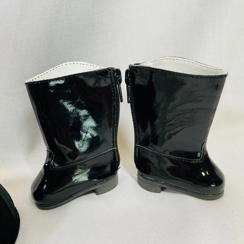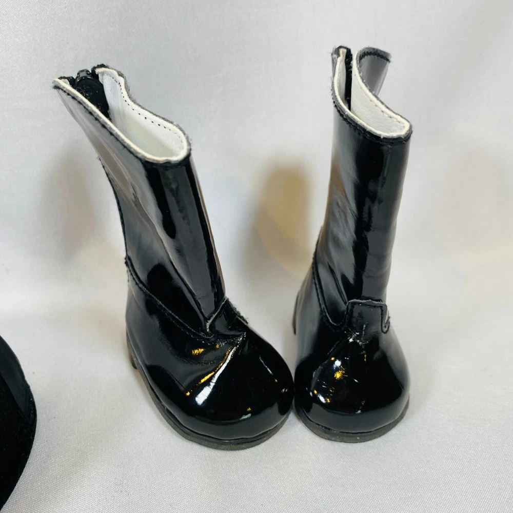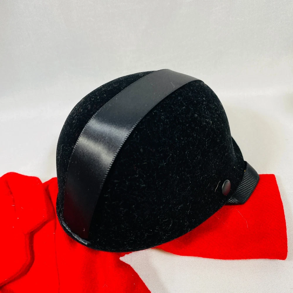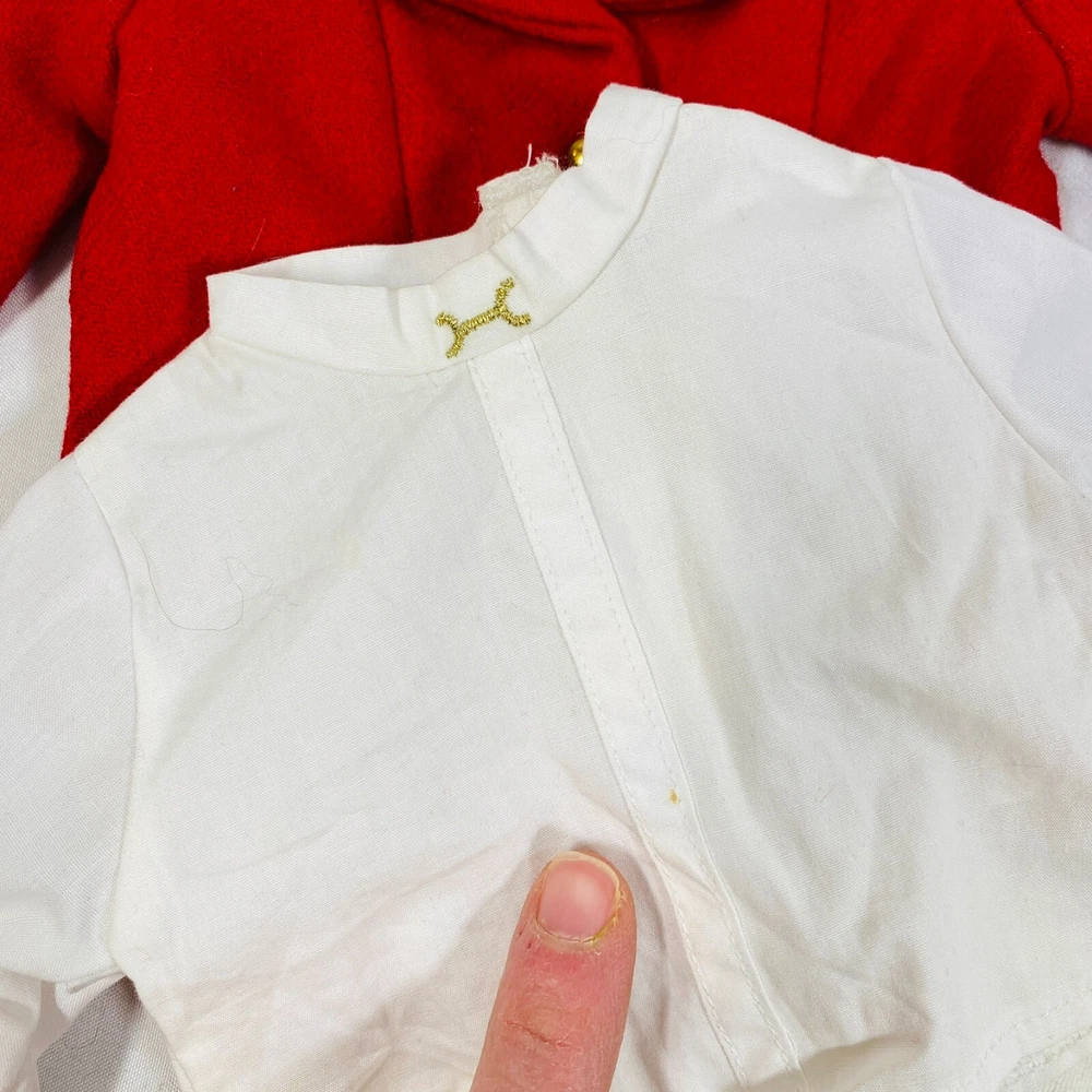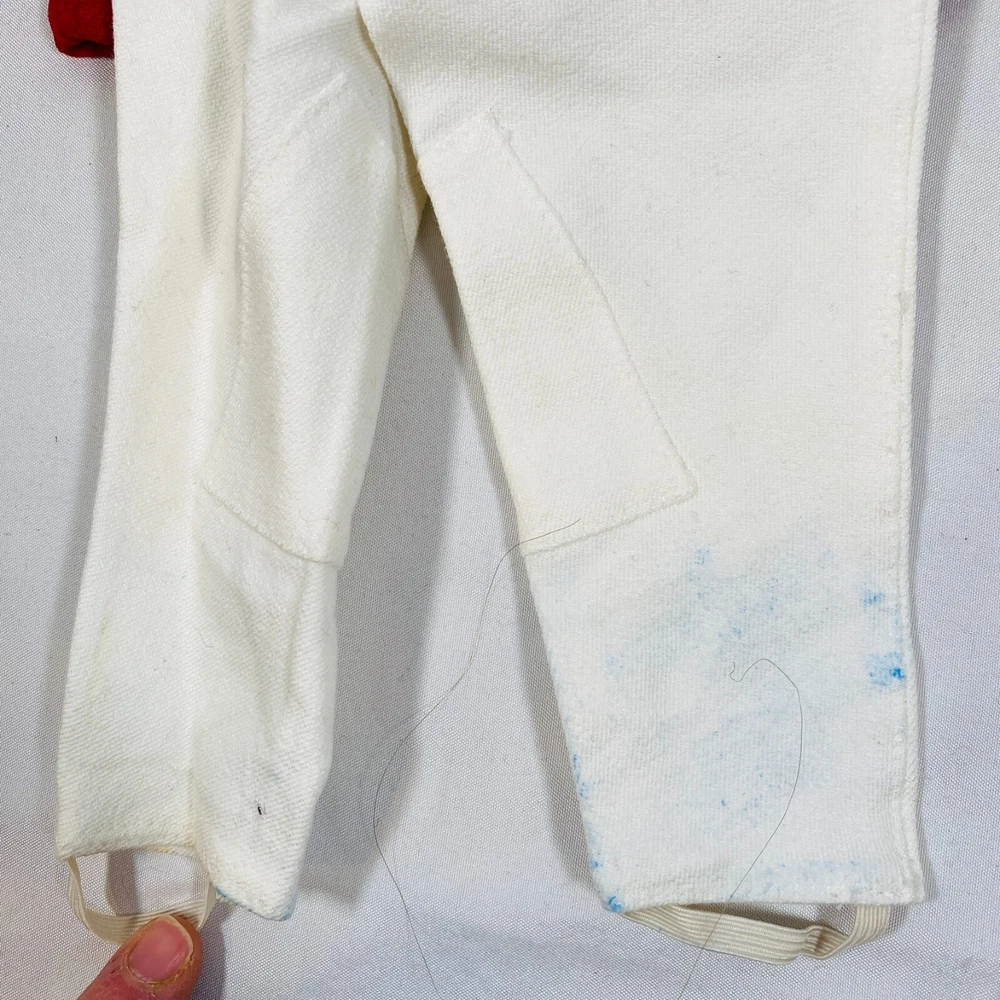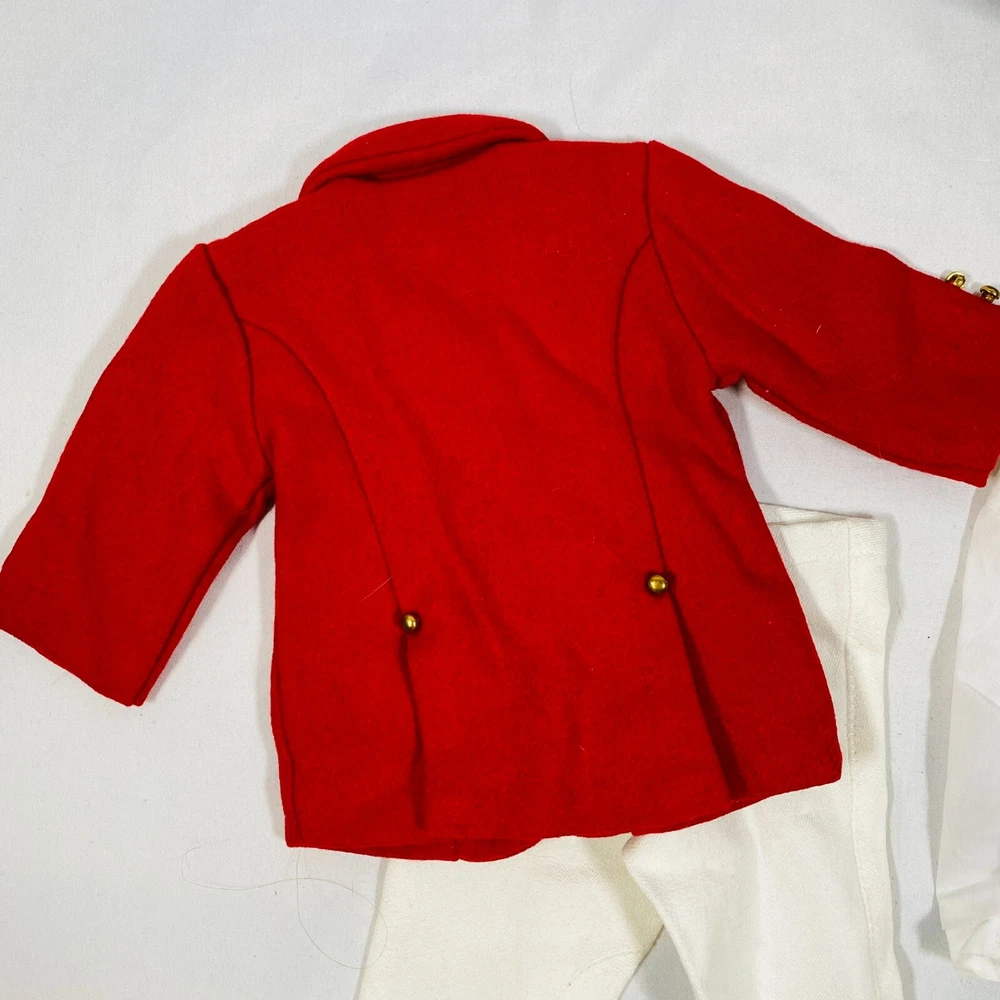 18" American Girl Doll 2004 JLY "Equestrian Outfit", Complete Set. Includes Red Riding Jacket, White Blouse, White Breeches/Pants, Black Riding Helmet, and Tall Patent Leather Boots. In gently played with condition, only flaws noted are one tiny mark on blouse and some kind of blue smudges on pants, both pictured, and may wash out. Please see all pictures for exact cosmetic condition and other details, and ask any questions before purchasing. We are a husband and wife team with a growing family, and greatly appreciate your support of our small business. Please browse our eBay store for a variety of other American Girl items. We hope you enjoy this set!