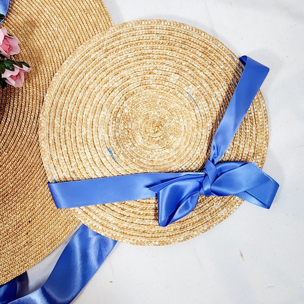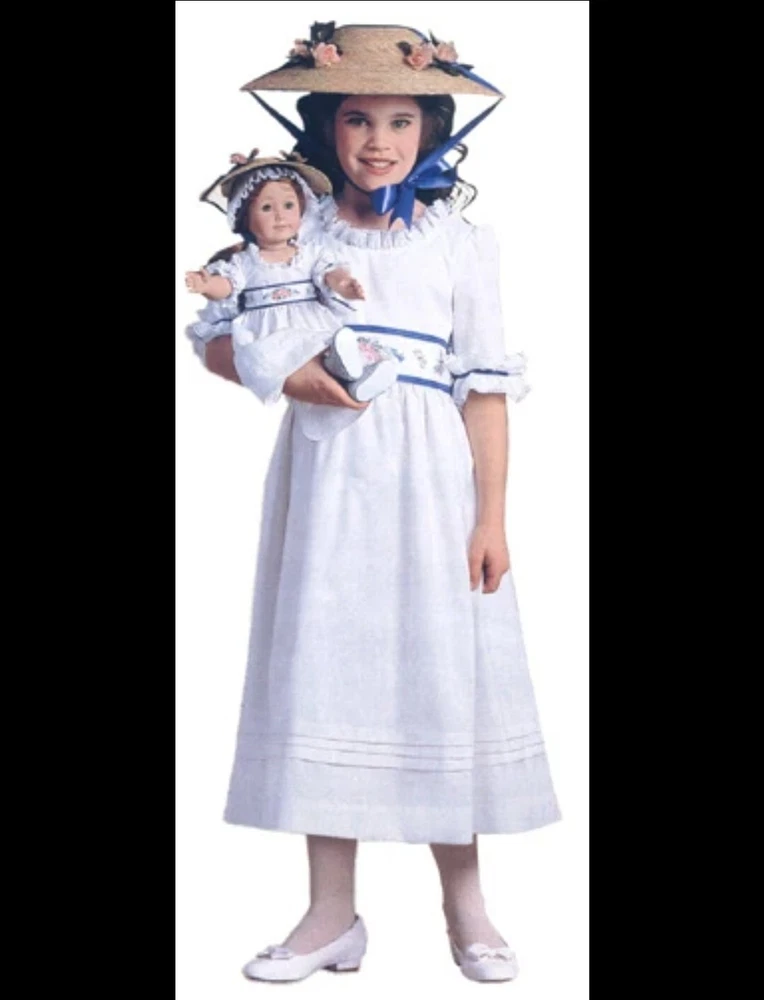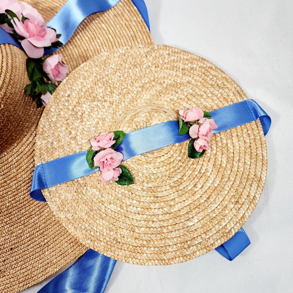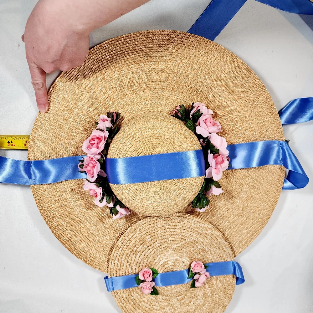 The American Girl Collection - Matching Straw Hats for Felicity's Summer Gown Outfit. Set includes 1 Hat Sized for 18" Dolls and 1 Child-Sized Hat. These are from the Pleasant Company era of American Girl, and definitely genuine. The Girl-Sized one is from the "Dress Like Your Doll" Line, which was phased out around 2000. Extremely rare and hard to find. Hats are both Rose-Trimmed, Wide-Brimmed, Straw Hats, and tie on with blue satin ribbons. Ribbons are stitched along edges of hats to keep them from slipping around. Set is in excellent condition, may have a tiny flaw in the weaving here and there but nothing noticeable. Ribbons in both hats are in great shape, as are the flowers. I think the hats are fairly flexible in sizing and could likely fit a girl or adult, depending on how you want them to fit and the size of your head, of course. Measurements of the girl-sized hat are as follows: 15 3/4" brim edge to edge, 6" diameter of hat inner crown Please see all pictures for exact cosmetic condition and other details, as they are part of the description as well, and ask any questions before purchasing. We are a husband and wife team with a growing family, and greatly appreciate your support of our small business. Please browse our eBay store for a variety of other American Girl items. We hope you enjoy this set!