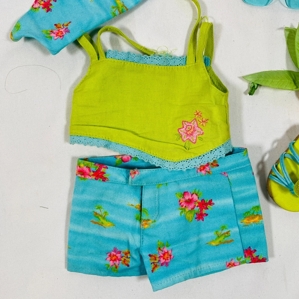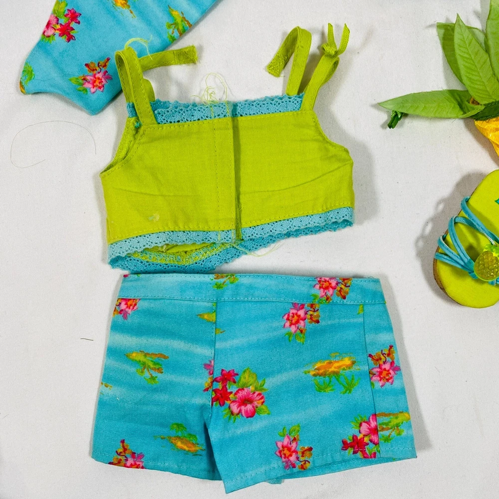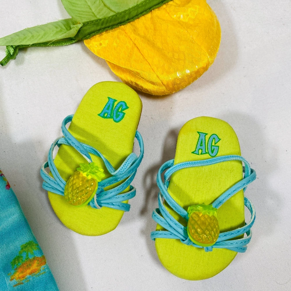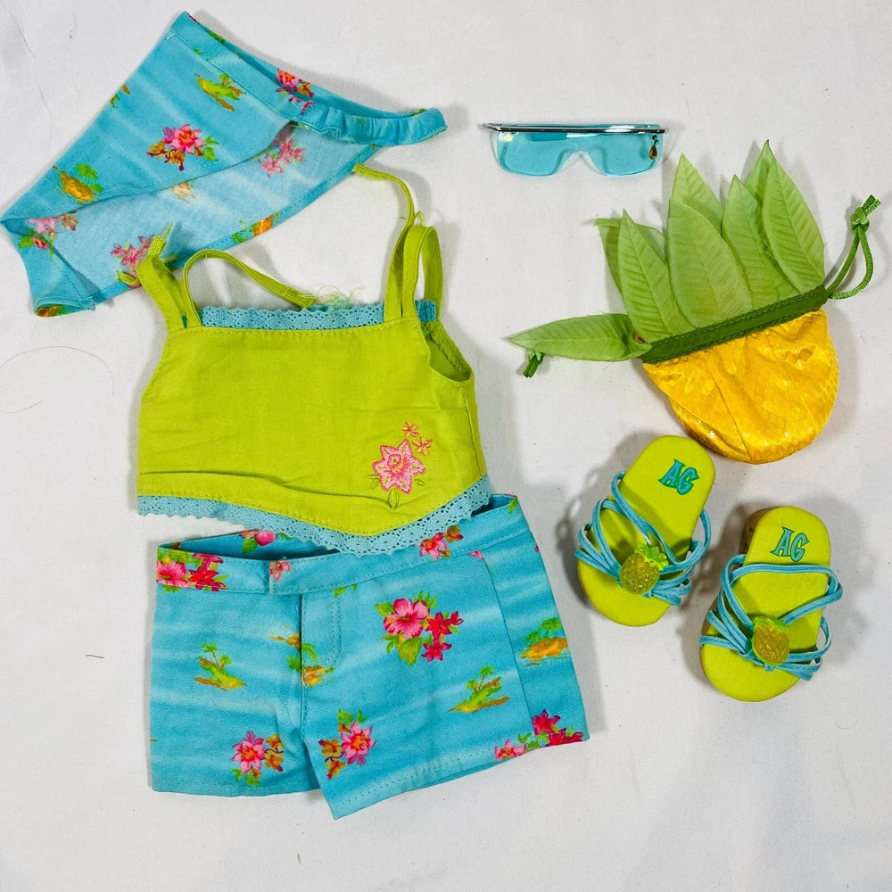 18" American Girl Doll 2004 JLY "Tropical Breezes Outfit", Complete Set. Includes Top, Shorts, Bandana, Glasses, Sandals, and Pineapple Bag. In gently played with condition, only tlaw noted is one tiny mark on top as pictured. Please see all pictures for exact cosmetic condition and other details, and ask any questions before purchasing. We are a husband and wife team with a growing family, and greatly appreciate your support of our small business. Please browse our eBay store for a variety of other American Girl items. We hope you enjoy this set!