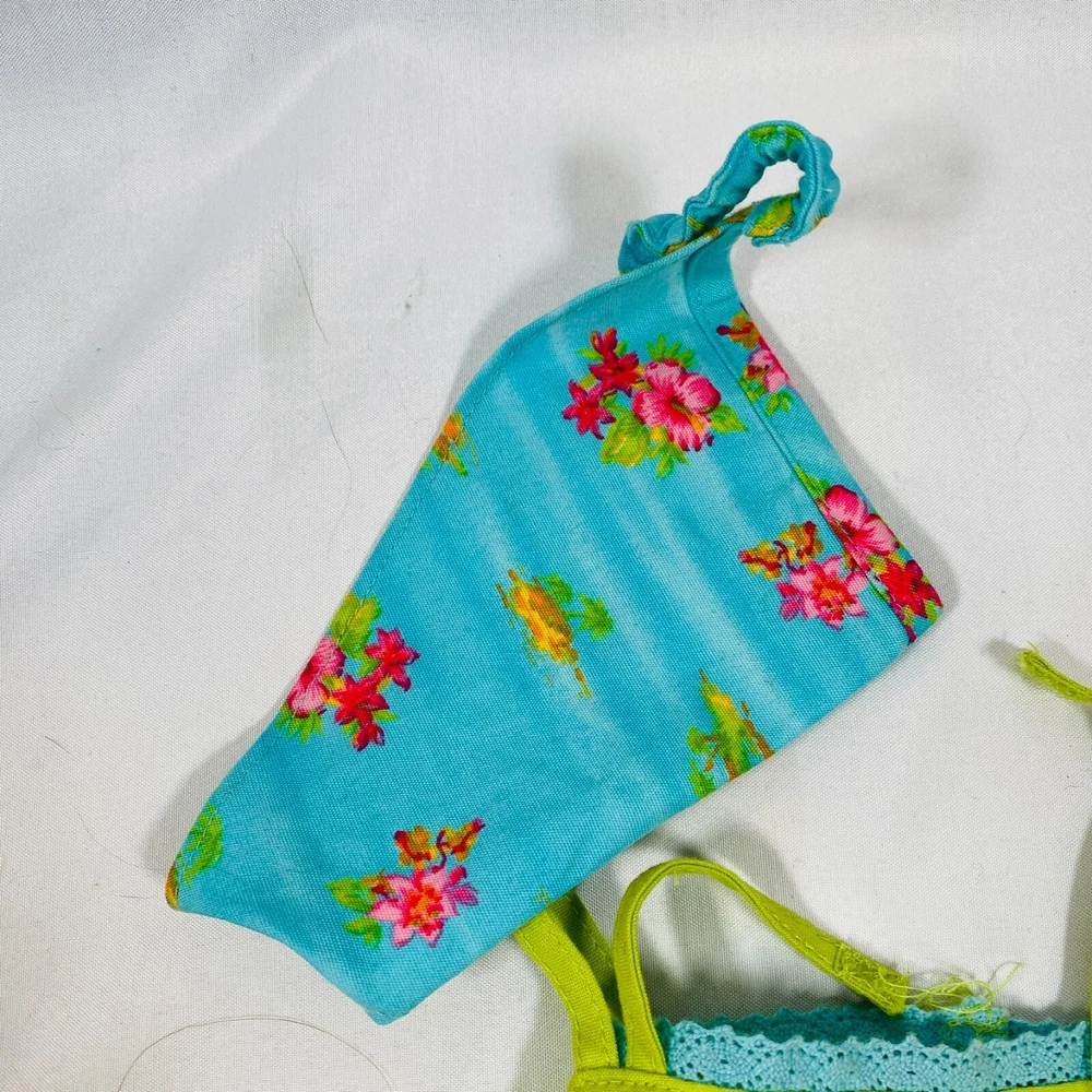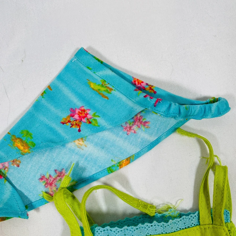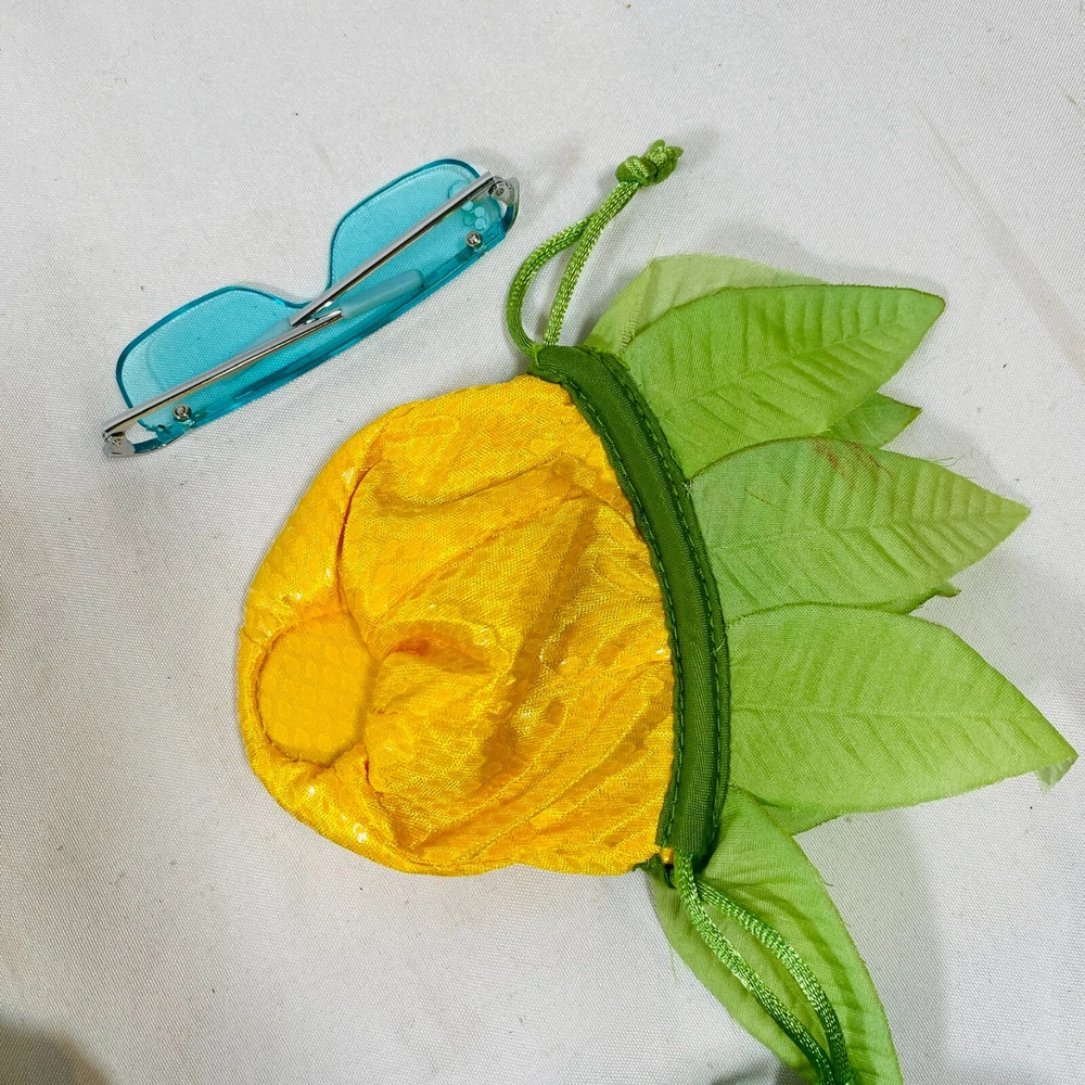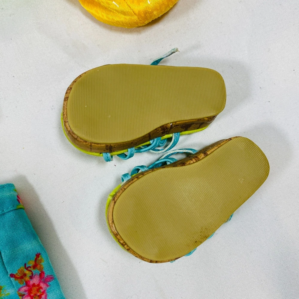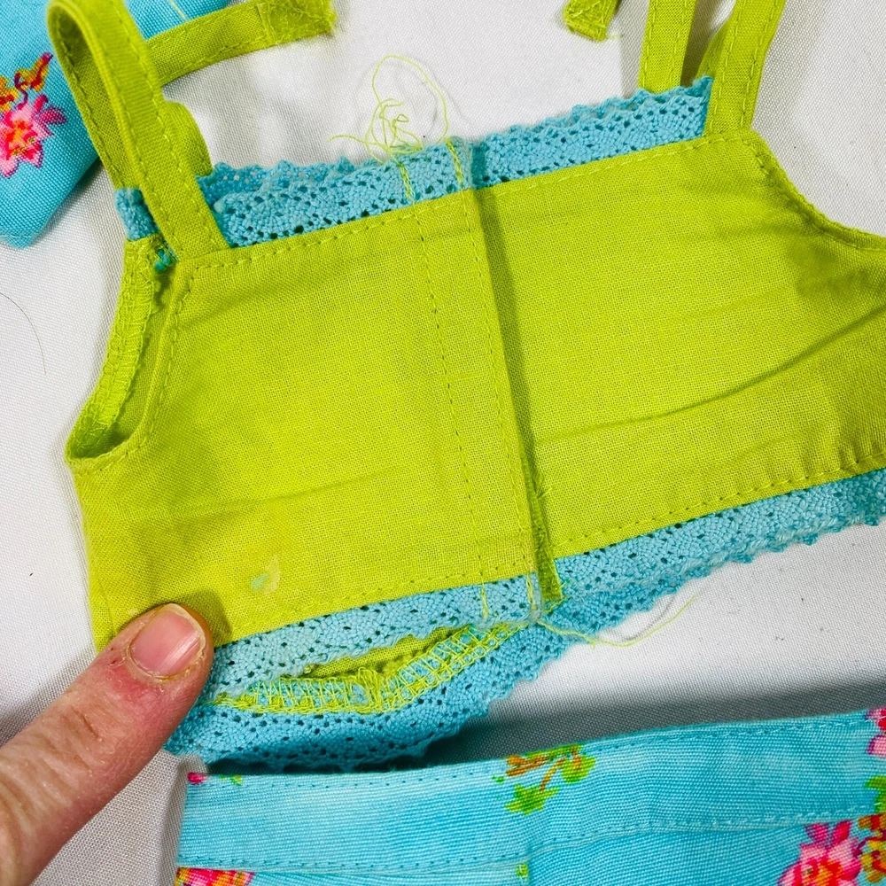 18" American Girl Doll 2004 JLY "Tropical Breezes Outfit", Complete Set. Includes Top, Shorts, Bandana, Glasses, Sandals, and Pineapple Bag. In gently played with condition, only tlaw noted is one tiny mark on top as pictured. Please see all pictures for exact cosmetic condition and other details, and ask any questions before purchasing. We are a husband and wife team with a growing family, and greatly appreciate your support of our small business. Please browse our eBay store for a variety of other American Girl items. We hope you enjoy this set!
