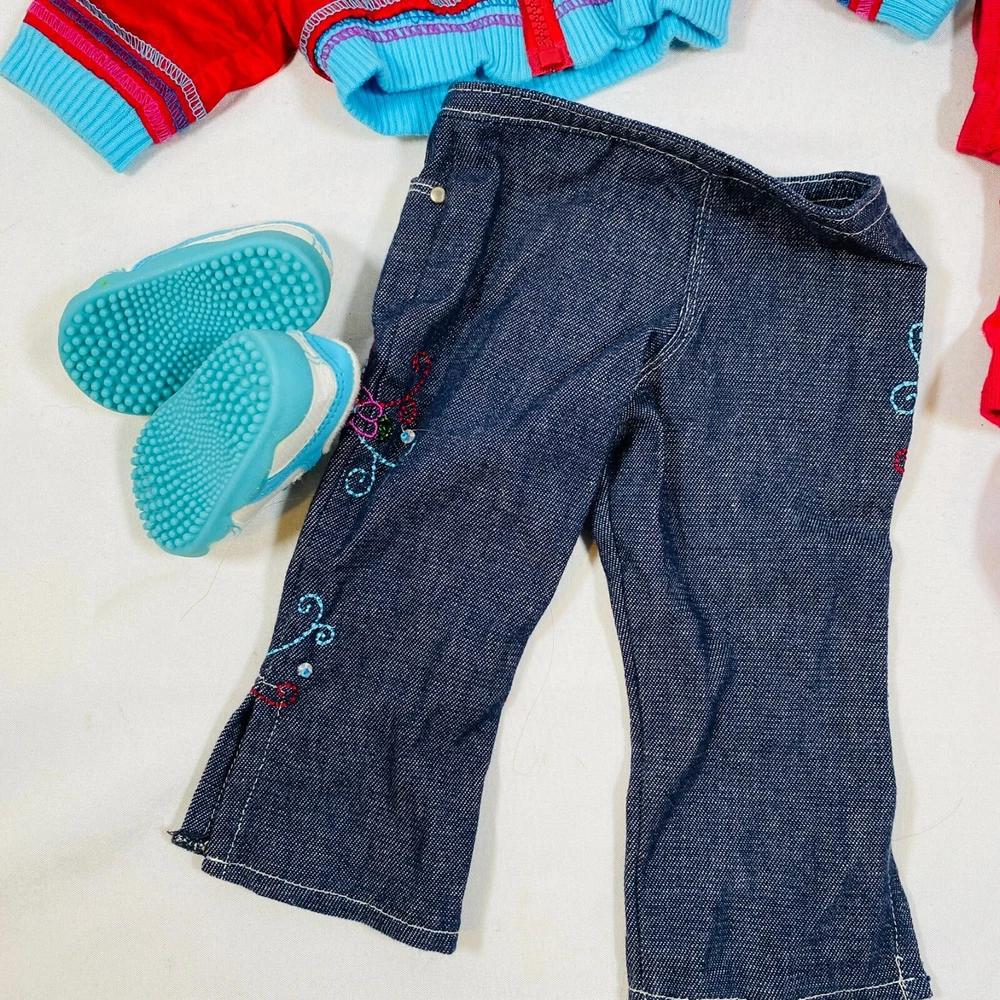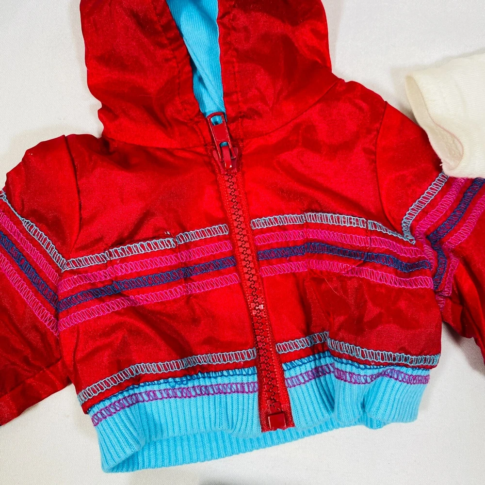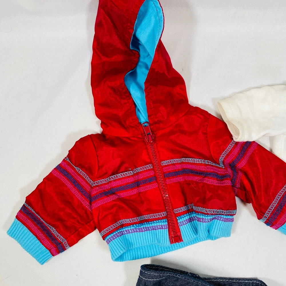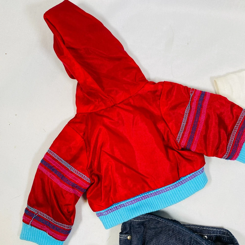 18" American Girl Doll Just Like You "Ready For Fun" Meet Outfit: Red Jacket, White Top, Embroidered Jeans, Magenta Underwear, Tennis Shoes. Just missing the socks. Also includes a bonus American Girl Place Chicago Red T-Shirt. All in gently played with condition, main flaw noted is some smudging on white shirt. Please see all pictures for exact cosmetic condition and other details, and ask any questions before purchasing. We are a husband and wife team with a growing family, and greatly appreciate your support of our small business. Please browse our eBay store for a variety of other American Girl items. We hope you enjoy this set!