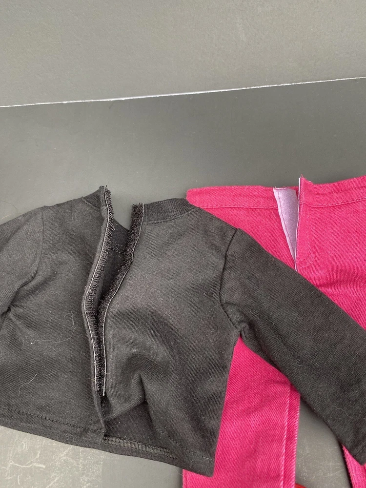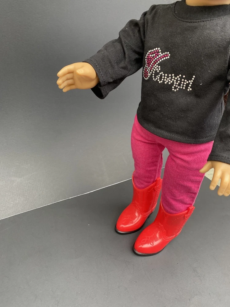 18 Inch Doll Clothes American Girl Our Generation Red Boots Pink Pants Cowgirl. Three piece outfit long sleeve shirt “Cowgirl” in rhinestones, stretched jeans and red cowgirl boots. Shirt and pants are unbranded. Funrise boots. Doll NOT included. Ships USPS ground shipping