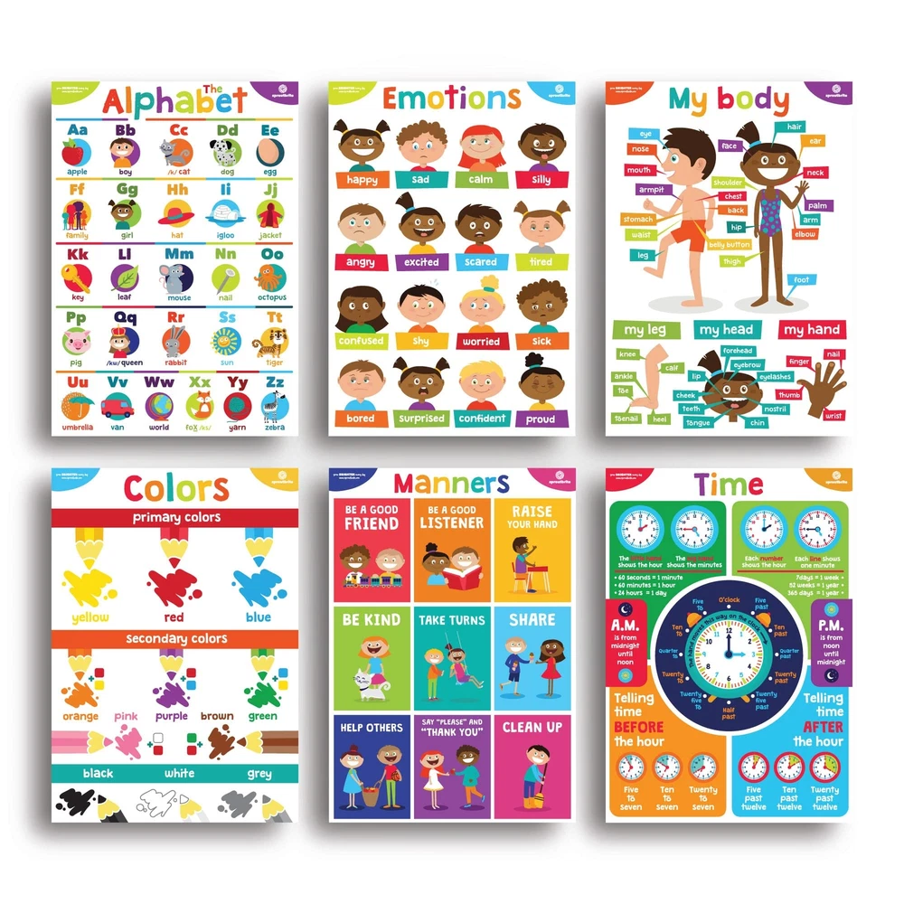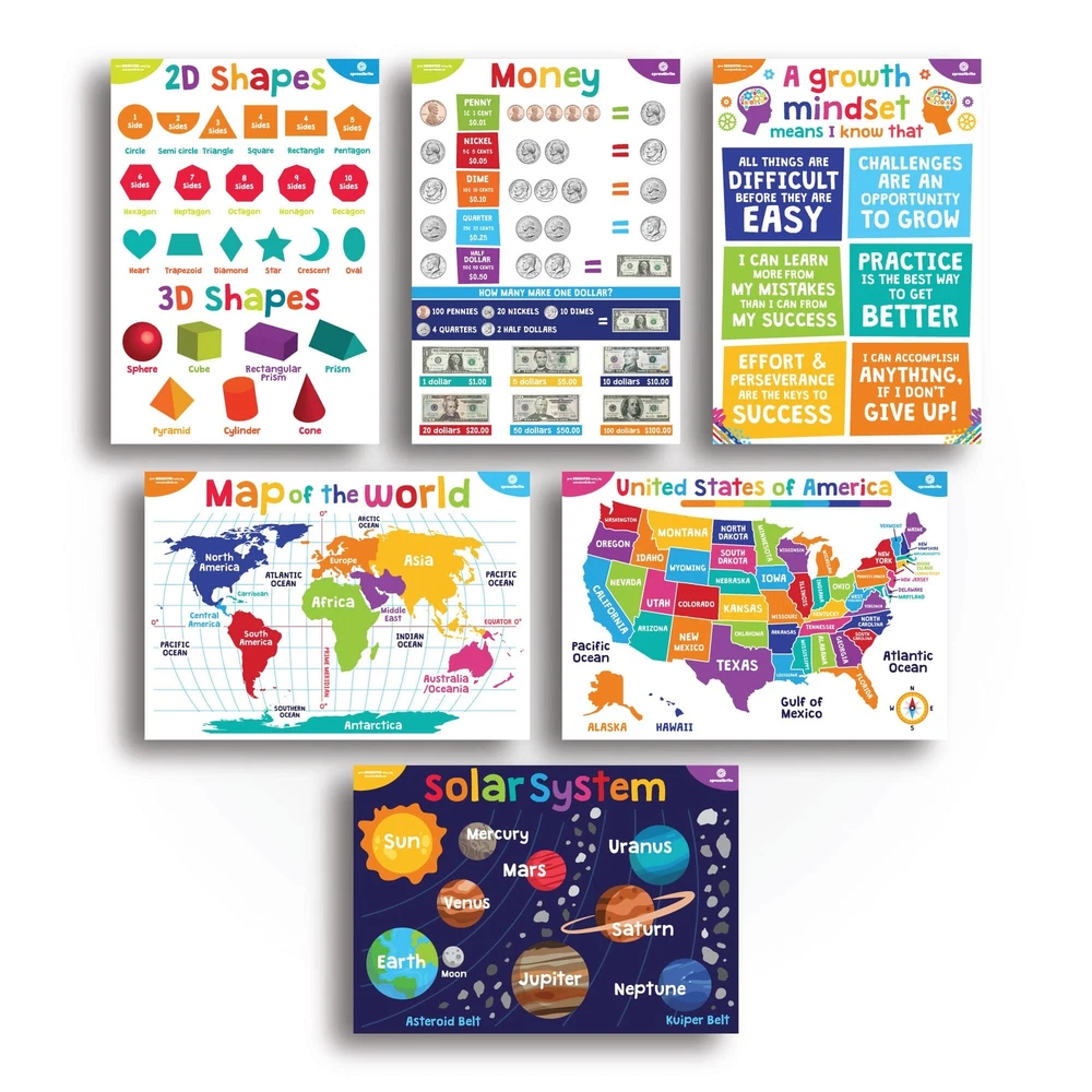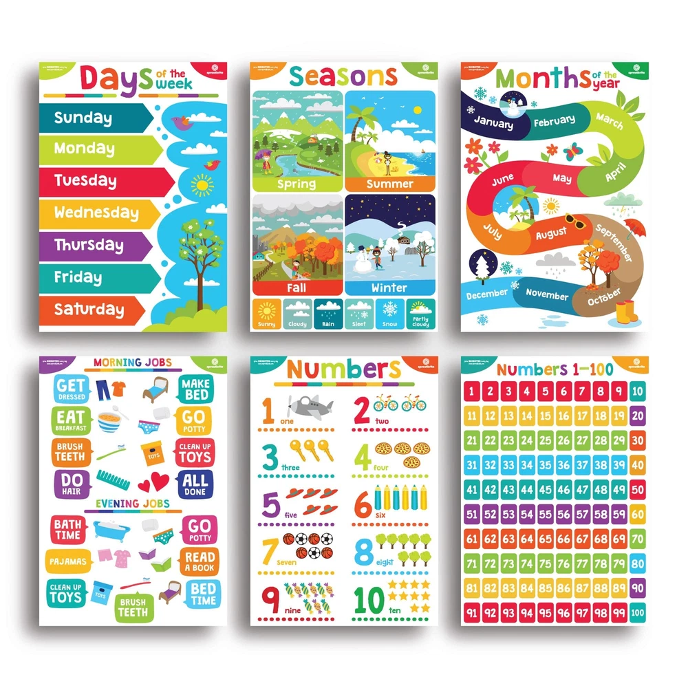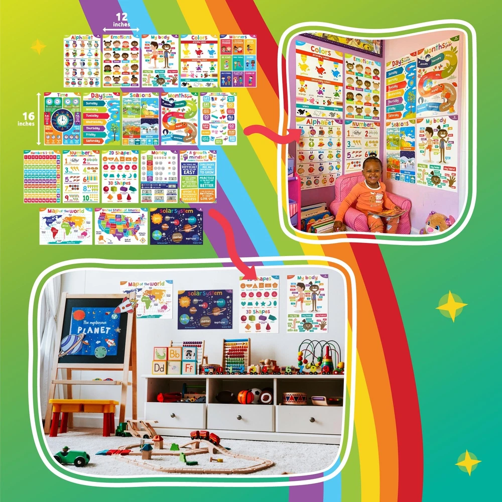 Our educational charts and posters collection consists of 17 12x16 inch preschool posters that are the perfect companion to books & flashcard activity for a hands on way to teach language, reading, speaking skills & more. Perfect for babies to 4th grade! They also work well for 2nd grade posters for classroom They are great for online distance learning or school preschool learning posters. Whether you are a longtime educator, first time homeschooling parents or anyone in between, you will love our home & classroom posters elementary set. Our school décor posters make learning fun & interactive! Our educational posters for kindergarten set includes an abc poster board, days of the week, months, weather, geometric shapes, numbers, counting, basic colors, body anatomy, telling time and emotions. Our classroom decorations elementary set is handcrafted using only high quality materials. They are great versatile educational posters for 1st grade children, and great classroom supplies for teachers elementary posters. Each classroom art poster is designed with attention to detail. Super easy to put up with glue point dots, fridge magnets, or hanging up at circle time, our educational posters for preschoolers make any space perfect for learning. Transform your children's room into an inviting and dynamic settings with vivid, colorful educational posters for toddlers ages 1-3 by . Premium product printed on 110-lb. Cardstock Paper Large Dimensions: 12” x 16” (Each) These eye-catching posters come both laminated or non laminated and in bright or neutral color schemes. Supports Pre-K, Preschool and Kindergarten - They are a great way to teach and reinforce essential basic skills. The package includes 18 posters dedicated to the alphabet, numbers 1-10, numbers 1-100, shapes, world and United States map, solar system, emotions, the body, colors, manners, time, days of the week, seasons, montns, morning jobs and evening jobs to teach discipline, money, grown mindset and colors,