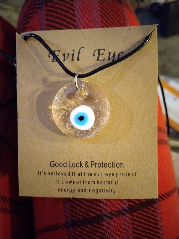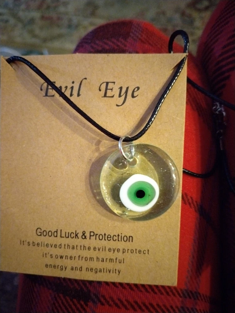 This 18" Evil Eye pendant necklace features a round charm design made of pink and green Bakelite. The necklace is on a chord with a lobster closure. Perfect for occasions like Mother's Day, Christmas, or birthdays, this unique piece by the brand Evil Eye offers luck and protection with its eye-catching colors and adjustable length.