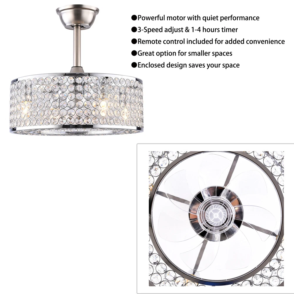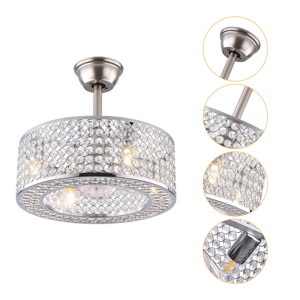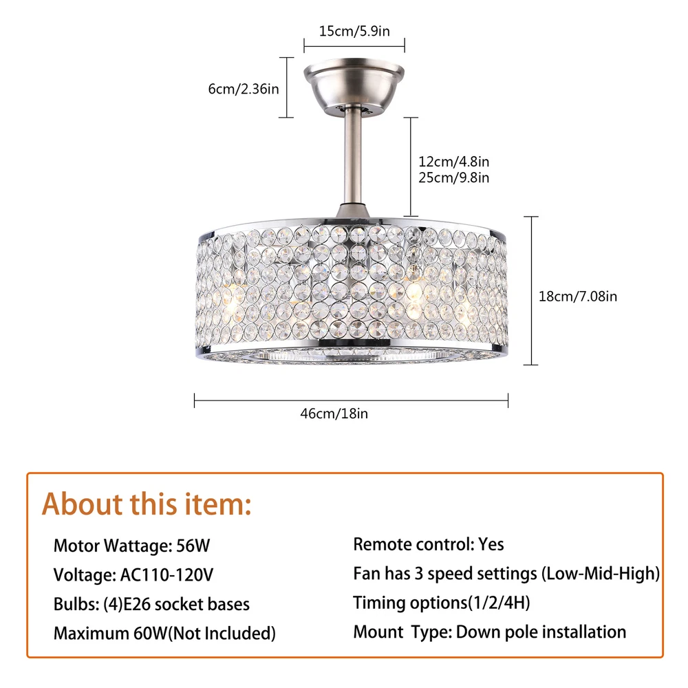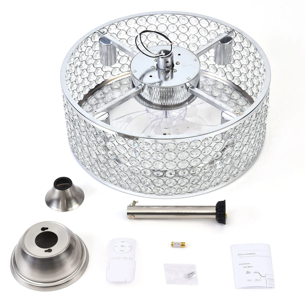 18"Ceiling Fan Lamp Crystal LED Caged Flush Mount Chandelier Bladeless w/ Remote 18'' Cage Ceiling Fan Light Crystal LampShade Fan Chandiler W/ Remote ✦ About this item 【Unique and safe novel design】 Crystal shade, Unique to say the least, thecomposition of cage ceiling fan is quite striking, combining modernity and elegance in one. The exterior crystal lampshade a stylish theme while protecting the light bulb and the central fan blade. It's perfect for a loft or office space, hang in your eating area and enjoy the cool breeze. Light & Fan—This ceiling fan with is designed for who need marvelous update for your house. Suit for ceiling from 7.5-11.5 feet, and room from 8-15㎡like children room, bedroom, kitchen island or dinning room. Easy to install: hard wire. perfect design to illuminate your space, whether it is a kitchen island, dining room, bedroom, foyer or any other place. 【Remote Control】 The Industrial ceiling fan lights fixture with 3-speed adjustment (low/medium/high) and 3 fan timing options (1/2/4H) sleep shutdown about multi-function remote control. The fan and lights can be controlled separately, which can control your ceiling fan quickly and easily!(max distance of 20 meters). 3 Gear Wind—The enclosed ceiling fan speed vary from soft to cool, match daily needs; ABS fan blades, durable, lightweight and easy to clean. Timing Function—Smart timing set to automatically POWER OFF light and fan after you fall asleep. Mute Motor—Indoor/Outdoor ceiling fan is equipped with a whisper wind motor which makes no noise, stay away from any noise interference while providing a quiet and comfortable environment. ✦ Dimensions Fixture Height: 7.08" (18 cm) Fixture Width: 18" (46cm) ✦Bulb Information Bulb requirements: use (4) E26bulbs, maximum 60watts, options include incandescent, fluorescent, LED, halogen, etc. (bulbs are not included) Wattage: Max 60W Voltage: AC110-120V Remote control: yes ✦Material and Colour Material: Nickel-plated metal +crystal ✦ Package Included 1 *Fan Light (Bulbs Not Included) 2*Down rods (12CM & 25CM) 1 * Accessories package 1 * User Manual Easy to install: surface mounted. Products include English manuals, remote control and installation instructions, with the provided bracket, providing easier installation and detailed installation instructions. Applicable scenarios: The chandelier is suitable for home and commercial spaces,such as living room, dining room, kitchen island, bedroom, foyer, farmhouse , bar, restaurant, gallery, exhibition room, hotel, coffee shop, office。 ✦Suggestion: 1. For a safe and secure installation, please ensure that the electrical box to which this fixture will be mounted is properly attached to a structural member of the building. 2. All wires are connected. When unpacking, be careful not to pull with wires as a bad connection may result. 3. Do not connect electricity until your fixture is fully assembled. Payment Delivery details Terms of sales About us Contact us Payment We accept ebay payment 。 Fees such as import duties, taxes are not included in the item price or shipping costs. These charges are the buyer's responsibility. Delivery details Shipping: 2-9 working days to: USA Terms of sales We maintain high standards of excellence and strive for hundred percent customer satisfaction. Feedback is very important to us. We hope that you contact us immediately before you give neutral or negative feedback, so that we can address your concerns. It is impossible to address issues if we do not know about them! About us Your satis faction is our ultimate goal. We work hard to earn your trust and future business. Our certified technicians have tested each item before shipping. The unit comes with 1 year limited warranty on all manufacturing defects. a) If you receive a defective item, you may return it or ask for a discount. Please contact us within 14 days after you receive the package. b) What you returned must be intact and in its original packaging as re? u. Customer is responsible for shipping costs of the returned item. c) We will cover the cost of shipping back t with the shipping rate indicated in the registration page. We will send you a new unit or refund the full payment you paid. Thank you. Contact us Business Hour Business Hour: Monday To Friday: 8:30 AM to 5:00 PM (Beijing China time) Due to time zones, our reply to your questions may not be immediately. But within above working time, we will reply your email within 24 hours. If it's non-workdays, please kindly be patient and wait till Monday. Please contact us with ebay message. Please feel free to contact us if you have any questions. Monday To Friday: 8:30 AM to 5:00 PM (Beijing China time) Due to time zones, our reply to your questions may not be immediately. But within above working time, we will reply your email within 24 hours. If it's non-workdays, please kindly be patient and wait till Monday. Please contact us with ebay message. Please feel free to contact us if you have any questions. On Mar 2, 2025 at 18:26:30 PST, seller added the following information: