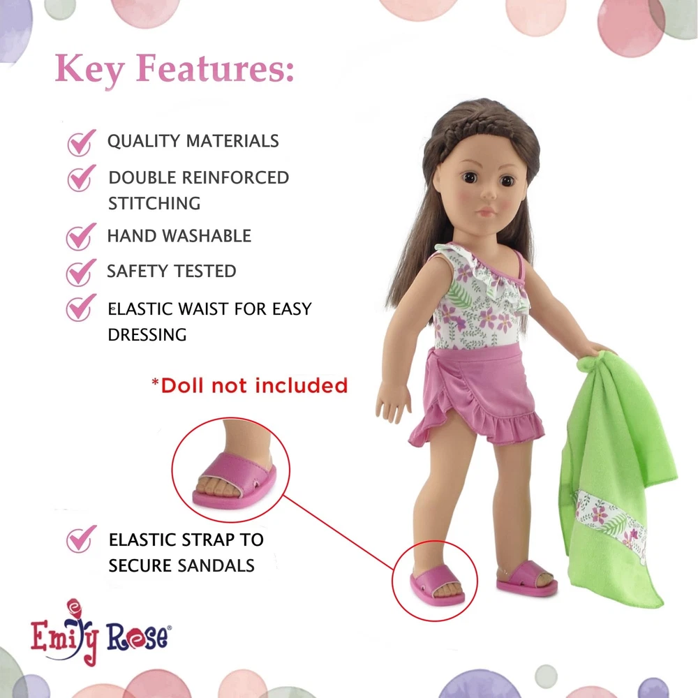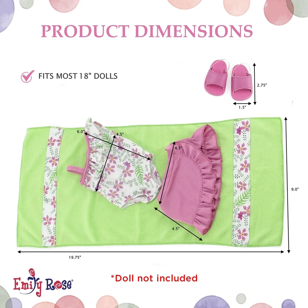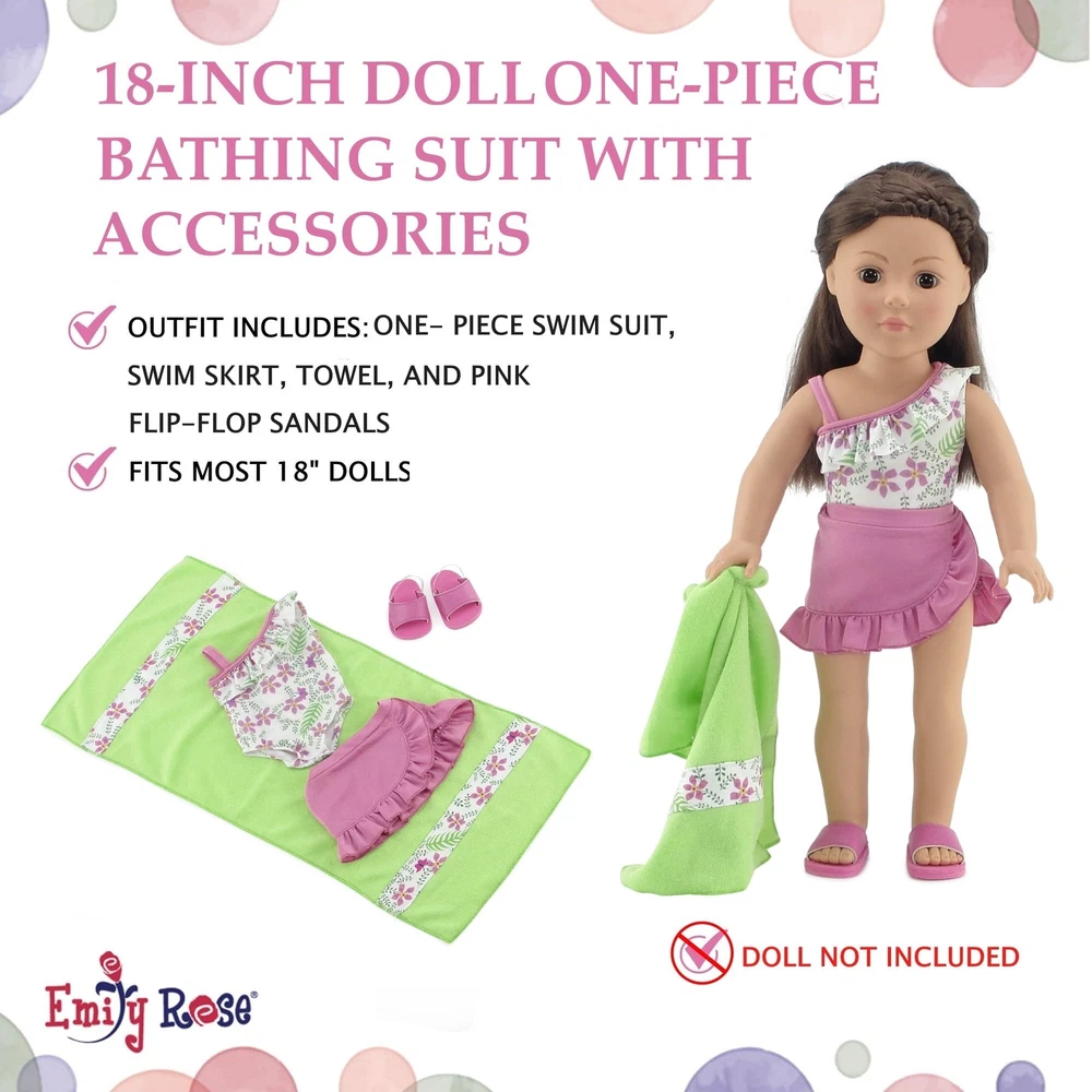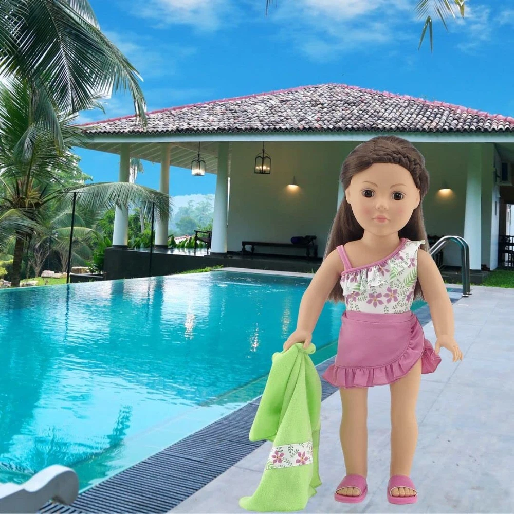 FITS DOLL SIZE: Made to fit most 18 inch dolls. FITS DOLL SIZE: Made to fit most soft bodied 18 Inch dolls similar to American Girl, Journey Girls, Our Generation, Madame Alexander, My Life As, etc. FEATURE DESCRIPTION: Pretty 18" doll swimsuit set includes a bright green beach towel, ruffled skirt coverup, and perfect pink beach sandals. What a VALUE! KID SAFE: All products have passed required CPSIA and ASTM safety testing, and are fully certified. Parents can have peace of mind knowing all our products are phthalate and lead free. UNIQUE QUALITY DESIGNS: Designed in the USA by , proudly located in Dayton, Ohio! Unique designs, all with durable reinforced stitching, using high quality fabrics. High quality construction for endless hours of fun! Hand washable.