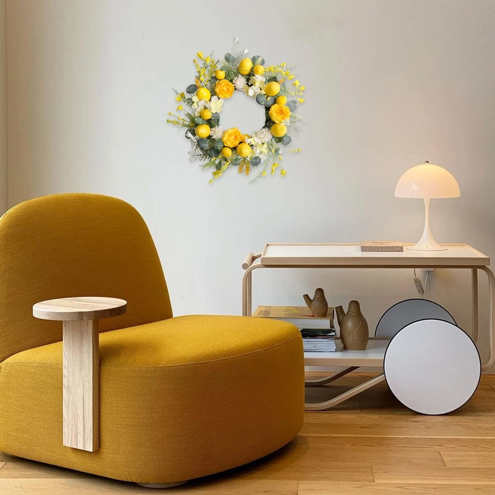 18 Inch Summer Yellow Lemon Roses Wreath for Front Door, Eucalyptus Leaves with Hydrangea Forsythia Flowers Wreath for Indoor and Outdoor, Rustic Farmhouse Door for Home Decor Product Details Color: Yellow Brand: Floribus Material: Artificial Flowers, Foliage, Plastic/Wire Base Shape: Round Item Weight: 0.8 Kilograms Product Dimensions: 4"D x 18"W x 18"H Manufacturer: Floribus Color: Yellow Brand: Floribus Material: Artificial Flowers, Foliage, Plastic/Wire Base Shape: Round Item Weight: 0.8 Kilograms Product Dimensions: 4"D x 18"W x 18"H Manufacturer: Floribus Item Weight: 1.76 pounds Item model number: 2414 Date First Available: November 14, 2024 [Summer Yellow Lemon Door Wreath] Summer is wet and hot, some fresh and cool decorations will add some points for your live place, summer yellow lemon wreath will be a good choice for your doors, the fresh yellow color and the fresh lemon together with well opening yellow roses, this summer will be beautiful and fresh. [18 Inch Front Door Wreath] The outer diameter of this summer lemon wreath measures 18 Inch, this size wreath has a really wide use, such as hanging on your front door, porch door, hanging on your yards to appeal to the season atmosphere, hanging on wall, windows and your home enter place. [Yellow Roses Forsythia Flower Wreath] To appeal to the fresh yellow color, we add two different yellow artificial flowers, one is the romantic yellow roses with ninety percent opening, and the other one is the cute forsythia flowers. [Eucalyptus Leaves Flowers Wreath] The leaves selected for this wreath is extremely strict, we passed some common leaves and we finally selected this cute dollar eucalyptus leaves for this wreath, because the shape of the leave is round and color is fresh and real. [TIPS] 1.Fluff the wreath up before hanging on. 2.This lemon wreath is recommended indoor use, if use outside, please avoid directly exposed to the strong sunlight to protect the wreath.