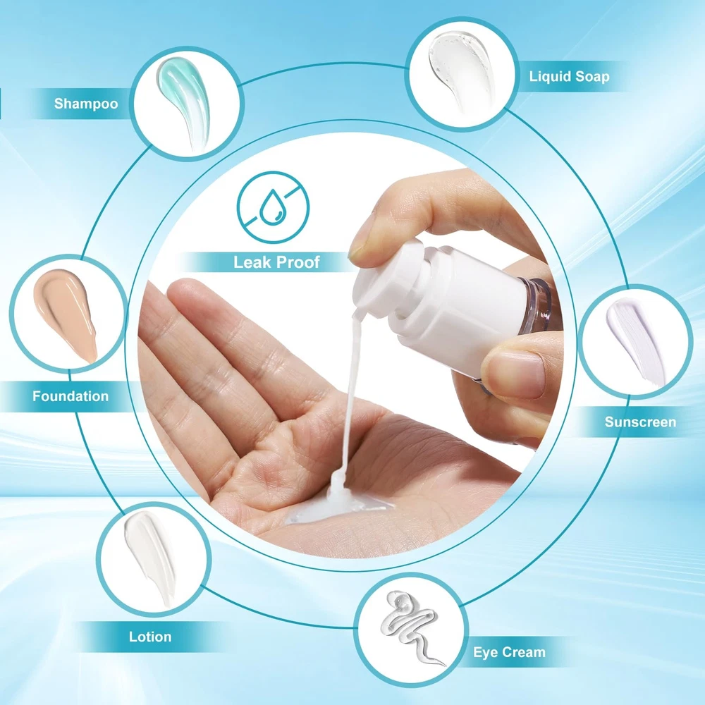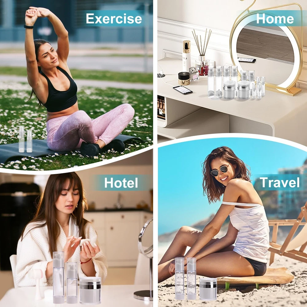 1. Increased product efficiency, as more of the product is dispensed with each use. 2. Reduced risk of contamination, as the product is not exposed to air or other elements. 3. Convenient and easy to use, as the pump mechanism dispenses the perfect amount of product with each use. 4. Improved shelf life. Airless pump Jar are leak proof and help to preserve the product for a longer time as it reduces oxidation and exposure to air, which can cause products to deteriorate faster. 5. Airless pump bottles do not require the use of propellants or additional packaging, making them a more environmentally friendly choice. The use of Airless Pump Jar: 1.Pour in the product you wish to fill. 2.Press to release air until the product is pressed out. If the jar is not completely filled, press repeat several times to expel air. 3. After the product is used up, the vacuum plug will rise to the top. 4. Push the vacuum plug back to the bottom the next time you use it. Warm Tips: 1. Please don't add corrosive or flammable products to these bottles. 2. Please do not overfill the bottle. If the press does not move, it indicates excessive filling. 【Refillable Airless Pump Jars】18 Pack reusable airless pump jars: 2pcs cream jars (50ml-1.7 floz), 8pcs bottles (2×50ml-1.7floz + 2×30ml-1floz + 2×10ml-0.34floz+ 2×5ml-0.7floz) , 2pcs spray bottles(50ml-1.7 floz), 2pcs funnels, 2pcs labels , 2pcs spatulas. 【Meet Multiple Needs】Multiple sizes, lightweight and portable, suitable for long-term or short-term travel, home or outing use. 【Finer Design & Less Waste】Airless Pump have a best processes, and the narrower vacuum plug can reduce product waste. 【Cleaner & More Convenient】The Airless Pump jar keeping your products clean and hygienic. Dispense the perfect amount of product per use. 【60 DAY Warranty】provides a 60 days quality assurance. Non human quality issues, please contact us within 60 days.