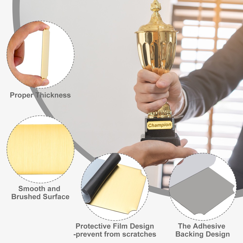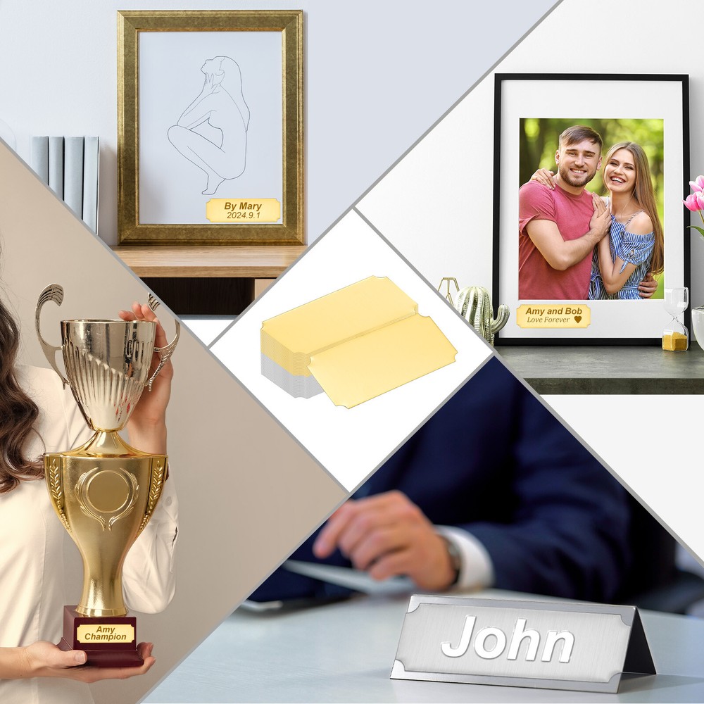Document Our engraved nameplates are perfect for mounting on plaques, picture frames, sweaters, trophies, bags, display boxes, flag cases, and anything else.SpecificationMaterial: Stainless SteelColor: Silver/GoldSize: 10.2 x 5.1 cm/4 x 2 Inch(L*W)Thickness: 0.4 mm/0.02 InchPacking List: 18 Pcs x Engraved NameplateAdvantageOur engraved nameplates are made of brushed stainless steel which is durable, stable, not easy to fade, rust, or break, and can be used for a long time. With a smooth surface, it will not scratch your skin.The right thickness makes the plate stronger and allows for deeper engraving. These elegant nameplates have a beautiful luster and a simple design. Suitable for various crafts to add brilliance.The protective film design can effectively prevent scratches. The adhesive backing design allows you to stick this nameplate anywhere without any tools and it can be firmly on the objects.InstructionPlace a metal workbench block underneath the blank stamping tags for better stamping.NOTE:1. There may be light scratches and blemishes due to shipping, but they can be polished.2. Only for laser engraving, not suitable for mechanical engraving.3. Please remove the protective film before use. 18 Pcs 4" x 2" Engraved Name Plate Picture Frame Label Art Tag, Silver/Gold Our engraved nameplates are perfect for mounting on plaques, picture frames, sweaters, trophies, bags, display boxes, flag cases, and anything else. Specification Material: Stainless Steel Color: Silver/Gold Size: 10.2 x 5.1 cm/4 x 2 Inch(L*W) Thickness: 0.4 mm/0.02 Inch Packing List: 18 Pcs x Engraved Nameplate Advantage Our engraved nameplates are made of brushed stainless steel which is durable, stable, not easy to fade, rust, or break, and can be used for a long time. With a smooth surface, it will not scratch your skin. The right thickness makes the plate stronger and allows for deeper engraving. These elegant nameplates have a beautiful luster and a simple design. Suitable for various crafts to add brilliance. The protective film design can effectively prevent scratches. The adhesive backing design allows you to stick this nameplate anywhere without any tools and it can be firmly on the objects. Instruction Place a metal workbench block underneath the blank stamping tags for better stamping. NOTE: 1. There may be light scratches and blemishes due to shipping, but they can be polished. 2. Only for laser engraving, not suitable for mechanical engraving. 3. Please remove the protective film before use. Hot Item Payment 1.We accept eBay payment . 2.Payment must be received within 7 business days of auction closing. Shipping 1.We ship to your eBay or Paypal address. Please make sure your eBay and Paypal address is correct before you pay. 2.Items will be shipped within 1-3 business day when we received payment. 3.Delivery time depends on destination and other factors. Description Policy 18 Pcs 4" x 2" Engraved Name Plate Picture Frame Label Art Tag, Silver/Gold Our engraved nameplates are perfect for mounting on plaques, picture frames, sweaters, trophies, bags, display boxes, flag cases, and anything else. Specification Material: Stainless Steel Color: Silver/Gold Size: 10.2 x 5.1 cm/4 x 2 Inch(L*W) Thickness: 0.4 mm/0.02 Inch Packing List: 18 Pcs x Engraved Nameplate Advantage Our engraved nameplates are made of brushed stainless steel which is durable, stable, not easy to fade, rust, or break, and can be used for a long time. With a smooth surface, it will not scratch your skin. The right thickness makes the plate stronger and allows for deeper engraving. These elegant nameplates have a beautiful luster and a simple design. Suitable for various crafts to add brilliance. The protective film design can effectively prevent scratches. The adhesive backing design allows you to stick this nameplate anywhere without any tools and it can be firmly on the objects. Instruction Place a metal workbench block underneath the blank stamping tags for better stamping. NOTE: 1. There may be light scratches and blemishes due to shipping, but they can be polished. 2. Only for laser engraving, not suitable for mechanical engraving. 3. Please remove the protective film before use. Hot Item Payment 1.We accept eBay payment . 2.Payment must be received within 7 business days of auction closing. Shipping 1.We ship to your eBay or Paypal address. Please make sure your eBay and Paypal address is correct before you pay. 2.Items will be shipped within 1-3 business day when we received payment. 3.Delivery time depends on destination and other factors.