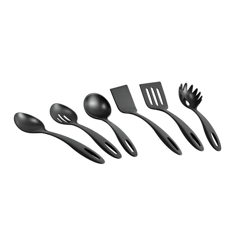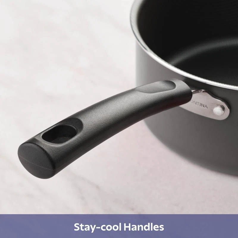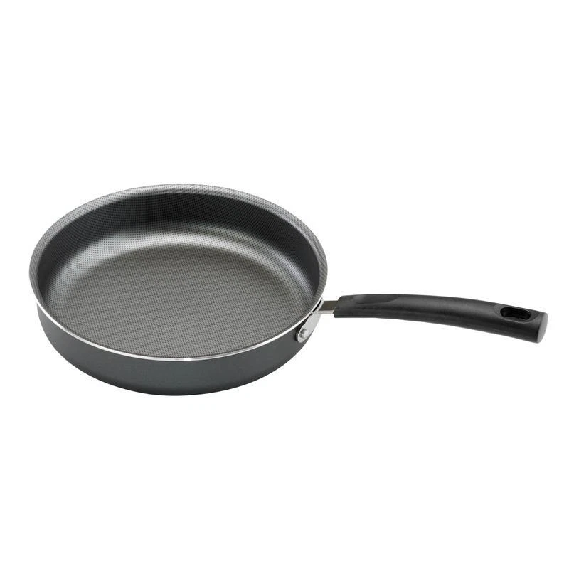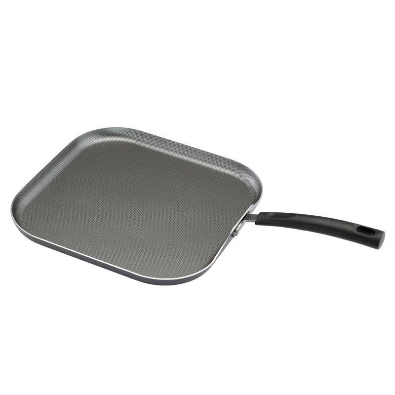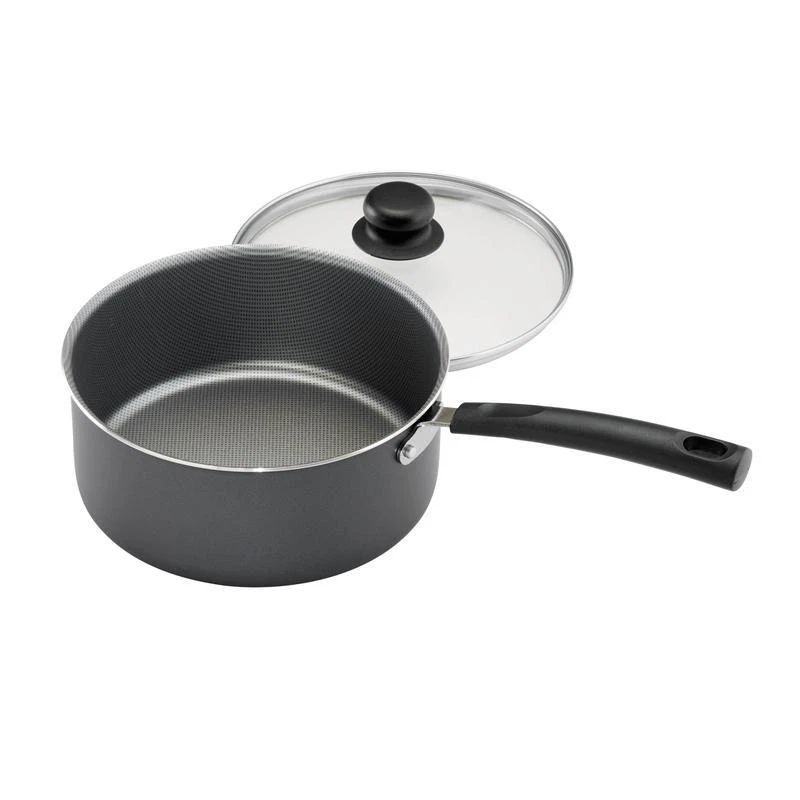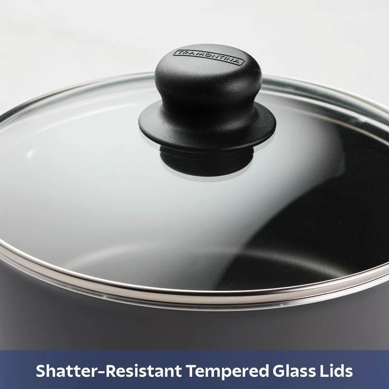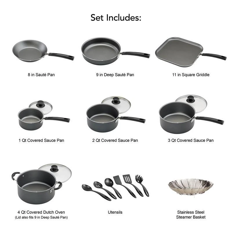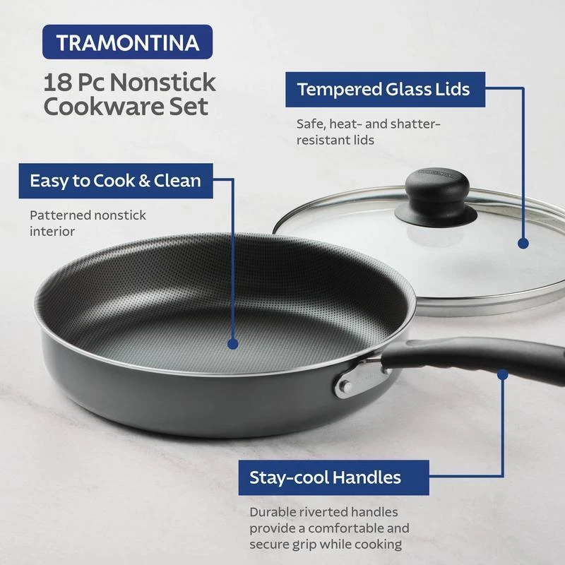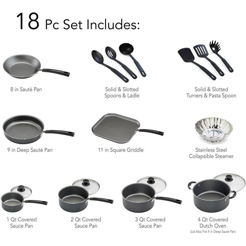 PrimaWare 18-Piece Nonstick Cookware Set provides all the cookware essentials and is an excellent starter cookware set. The patterned interior nonstick coating ensures easy cooking and simple cleanup, while the heat- and shatter-resistant tempered glass lids allow quick monitoring of cooking progress. PrimaWare 18-Piece Nonstick Cookware Set: Patterned gray interior non-stick coating for easy cooking and cleaning Riveted, stay-cool handles Heat- and shatter-resistant tempered glass lids allow easy monitoring of cooking progress Dishwasher-safe Compatible with gas, electric and ceramic glass cooktops Set includes: 8" saute pan 9" deep saute pan 11" griddle 1 qt sauce pan with lid 2 qt sauce pan with lid 3 qt sauce pan with lid 4 qt Dutch oven with lid (4 qt lid fits the 9" deep saute pan) Stainless steel foldup steamer Solid spoon Slotted spoon Solid turner Slotted turner Pasta spoon Ladle