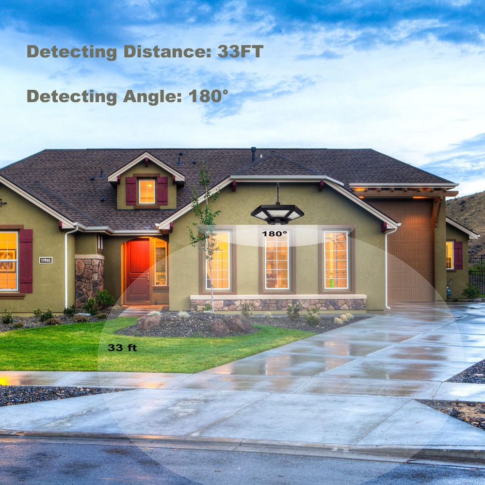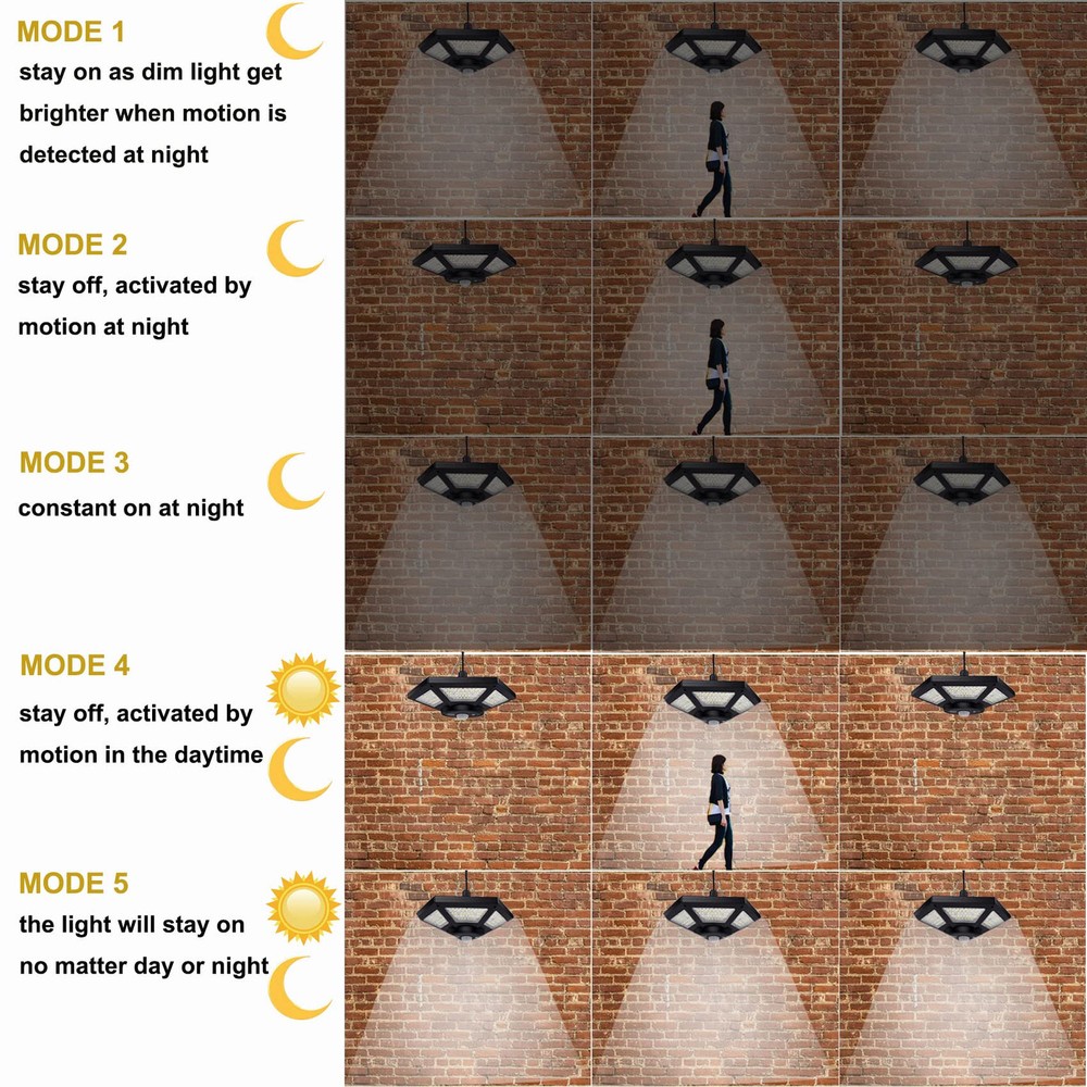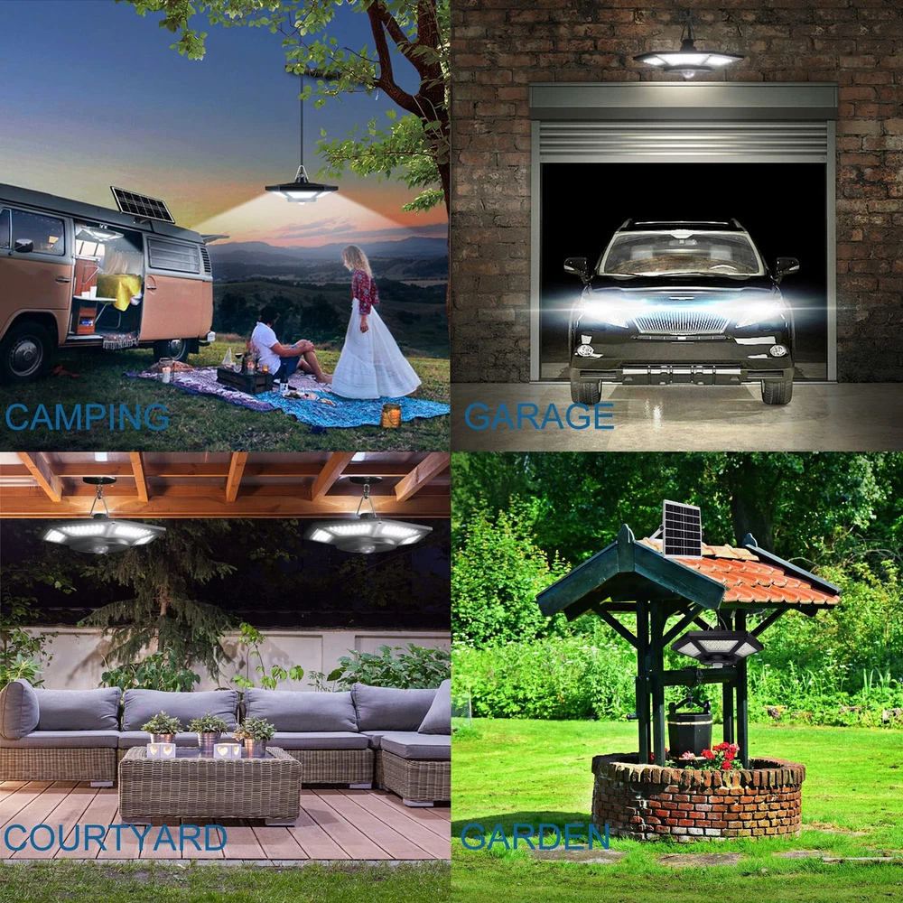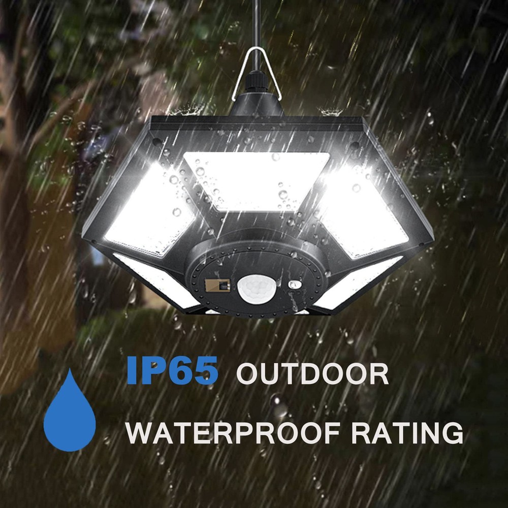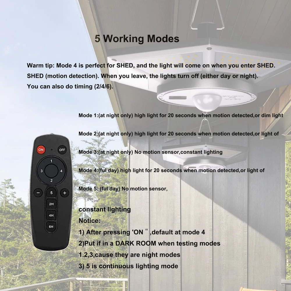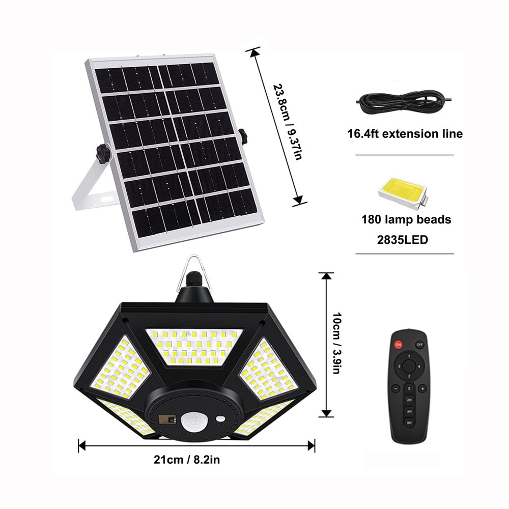 【Solar Powered & Great Durability】Compared with other solar pendant lights, our solar pendant lights use a newly upgraded high-efficiency solar panel, can be fully charged in 6-8 hours in the sun, supports illumination for at least 10-20 hours. In the winter or rainy season, due to weak sunlight, it is recommended to select the power-saving mode. 【5 Lighting Modes with Motion Sensing】This solar light uses a highly sensitive motion sensor and has 5 working modes. Mode1: Dim to bright when motion detected at night.Mode2: Off to bright when motion detected at night.Mode3: Constant lighting at night.Mode4: Off to bright when motion detected all day.Mode5: Constant lighting all day. 【Remote Control & Timer Setting】Solar Pendant Ceiling Light, came with a remote control to free up your hands, making turning on/off and selecting different modes and brightness the breeze to meet your different requirements. This indoor solar light also has 3 timer settings (2H/4H/6H), timer setting work daytime or night meets your different needs.When first using the remote control, please take out the clear insulation card. 【Split Design & Widely Used】solar panel is separated from the lamp, connected by a 16.4feet/5 meters water protective cable, and can be used indoors and outdoors. You can hang the solar lamps anywhere light is needed. Such as a chicken coop, yard, garage, porch, shed, basement, loft, gazebo, balcony, garden, barn, patio, camp, and storage room. 【IP65 Waterproof & Easy installation】This solar gazebo light is made of high-density ABS and IP65 waterproof materials and can withstand rain and other extreme weather (High Temperature/Blizzard/Frost/Strong Wind) conditions. Installation is also very convenient, just use screws to install the solar light directly on the wall or hang the solar light indoors or under the roof, with the solar panel facing the sun.