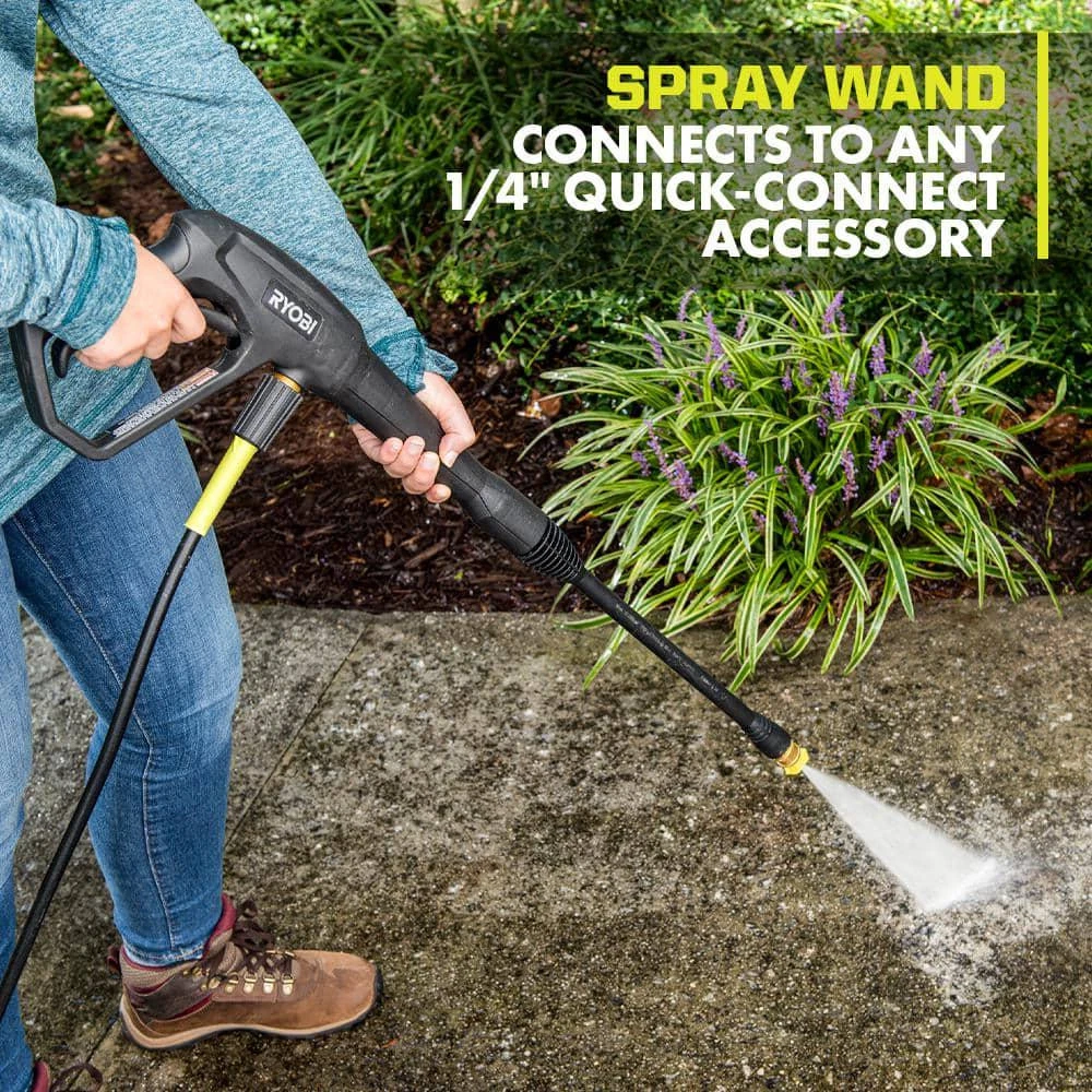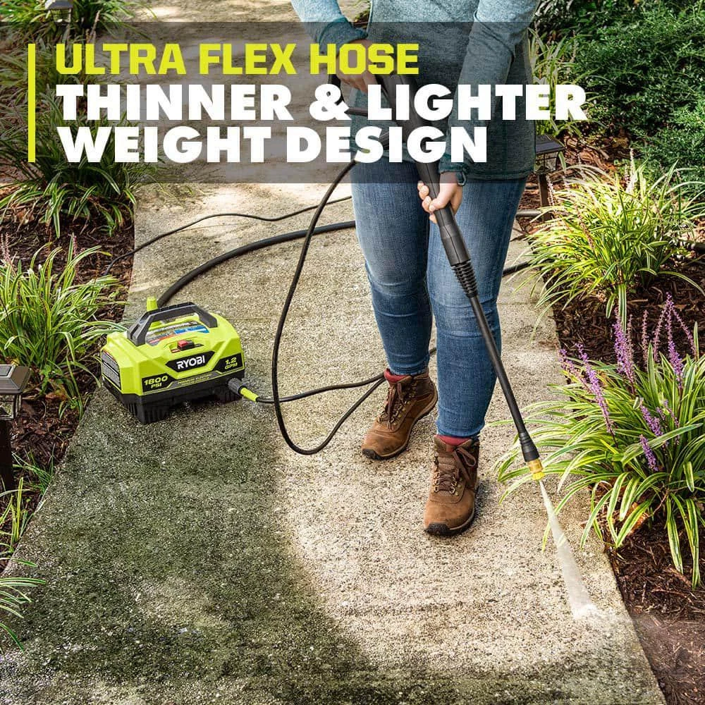 1800 PSI 1.2 GPM Cold Water Corded Electric Pressure Washer Convenient Portable Cleaning with 1800 PSI 1.2 GPM For use on Patio Furniture, Grills, Cars, Windows, & More Compact & Lightweight Design for Easy Transport The RYOBI 1800 PSI 1.2 GPM Electric Pressure Washer is the perfect lightweight and portable solution for your outdoor cleaning needs. Without the hassle of gas, this electric pressure washer is ideal for light duty tasks like cleaning patio furniture, grills, windows, bikes, boats, campers, decks, and other outdoor applications. Weighing just 16 lbs, this pressure washer is compact, making it convenient to transport and store in small spaces. The included 20 ultra flex hose is 50% lighter than a standard high pressure hose, reducing fatigue and allowing for easy maneuverability. The spray wand is equipped with a ¼ quick-connect nozzle coupler, making nozzle changes quick and simple. Clean a variety of messes with the two included nozzles, and get the job done 50% faster than a standard nozzle with the included turbo nozzle. Attach the soap applicator for a deeper clean when detergent is needed on tougher jobs. This pressure washer is backed by the RYOBI 3-year limited warranty. This kit the RY141802 1800 PSI 1.2 GPM Pressure Washer, Trigger Handle, Spray Wand, 20 Ultra Flex Hose, Soap Tank, ¼ Quick-Connect Nozzles (15°, Turbo, Soap), & Operator s Manual. Amperage (A): 13 A Assembly Required: Yes Commercial / Residential: Residential Connection Type: Bayonet Style Trigger Handle Connection Cord Length (ft.): 35 Features: Chemical/detergent injection,Cord Lock,Quick connect tips Gallons Per Minute: 1.2 Hose Material: Polyurethane Included: GFIC plug,Hose,Onboard cord storage,Onboard storage Maximum Pressure (PSI): 1800 psi Nozzle Type: Pro Style tips with quick disconnect Number of tips included: 3 Power Type: Corded Product Weight (lb.): 16.34 lb Pump Brand: Other Pump Type: Axial Reconditioned: New Returnable: 90-Day Start Type: Electronic Ignition Suggested Use: Car,Grill,Patio Furniture Water Temperature: Cold Manufacturer Warranty: 3-Year Limited Warranty Assembled Depth (in.): 18.375 in Assembled Height (in.): 7.75 in Assembled Width (in.): 11.875 in Hose length (in.): 240 in Interior Hose Diameter (in.): .25 in Wheel Diameter (in.): 0