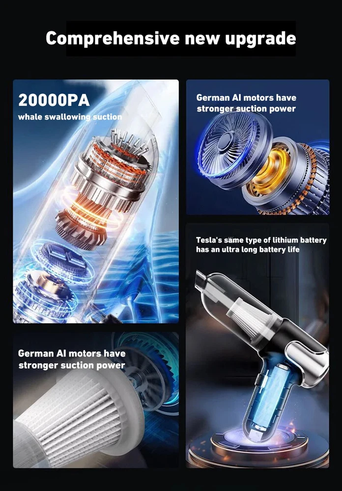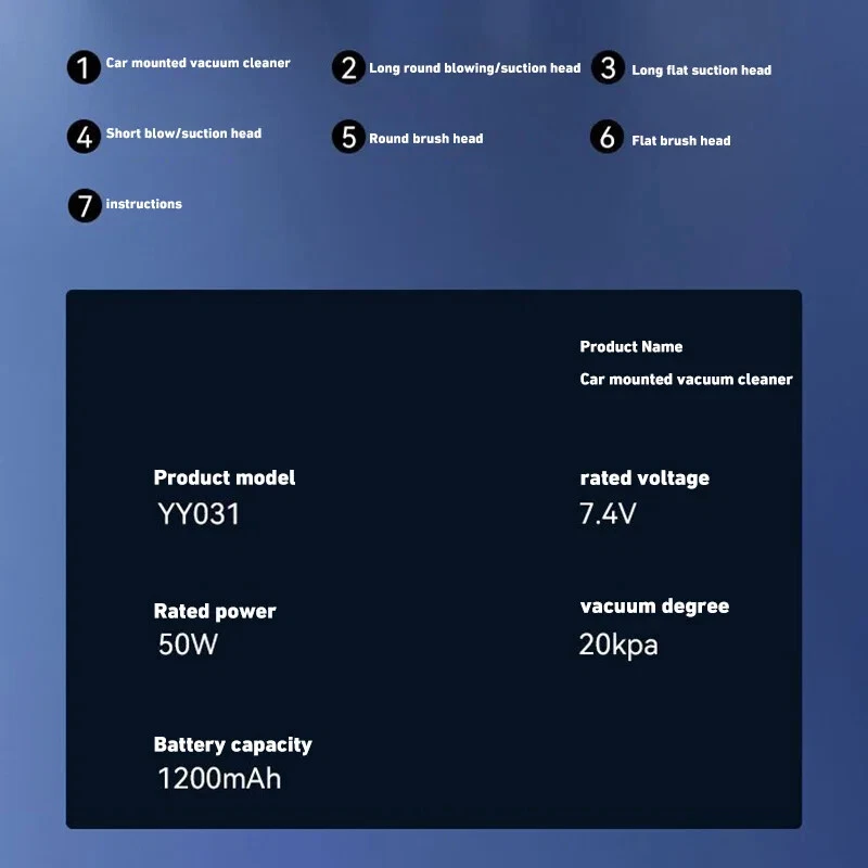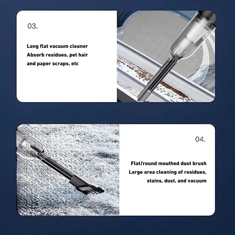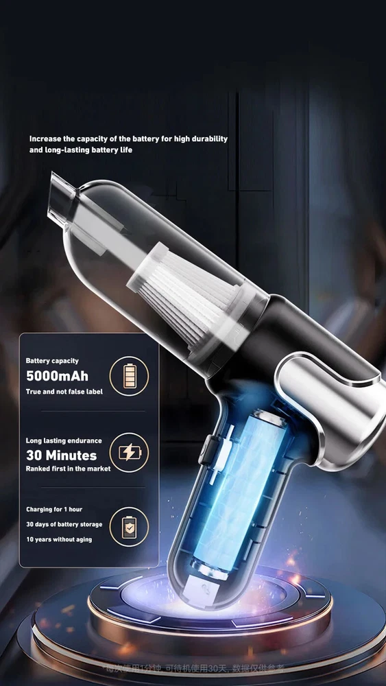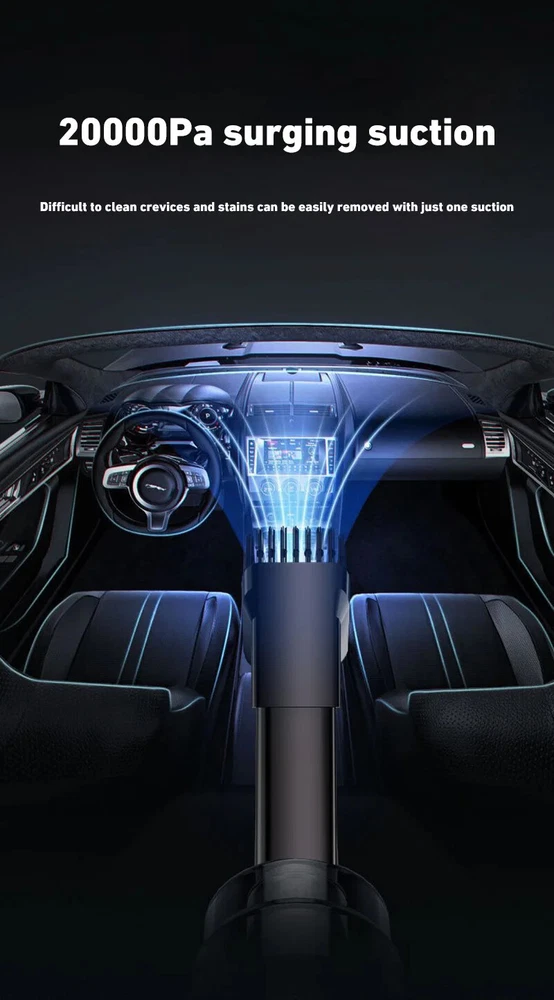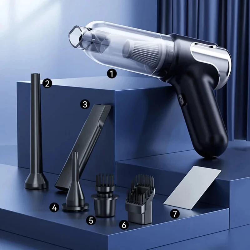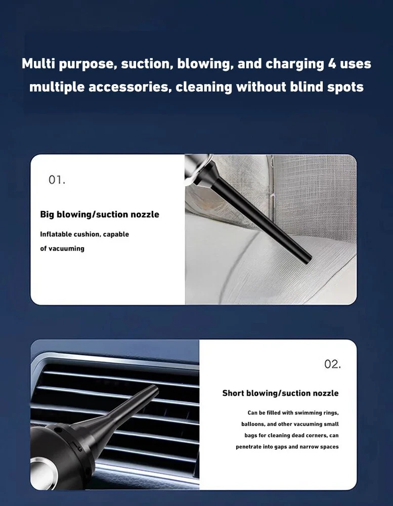 180000PA 5 in1 Car Vacuum Cleaner Wireless Handheld Strong Suction Cleaning Machine Portable Vacuum Cleaner for Car Home Specification: Rated speed: 45000(r/min) Rated input power: 120 (W) Rated voltage: ≤36V (V) Vacuum suction: 10000 (PA) Battery capacity: 2000mah Noise ratio: ≤70dB Charging time: 2-3hours About this product: 1.【Rechargeable Battery & Fast Charging】This electric vacuum cleaner has a built-in 2000mAh battery with a fast charging port. It can be easily charged using car chargers, power banks, laptop rechargeable batteries and other charging methods. Charging takes only 3 hours. This reusable vacuum cleaner is the perfect replacement for a compressed air tank, environmentally friendly and energy-saving. It also saves money and time. 2.【Powerful Air Duster and Vacuum Cleaner 4-in-1】Our vacuum cleaner has two functions: it can suck, pump, blow and charge. Easily blow away particles such as dirt, crumbs, and dust from surfaces, as well as remove small, stubborn dirt hidden in keyboards, nooks and crannies. 3.【Easy Maintenance】With just one click of removal, you can easily dump the garbage and clean the vacuum cleaner. Hepa filters can be washed and reused, ensuring efficient suction while keeping dust and dirt out and preventing clogging. 4.【Wide range of uses】The cordless vacuum cleaner comes with many different detachable brush head nozzle accessories for cleaning various scenarios. For example, it can thoroughly clean computer keyboards, cameras, air conditioners, sofas, windows, pets, plants, etc. Packing List: Vacuum cleaner *1 USB charging cable *1 brush *1 long-nosed straw *1 Vacuum nozzle*1 filter element *1