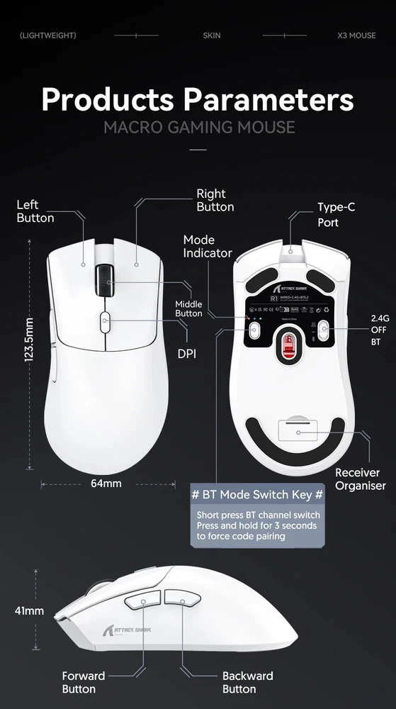 R1 18000dpi Wireless Mouse, 1000Hz, Tri-mode Connection, PAW3311,Macro Gaming Mouse Product Description: 1. Product model: R1 2. Product interface type: USB Type C 3. Product connection method: USB, 2.4G. Bluetooth 4. Transmission frequency: 2402MHz-2480MHz 5. Product optical sensor: Original phase PAW3311 6. Frame rate (IPS): 400IPS 7. Maximum acceleration (G): 40G 8. DPI : 800 -18000 9. Product weight: 59g ± 3g (Excluding weight of receiver) 10. Product size: 123.5 * 64 * 41mm