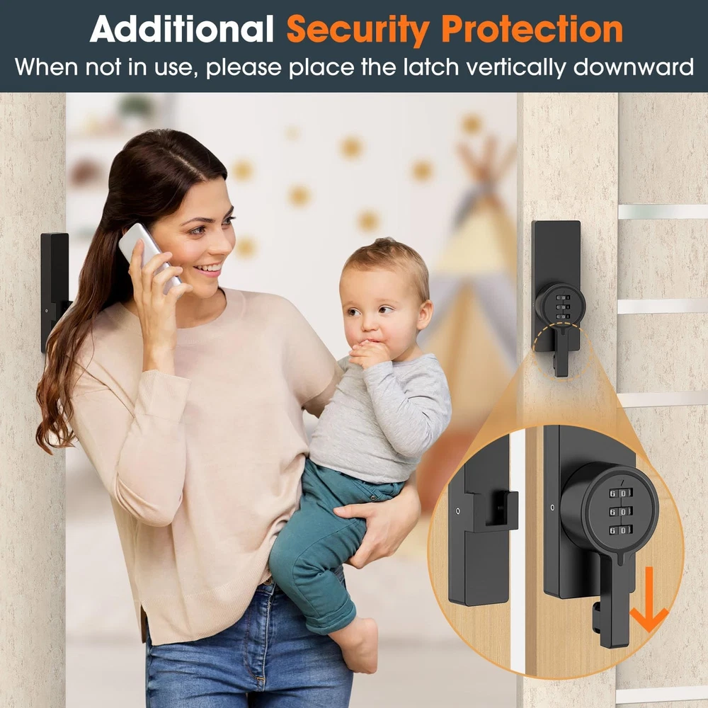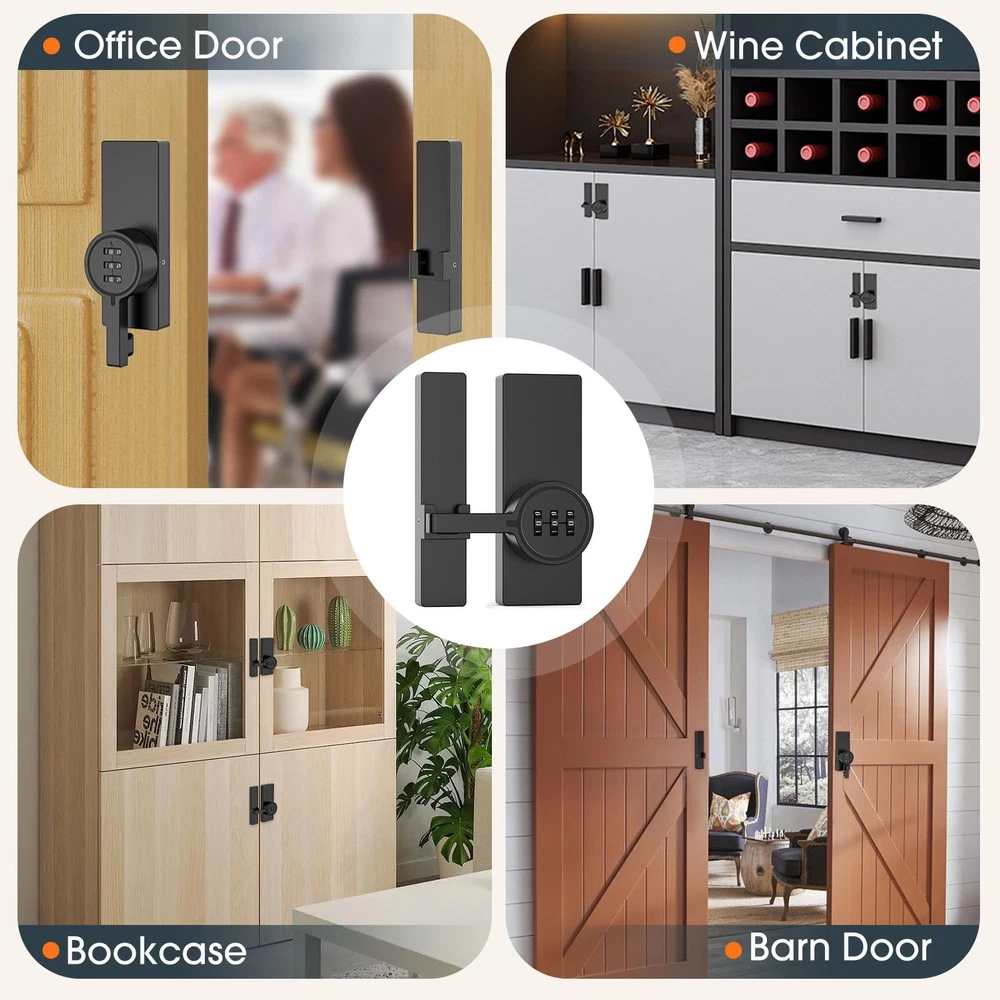 Password 180 Degree Barn Door Latch, Keyless Adhesive Flip Latch, Sliding Door Latch with 3-Digit Combination, Cabinet Lock with Glue and Screws for Gate, Locker, Shed, Bedroom, Closet, Storage Room Premium Material: This combination door lock is crafted from high-quality zinc alloy, offering exceptional resistance to rust, corrosion, and abrasion. Its durable construction ensures reliable performance and long-lasting use. Keyless Convenience: Featuring a 3-digit combination dial, this 180-degree barn door lock provides keyless entry for barn doors, cabinets, closets, and more. Say goodbye to the hassle of lost keys and enjoy effortless access. Flexible Installation: Designed for quick and easy setup, this sliding barn door lock can be installed in minutes using either adhesive or screws. Hidden screw holes enhance security and pry resistance. The 180° adjustable design allows for left- or right-handed installation, making it compatible with any door or cabinet. Resettable Combination Door Lock: You can easily reset the numeric combination at any time, with up to 1,000 possible combinations for personalized security. This feature ensures your belongings remain safe and private. Versatile Use: The gate latch is ideal for barn door, sliding door, cabinet, closet and locker. Its sleek design blends in with any home style while providing added security