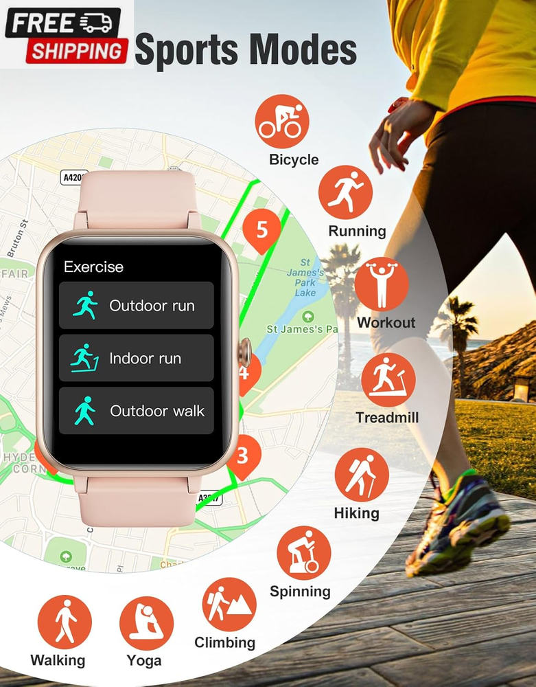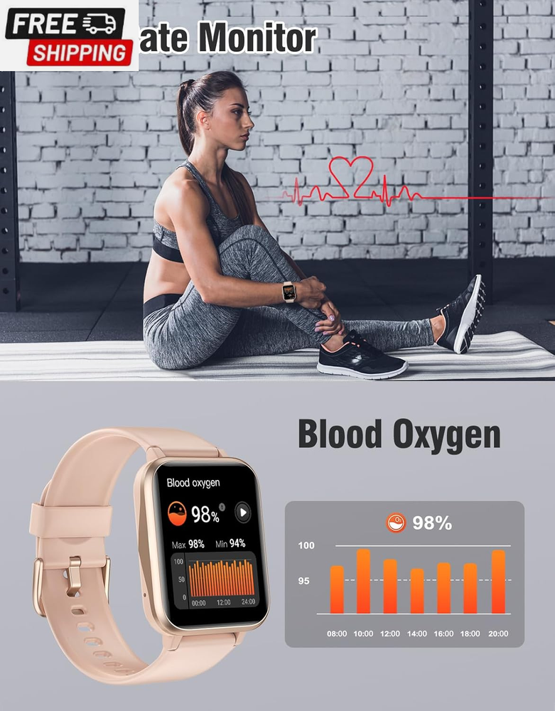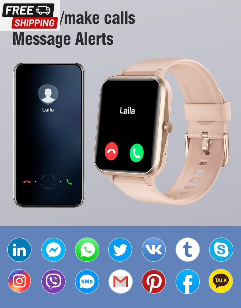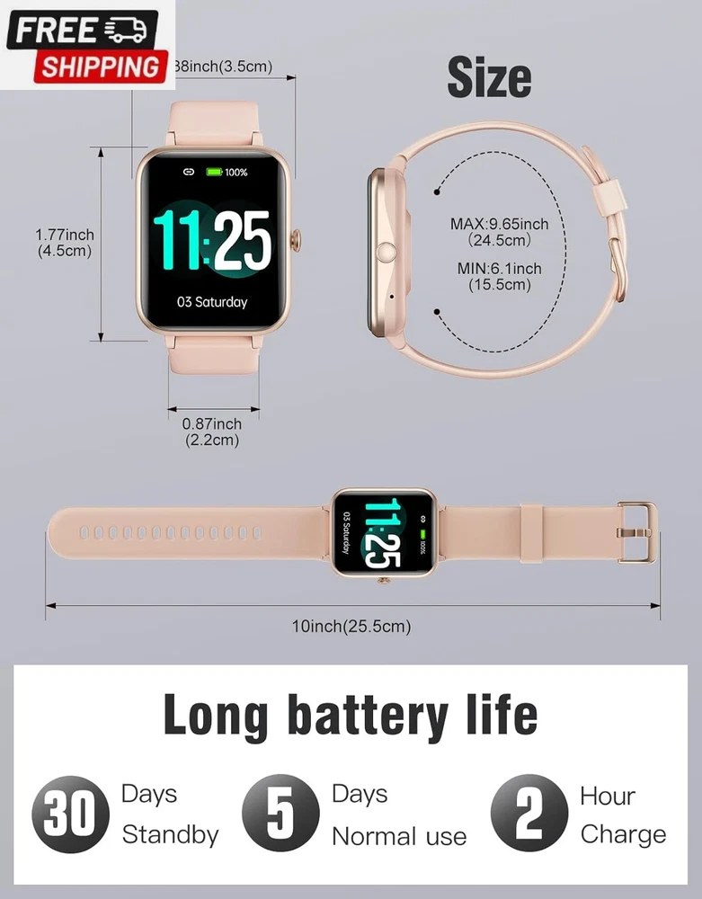 Fast Shipping On All Items 30 Days Money Guarantee Customer Support Excellent Service 100% Satisfaction Satisfaction Guaranteed Fitness Tracker Fitness Watches for Women Men (Make/Answer Calls), 1.85" Smart Watch for Iphone/Android Phones, Heart Rate/Sleep Monitor Steps Tracker Watch Pedometer IP68 Waterproof (Pink/Gold) Specification Whats in the box User Manual, Charging Cable OS Compatible with iOS & Android Connectivity technologies Bluetooth Batteries 1 9V batteries required. (included) Battery Cell Composition Lithium Polymer Color Pink/gold Special Feature Multisport Tracker, Activity Tracker, Alarm Clock, Notifications Brand ASIAMENG Country of Origin China Connectivity Technology Bluetooth Compatible Devices Smartphone Item Weight 3.2 ounces Shape Rectangular Standing screen display size 1.85 Inches Operating System Compatible with iOS & Android Special features Multisport Tracker, Activity Tracker, Alarm Clock, Notifications GPS No GPS Screen Size 1.85 Inches Package Dimensions 17.32 x 3.39 x 0.75 inches Manufacturer ASIAMENG Item Description 【Smart Watch Keeps You Informed】This smart watch seamlessly connects to your smartphone via Bluetooth and the app, allowing you to make/ answer calls and receive message notifications directly on the watch (you can read the messages but can’t reply them via the watch). 【All-day Activity Tracker】This fitness tracker features a 1.85-inch full-touch color screen with 200+ stylish dials for you to choose from the app. It is compatible with most iOS 9.0 & Android 5.0 and above smartphones(not for PC or tablet). It can accurately record your all day steps, calories and distance, also supports tracking 100+ exercise modes. 【Your Health Tracker】The fitness watch uses advanced sensors that can automatically monitor your real-time heart rate, blood oxygen level and sleep quality, allowing you to clearly understand your health status. You can set up to 10 alarm clocks to wake you up or remind you of other important things. Turn on "Do Not Disturb" to keep you from being disturbed while at work or rest. 【Long Battery Life & Waterproof】With the large battery capacity, this smartwatch can provide up to 5 days using or 30 days standby time. Designed with the IP68 waterproof, this watch can withstand splashes, rain, and accidental immersion in water. 【More Practical Features】When the watch is connected to the phone, click the "find your phone" icon on the watch, and the phone will send out an alert to help you find your phone quickly. Adjustable brightness allows you to see the screen clearly even in the sun. Adopting wrist sensing design, just raise your wrist to wake up the screen. In addition, it features timer, stopwatch, sedentary reminder, female menstrual cycle tracking etc. Package include: 1 x Smart Watch, 1 x Charging Cable,1 x User's Manual About us We offer the best prices around on high quality products. Our E-store includes media such as books, movies, music and games while offering electronics, toys, sporting apparel, clothing, tools, general home, garden items and more. Shipping We are always working hard to ensure your package arrives as soon as possible. Please understand that some factors like weather, high postal traffic, and the performance of shipping companies are outside of our control. We offer free shipping to the lower 48 states and ship within 2-3 business days of payment, usually sooner. We do not accept P.O. Boxes. Please provide a physical address. For shipping outside of the continental USA, we only use eBay's Global Shipping Program.The item is shipped to KY and then sent to the rest of the world. International customers are responsible for all duties and taxes. Continue to check out to calculate costs for shipping the item to your country. Messages regarding eBay's Global Shipping Program MUST be directed at eBay EXCLUSIVELY. Returns We offer a 30-Day Return Policy on items in which you are not completely satisfied with. You have the option of a full-refund or an exchange of the item. No returns are available on items shipped outside of the USA Satisfaction We try over very best to make sure every customer is completely satisfied. If there's a problem, message us! We're happy to help. Payment Options Shop With Confidence