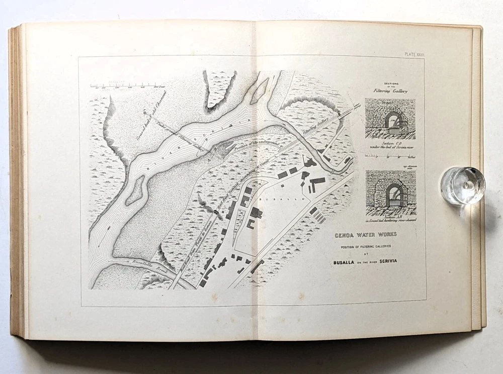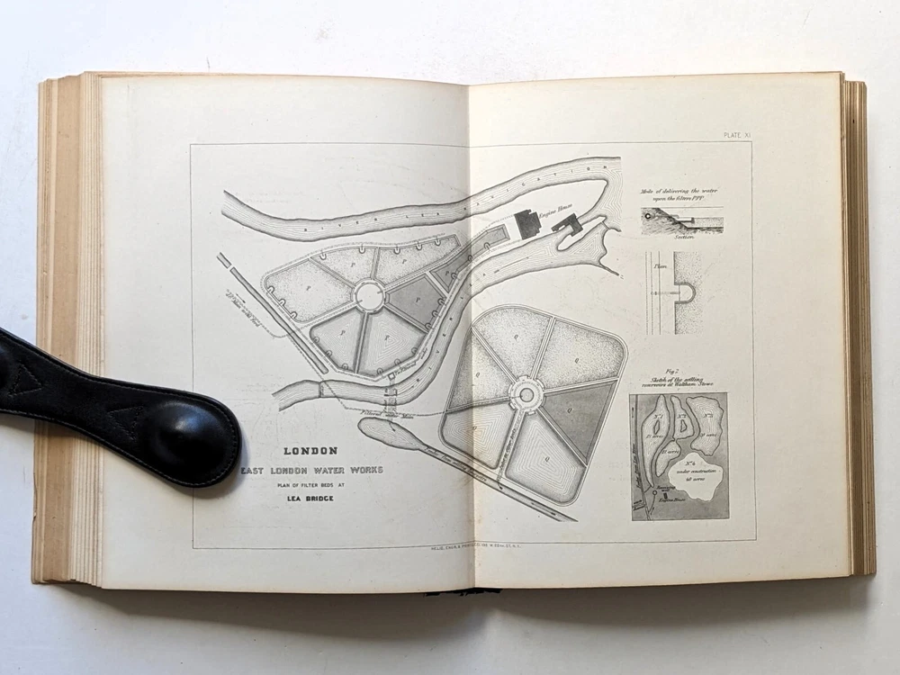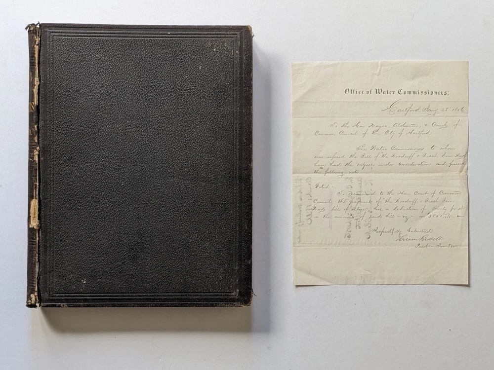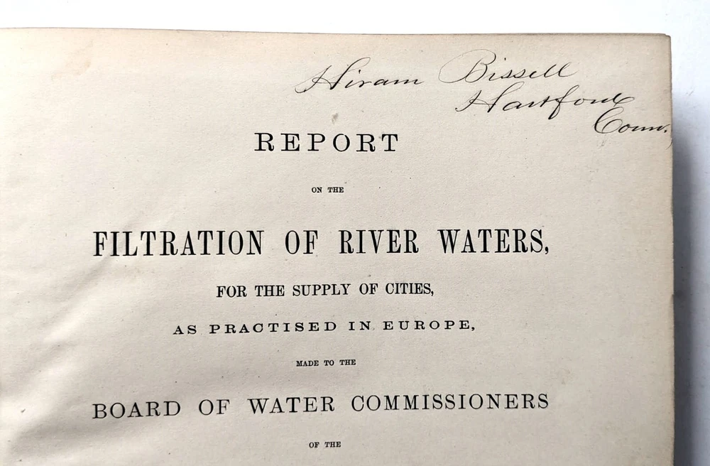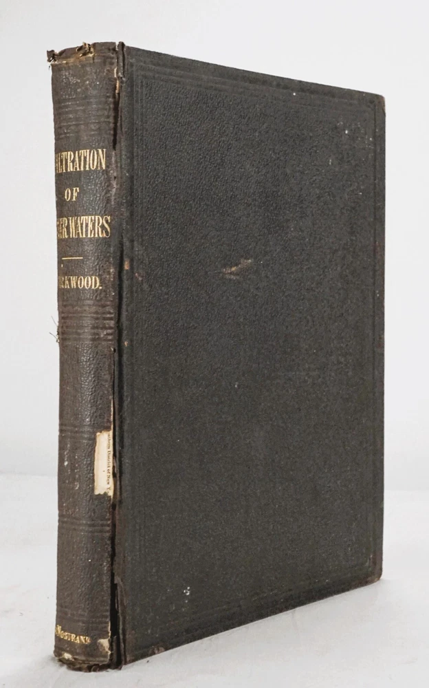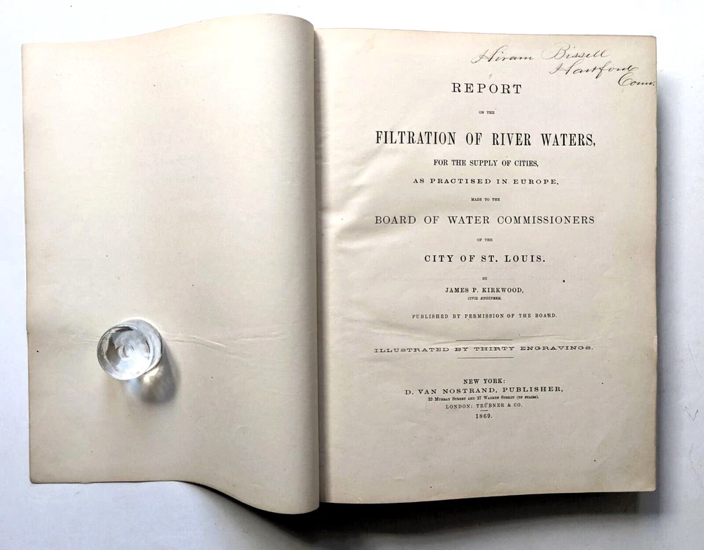 1869 FILTRATION OF RIVER WATERS FOR THE SUPPLY OF CITIES AS PRACTISED IN EUROPE, by James P. Kirkwood. Published by D. Van Nostrand, Publishers, New York, 1869. First Edition. Copy of HIRAM BISSELL who was President of HARTFORD'S WATER COMMISSION from 1854 to 1873 and OVERSAW THE CONSTRUCTION OF HARTFORD'S WATER WORKS SYSTEM. The book is SIGNED by Hiram Bissell at the top of the title page: "Hiram Bissell / Hartford, Conn." Also, laid-in the book is a MANUSCRIPT LETTER by Hiram Bissell on "Office of Water Commissioners" letterhead. The letter reads in part: "Hartford Jany 28 1856 / To the Mayor Aldermen, and County of Common Council of The City of Hartford / The Water Commissioners...recommend to the Hon. Court of Common Council the payment of The Woodruff & Beach Iron Works bill of extras...$3851.57. / Respectfully Submitted / Hiram Bissell / President Pro Tem". (Woodruff & Beach Iron Works of Hartford built many items for Hartford Water Works, including some massive iron pumps.) Hardcover book, 9x11.5 inches, 178 pages of text followed by 30 PLATES, many double-page, one in color. The plates are drawings of a variety of European city water works systems, including: London, Liverpool, Dublin, Hamburg, Berlin, Marselles, Lyons, Genoa, and others. Condition: The covers are disbound (loose but present), the cloth spine edges and spine ends are scraped and chipped, nonetheless the covers are original. Internally nice, the endpapers have a few small scrapes, the pages are lightly toned, there is some foxing to the plates mainly on their blank backsides, overall the pages are complete, tight, bright, clean and unmarked. A nice, complete copy in disbound but present covers. RARE TRUE 1869 FIRST EDITION with all the PLATES. Unique with the SIGNATURE and LETTER of HIRAM BISSELL, who oversaw the construction of Hartford's Water Works in the mid 1800s. An important book that may have been partly responsible for the design of Hartford's water system About HIRAM BISSELL of HARTFORD, CONNECTICUT (from "Water for Hartford: The Story of the Hartford Water Works", published by the Wesleyan Press, 2010). ******HOW THREE MEN BROUGHT CLEAN WATER TO HARTFORD, ON A MASSIVE SCALE. As good health is inextricably wedded to pure drinking water, understanding delivery systems is almost as important as the water itself. Water for Hartford chronicles the century-long effort, beginning in the 1850s, to construct a viable, efficient water system. The story of Hartford's water works is a fascinating one, for it recalls the hard work, great sacrifice, and extraordinary engineering feats necessary to deliver wholesome drinking water to a growing urban center. The story of its construction is the story of three men - HIRAM BISSELL, Ezra Clark, and Caleb Saville. Readers are transported back in time and given a firsthand glimpse of what these champions of a water system faced on a daily basis: unforgiving geography, venal politicians, and an often indifferent public. The book culminates in the exhilaration of these men having built a water works from scratch to deliver clean, safe drinking water to the masses. These men understood that their decisions and actions would affect millions of people for decades to come.****** About HIRAM BISSELL and the HARTFORD WATER WORKS SYSTEM (from the Commemorative Biographical Record of Hartford County, Connecticut, published 1901): ******Hiram Bissell, b.1819 d.1888, was elected Water Commissioner in 1854 and, in 1856, was made President, in which capacity he served for seventeen years, retiring in 1873. He oversaw the entire system of Hartford's system of water works.******