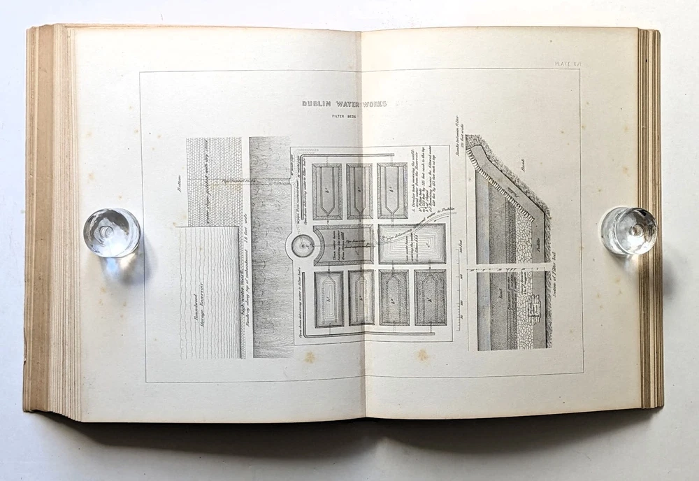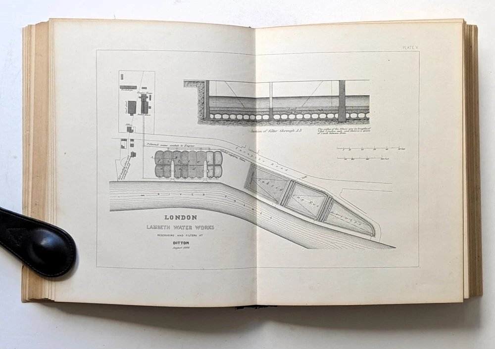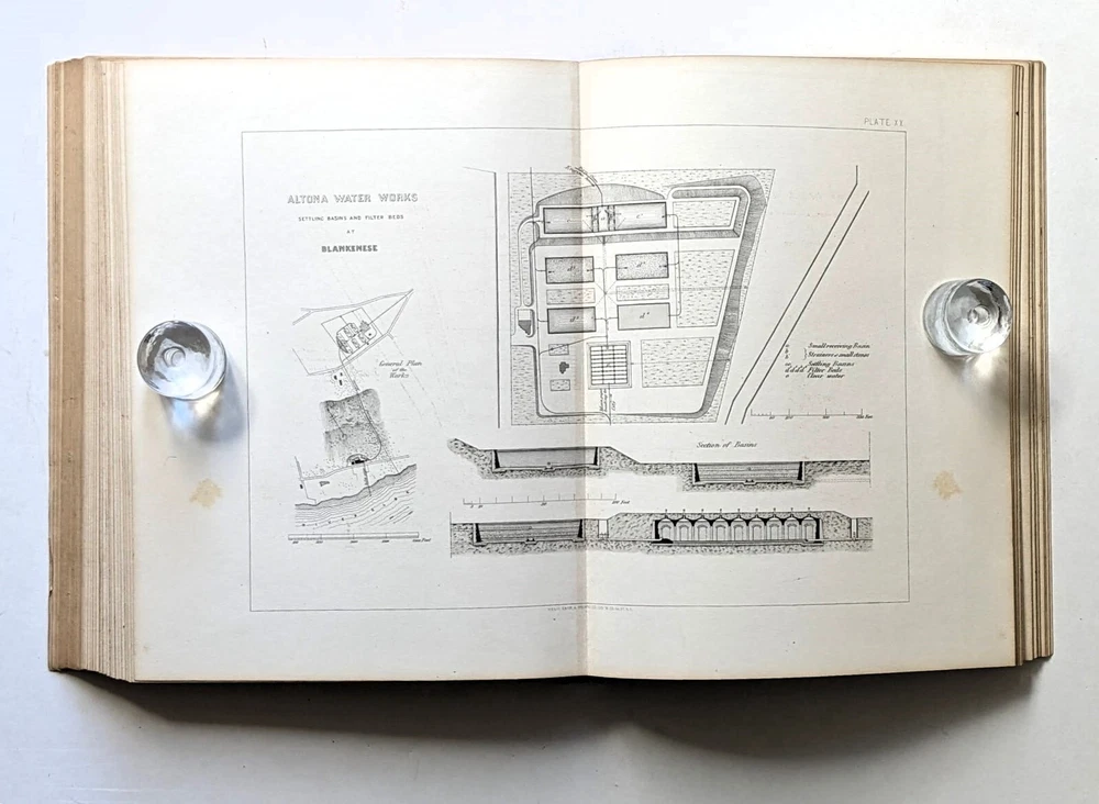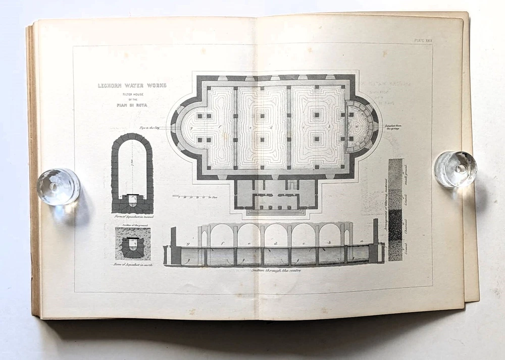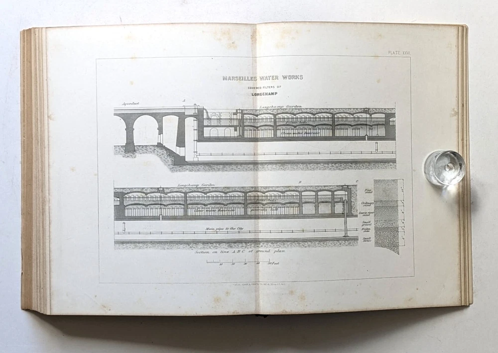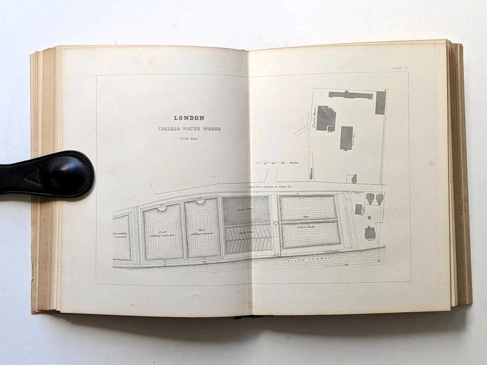 1869 FILTRATION OF RIVER WATERS FOR THE SUPPLY OF CITIES AS PRACTISED IN EUROPE, by James P. Kirkwood. Published by D. Van Nostrand, Publishers, New York, 1869. First Edition. Copy of HIRAM BISSELL who was President of HARTFORD'S WATER COMMISSION from 1854 to 1873 and OVERSAW THE CONSTRUCTION OF HARTFORD'S WATER WORKS SYSTEM. The book is SIGNED by Hiram Bissell at the top of the title page: "Hiram Bissell / Hartford, Conn." Also, laid-in the book is a MANUSCRIPT LETTER by Hiram Bissell on "Office of Water Commissioners" letterhead. The letter reads in part: "Hartford Jany 28 1856 / To the Mayor Aldermen, and County of Common Council of The City of Hartford / The Water Commissioners...recommend to the Hon. Court of Common Council the payment of The Woodruff & Beach Iron Works bill of extras...$3851.57. / Respectfully Submitted / Hiram Bissell / President Pro Tem". (Woodruff & Beach Iron Works of Hartford built many items for Hartford Water Works, including some massive iron pumps.) Hardcover book, 9x11.5 inches, 178 pages of text followed by 30 PLATES, many double-page, one in color. The plates are drawings of a variety of European city water works systems, including: London, Liverpool, Dublin, Hamburg, Berlin, Marselles, Lyons, Genoa, and others. Condition: The covers are disbound (loose but present), the cloth spine edges and spine ends are scraped and chipped, nonetheless the covers are original. Internally nice, the endpapers have a few small scrapes, the pages are lightly toned, there is some foxing to the plates mainly on their blank backsides, overall the pages are complete, tight, bright, clean and unmarked. A nice, complete copy in disbound but present covers. RARE TRUE 1869 FIRST EDITION with all the PLATES. Unique with the SIGNATURE and LETTER of HIRAM BISSELL, who oversaw the construction of Hartford's Water Works in the mid 1800s. An important book that may have been partly responsible for the design of Hartford's water system About HIRAM BISSELL of HARTFORD, CONNECTICUT (from "Water for Hartford: The Story of the Hartford Water Works", published by the Wesleyan Press, 2010). ******HOW THREE MEN BROUGHT CLEAN WATER TO HARTFORD, ON A MASSIVE SCALE. As good health is inextricably wedded to pure drinking water, understanding delivery systems is almost as important as the water itself. Water for Hartford chronicles the century-long effort, beginning in the 1850s, to construct a viable, efficient water system. The story of Hartford's water works is a fascinating one, for it recalls the hard work, great sacrifice, and extraordinary engineering feats necessary to deliver wholesome drinking water to a growing urban center. The story of its construction is the story of three men - HIRAM BISSELL, Ezra Clark, and Caleb Saville. Readers are transported back in time and given a firsthand glimpse of what these champions of a water system faced on a daily basis: unforgiving geography, venal politicians, and an often indifferent public. The book culminates in the exhilaration of these men having built a water works from scratch to deliver clean, safe drinking water to the masses. These men understood that their decisions and actions would affect millions of people for decades to come.****** About HIRAM BISSELL and the HARTFORD WATER WORKS SYSTEM (from the Commemorative Biographical Record of Hartford County, Connecticut, published 1901): ******Hiram Bissell, b.1819 d.1888, was elected Water Commissioner in 1854 and, in 1856, was made President, in which capacity he served for seventeen years, retiring in 1873. He oversaw the entire system of Hartford's system of water works.******