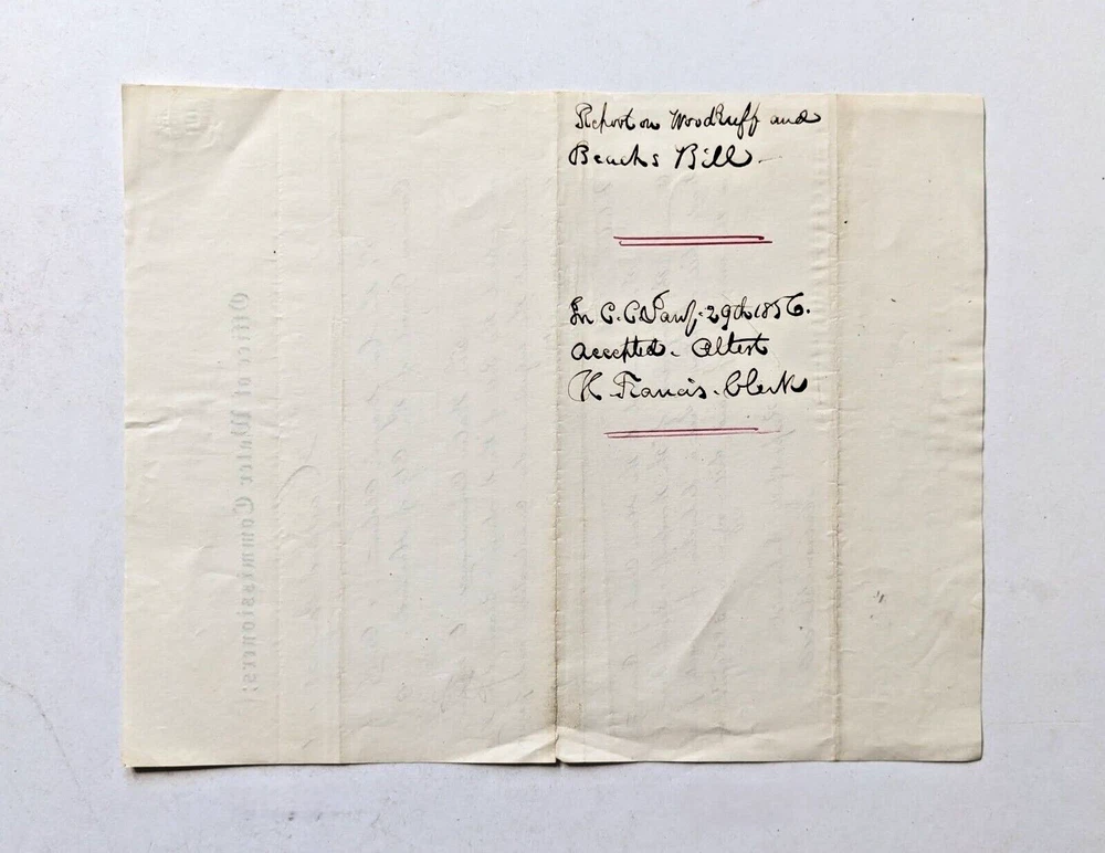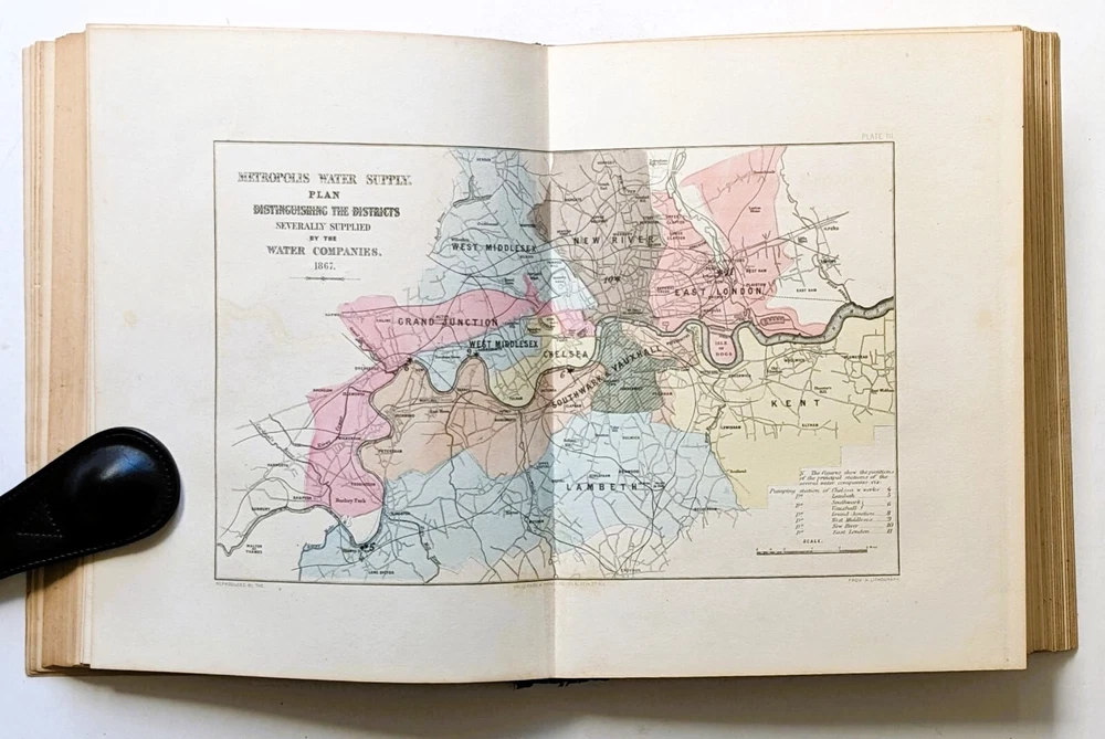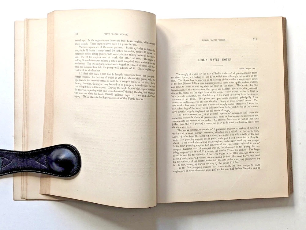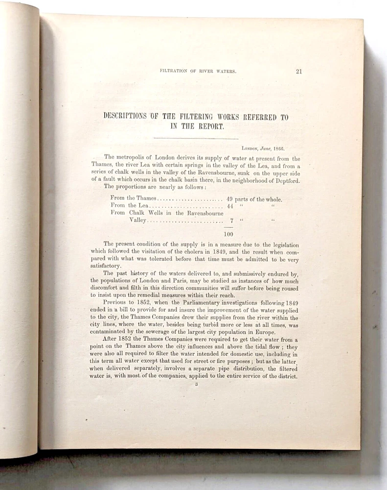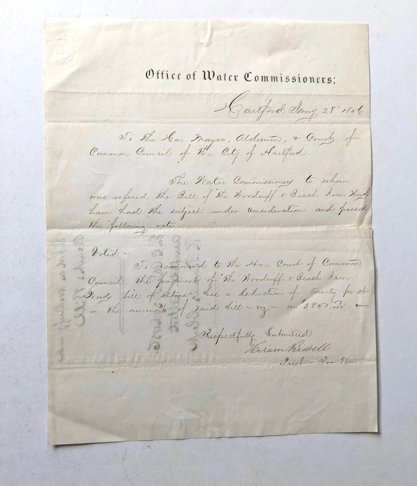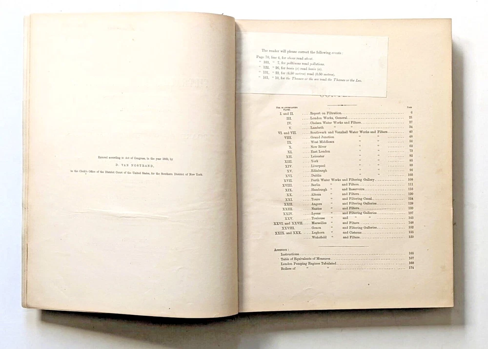 1869 FILTRATION OF RIVER WATERS FOR THE SUPPLY OF CITIES AS PRACTISED IN EUROPE, by James P. Kirkwood. Published by D. Van Nostrand, Publishers, New York, 1869. First Edition. Copy of HIRAM BISSELL who was President of HARTFORD'S WATER COMMISSION from 1854 to 1873 and OVERSAW THE CONSTRUCTION OF HARTFORD'S WATER WORKS SYSTEM. The book is SIGNED by Hiram Bissell at the top of the title page: "Hiram Bissell / Hartford, Conn." Also, laid-in the book is a MANUSCRIPT LETTER by Hiram Bissell on "Office of Water Commissioners" letterhead. The letter reads in part: "Hartford Jany 28 1856 / To the Mayor Aldermen, and County of Common Council of The City of Hartford / The Water Commissioners...recommend to the Hon. Court of Common Council the payment of The Woodruff & Beach Iron Works bill of extras...$3851.57. / Respectfully Submitted / Hiram Bissell / President Pro Tem". (Woodruff & Beach Iron Works of Hartford built many items for Hartford Water Works, including some massive iron pumps.) Hardcover book, 9x11.5 inches, 178 pages of text followed by 30 PLATES, many double-page, one in color. The plates are drawings of a variety of European city water works systems, including: London, Liverpool, Dublin, Hamburg, Berlin, Marselles, Lyons, Genoa, and others. Condition: The covers are disbound (loose but present), the cloth spine edges and spine ends are scraped and chipped, nonetheless the covers are original. Internally nice, the endpapers have a few small scrapes, the pages are lightly toned, there is some foxing to the plates mainly on their blank backsides, overall the pages are complete, tight, bright, clean and unmarked. A nice, complete copy in disbound but present covers. RARE TRUE 1869 FIRST EDITION with all the PLATES. Unique with the SIGNATURE and LETTER of HIRAM BISSELL, who oversaw the construction of Hartford's Water Works in the mid 1800s. An important book that may have been partly responsible for the design of Hartford's water system About HIRAM BISSELL of HARTFORD, CONNECTICUT (from "Water for Hartford: The Story of the Hartford Water Works", published by the Wesleyan Press, 2010). ******HOW THREE MEN BROUGHT CLEAN WATER TO HARTFORD, ON A MASSIVE SCALE. As good health is inextricably wedded to pure drinking water, understanding delivery systems is almost as important as the water itself. Water for Hartford chronicles the century-long effort, beginning in the 1850s, to construct a viable, efficient water system. The story of Hartford's water works is a fascinating one, for it recalls the hard work, great sacrifice, and extraordinary engineering feats necessary to deliver wholesome drinking water to a growing urban center. The story of its construction is the story of three men - HIRAM BISSELL, Ezra Clark, and Caleb Saville. Readers are transported back in time and given a firsthand glimpse of what these champions of a water system faced on a daily basis: unforgiving geography, venal politicians, and an often indifferent public. The book culminates in the exhilaration of these men having built a water works from scratch to deliver clean, safe drinking water to the masses. These men understood that their decisions and actions would affect millions of people for decades to come.****** About HIRAM BISSELL and the HARTFORD WATER WORKS SYSTEM (from the Commemorative Biographical Record of Hartford County, Connecticut, published 1901): ******Hiram Bissell, b.1819 d.1888, was elected Water Commissioner in 1854 and, in 1856, was made President, in which capacity he served for seventeen years, retiring in 1873. He oversaw the entire system of Hartford's system of water works.******