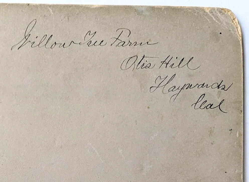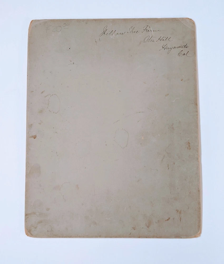 Two historic circa 1880 photographs of an early and notable HAYWARD, CALIFORNIA settler, OTIS HILL, and what appears to be his young daughter, in front of their house at "Willow Tree Farm" in what was then called HAYWARDS, California. Two photographs, one 6.5x8.5 inch and one 6x8 inch, both mounted on 11x14 inch card mounts. Written on the backside of each mount is: "WILLOW TREE FARM / OTIS HILL / HAYWARDS / CAL." The fact that the photograph identifies the town as "Haywards" allows the photograph to be dated from between 1876 and 1880. (The town was incorporated in 1876 and given the official name HAYWARDS, but a few years later, circa 1880, the "S" was dropped and the town became HAYWARD.) VERY GOOD condition: The mounts are lightly soiled, have some edge and corner wear, and a few smallish stains to the backsides; one mount has a clipped corner. The photographs are lovely with just a few light rubs and a couple small superficial scrapes. How HAYWARDS California became HAYWARD California (from the City website): ******Hayward was originally known as "Hayward's", then as "Haywood", later as "Haywards", and eventually as "Hayward". On his way from gold country to San Francisco in 1851,a failed prospector named William Hayward passed through what is now downtown Hayward. He liked what he saw and bought some land. In 1852, Hayward set up a small general store at the corner of A Street and Mission Boulevard. The store became a major stop on the road from Oakland to San Jose. Hayward expanded his business, erecting a lodging house that grew to become the famous Hayward's Hotel. When the town was incorporated on March 11, 1876, it was officially named "Haywards" after the landmark hotel. The "s" was dropped several years later.****** About OTIS HILL of HAYWARDS, California (from History of the State of California & Biographical Record of Coast Counties, California, Pages 1189-1190. The Chapman Publishing Co., Chicago, 1904.): ******Prominent among the pioneer residents of Alameda county is OTIS HILL, a venerable and highly respected agriculturist, whose ranch is located about one mile from the city of Hayward. In the development of this section of the county, and in the advancement of its welfare, he has been an important factor. Coming here a full half century ago, he, with the other early settlers of this locality, bravely endured the hardships and privations of pioneer life. Mr. Hill was born, September 21, 1827, in Lockport, N.Y., a son of Orson Hill. Coming to California by the Nicaragua route in 1855, he located in Hayward's, where he had a brother living. In 1856 Mr. Hill bought, for $900, one hundred and thirty acres of land in the Castro valley. Some time during the sixties he got the Spanish grant title to two hundred acres. He has now in his home ranch many acres of valuable land, supplied with water from a spring, and lying on the line of the Haywards and Oakland Electric line, a most favorable location. He carried on general farming, paying special attention to the cultivation of fruits, and is quite successful. He also has a valuable gravel pit, which is a source of considerable revenue.******