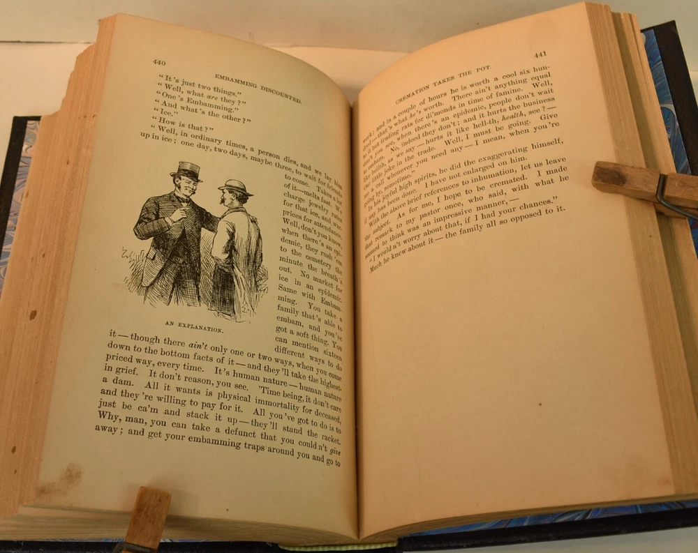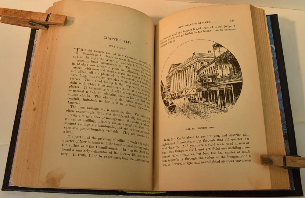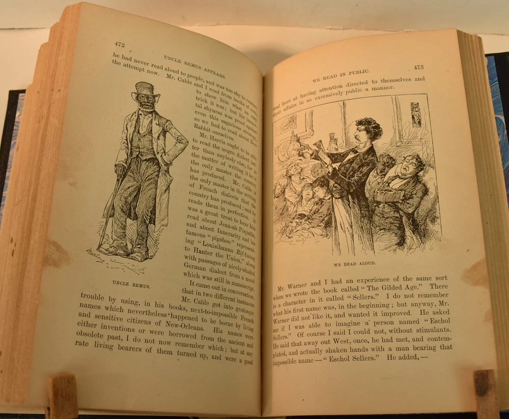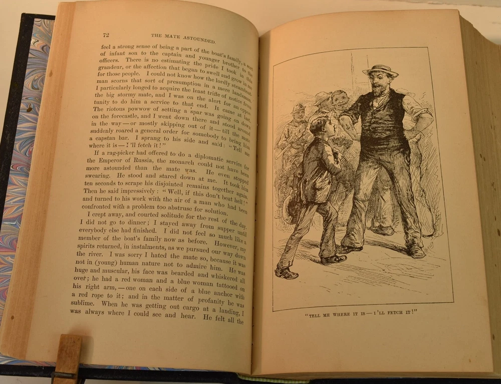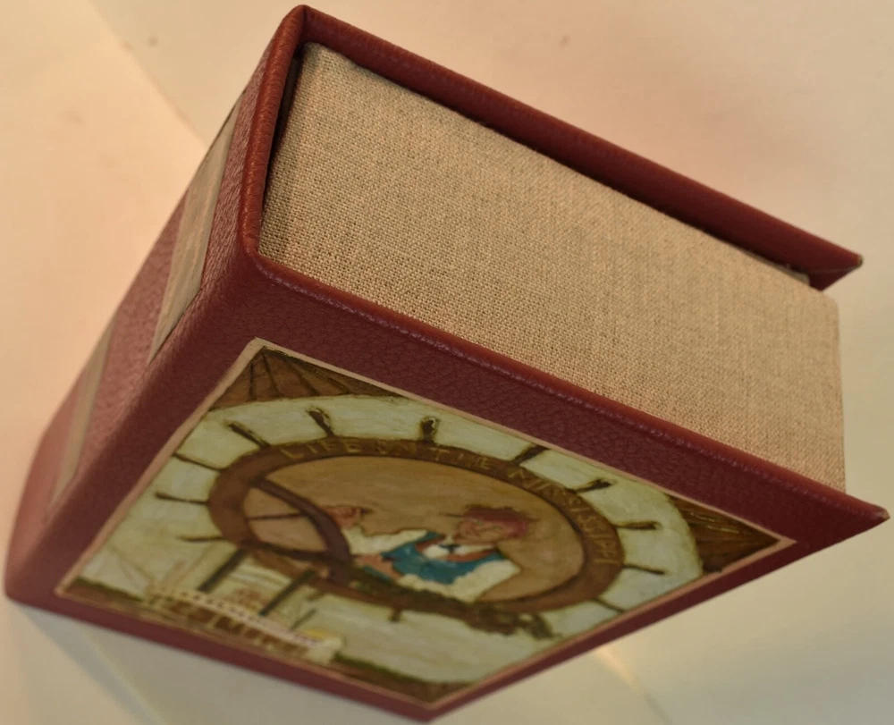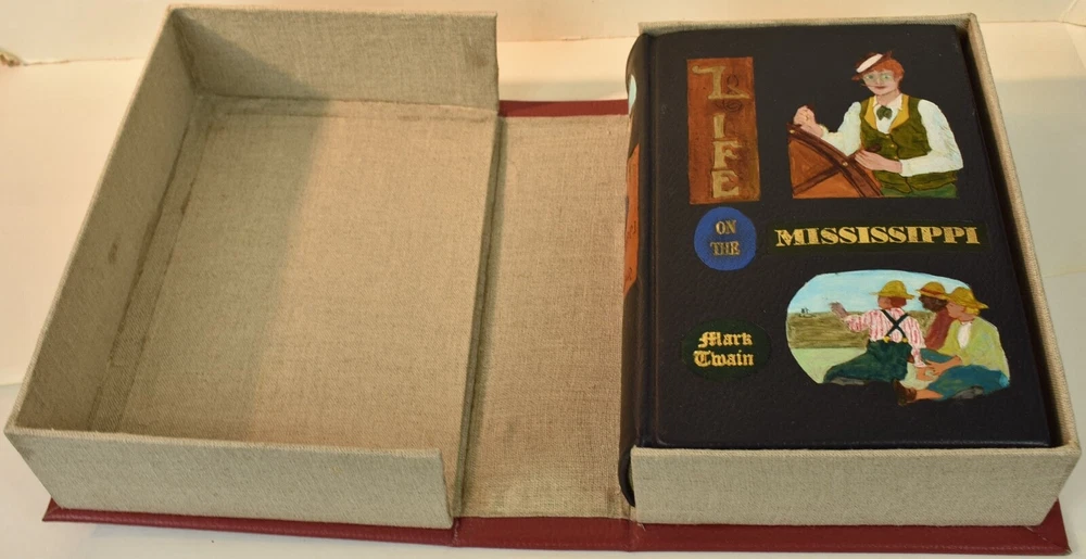 LIFE ON THE MISSISSIPPI Written by Mark Twain and published by James R. Osgood and Company, Boston; copyright 1883. This is the first edition; second state with 1883 on the title page and without “Twain in flames” (this image disturbed Twain’s wife Olivia) on page 441, and with St. Louis Hotel corrected to St. Charles Hotel on page 443. Like most of Twain’s book’s published in the 19th century, this book is profusely illustrated with 316 illustrations. The illustrations comprise an integral part of the book’s humor. This book has been rebound into a new leather binding that features hand-carved and colored inlay. It also comes in a similar leather clamshell box. All leather carving and coloring was done by me. Designs were taken from the original artwork in the book which were done many years ago by E. H. Garrett, Frank Merrill and John J. Harley LIFE ON THE MISSISSIPPI is a memoir by Mark Twain, of his days as a steamboat pilot on the Mississippi River before the American Civil War, and also a travel book, recounting his trip along the Mississippi many years after the Civil War. Twain once remarked that he considered this book his masterpiece, and that it would outlive his other works and endure as a classic. The book begins with a brief history of the river from its discovery by Hernando de Soto in 1542. It continues with anecdotes of Twain's training as a steamboat pilot, as the 'cub' of an experienced pilot. He describes, with great affection, the science of navigating the ever-changing Mississippi River in a section that was first published in 1876, entitled "Old Times on the Mississippi". In the second half, Twain narrates his trip many years later on a steamboat from St. Louis to New Orleans. He describes the competition from railroads, and the new, large cities, and adds his observations on greed, gullibility, tragedy, and bad architecture. He also tells some stories that are most likely tall tales. Simultaneously published in 1883 in the United States and Great Britain, it is said to be the first book submitted to a publisher as a typewritten manuscript. DESCRIPTION: 624 pages 8 3/4 x 6 inches unique artist designed leather bound hardcover with original 1883 First Edition Mark Twain text block CONDITION: This hard-cover book is in fine condition with a custom slip-case. The book has been rebound in full navy cowhide that has leather inlays that are hand-carved, dyed, tooled and colored by me—Bookpa. The interior is completely original with all pages and illustrations present. The book has been bound with new marbled paper (made by me) endpapers. The book is very old but is in remarkable condition considering that it is 130+ years old. The paper shows age toning but is clean overall. The paper shows age toning—as is the case with nearly all examples of this book because early pulp paper was used. This book may have been in a library at one time, although there are no stamps, numbers, pockets, etc., the margins have been cut down about 1/4” in length and width which was a common practice with library books. The interior is otherwise mostly clean with no foxing, major grubbiness or staining. There are a few smudges or finger-marks. I have pictures of the worst. There is a name and date (1887) written on the first blank endpaper. Binding and hinges are excellent as the book was rebound using traditional methods and non-acidic materials. The book is capable of being read using proper care if you so desire. The box is hand-made with heavy red leather with a hand-carved and stamped, colored leather inlay on the front or top panel. The interior of the box is covered with linen. BECAUSE MEDIA RATE SHIPPING IS FREE ON THE BOOKS I SELL, COMBINE THIS WITH OTHER ITEMS FROM MY EBAY STORE. I AM AN EXPERIENCED EBAY SELLER (23+ YEARS) AND SHIPPER WITH 100% (always!--since 1997!) FEEDBACK RATING. ALL ITEMS ARE CAREFULLY AND SECURELY PACKED TO REDUCE OR ELIMINATE DANGER OF CRUSHING AND OR WATER/MOISTURE DAMAGE. ALL BOOKS ARE SHIPPED IN STURDY BOXES WITH TRACKING AND DELIVERY CONFIRMATION INCLUDED. I PERSONALLY GUARANTEE ALL OF THE BOOKS, AUTOGRAPHS AND SIGNATURES ON BOOKS I SELL.