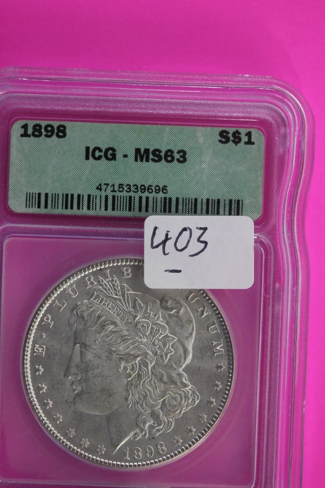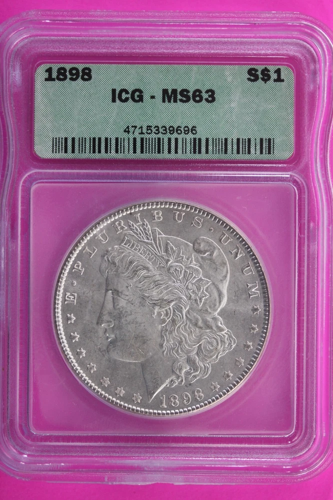 Certification: ICG Certification Number: na Brand: US Mint Coin: Morgan Silver Dollar Composition: Silver Year: 1898 Precious Metal Content per Unit: .7734oz Fineness: 0.900 Brand/Mint: U.S. Mint Seller Notes: “You will receive the exact same coin in the pictures. The background I use for pictures is colored.” Strike Type: Business Total Precious Metal Content: .7734oz Grade: MS 63 Country/Region of Manufacture: United States
