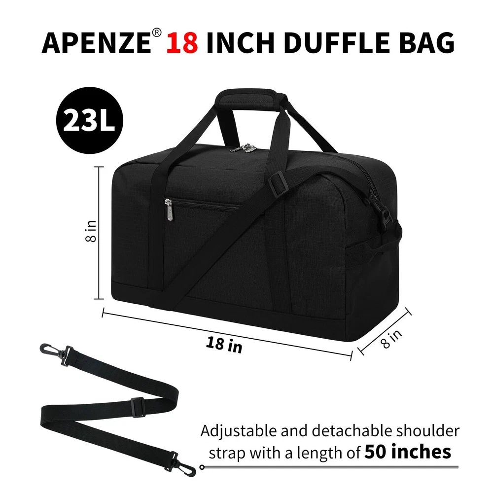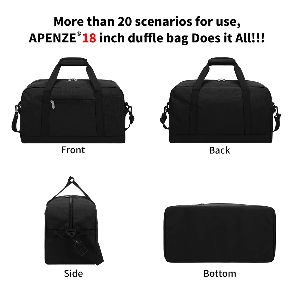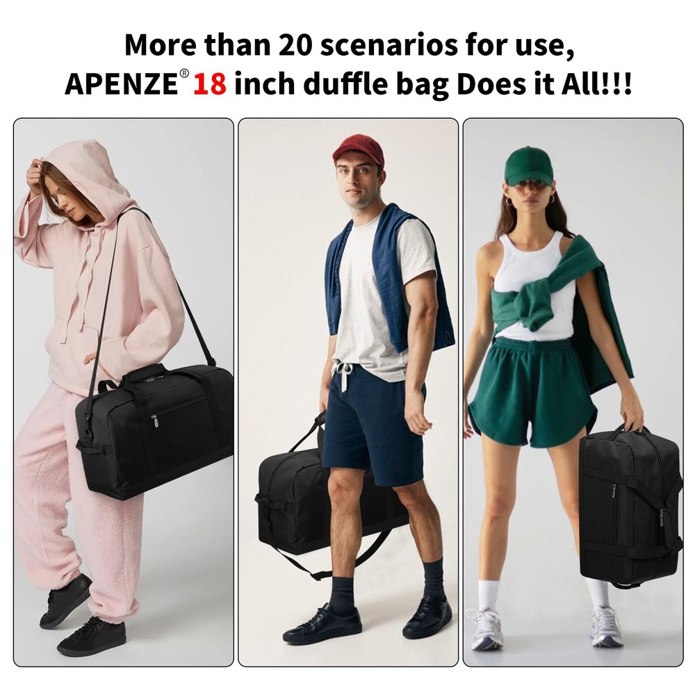 CARRY ON BAG : The size of the small travel bag is 18*9*9 inches, which complies with the airline's carry-on baggage standards and can be taken on the plane and placed under the seat HIGH QUALITY:This is a very functional and versatile gym bag, made of high quality 600D water & tear resistant polyester material, lightweight but well made. Durable and sturdy,not easy to tear when full EASY TO UES:The sport duffel bag has a detachable shoulder strap. The length of the shoulder strap can be adjusted freely, and can be carried on one shoulder or crossbody by adjusting different lengths. There are two hand straps on the top for easy carrying WELL STRUCTURED: This overnight bag is very well constructed and sturdy, it can keep its shape even when it is empty LOCKABLE ZIPPER: The weekend bag uses a double-ended zipper, and the middle of the zipper can be locked with a lock to prevent items from accidentally falling and protect the safety of items.The smooth metal zipper is strong and durable