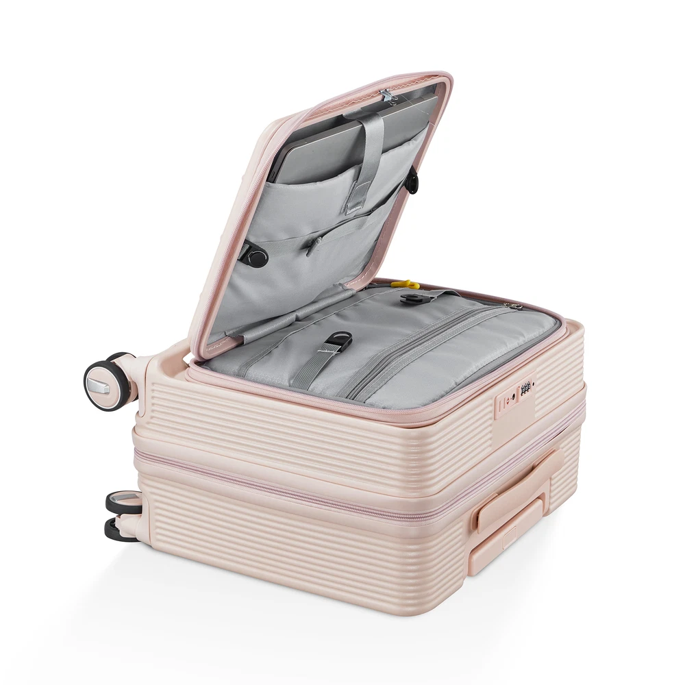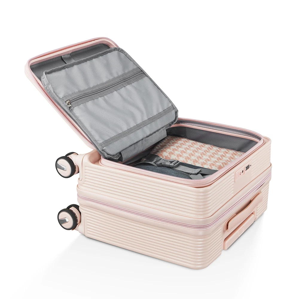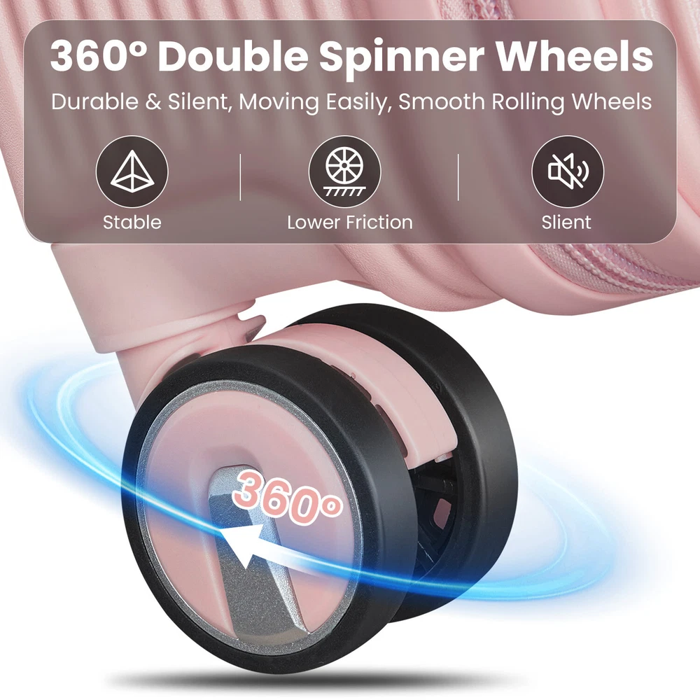 This 18" carry-on is a game-changer for travel! The front-open door and laptop interlayer make access super convenient, while the TSA lock adds security. The hard shell feels durable yet lightweight, and the spinner wheels glide smoothly. Love the included crossbody and cosmetic bags—perfect for keeping essentials organized. The stylish pink color stands out, and it fits airline requirements. Highly recommend for hassle-free trips!