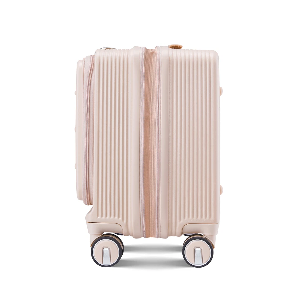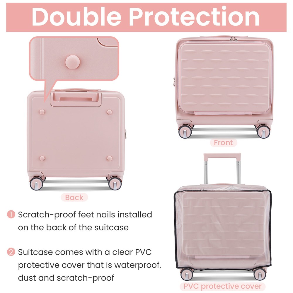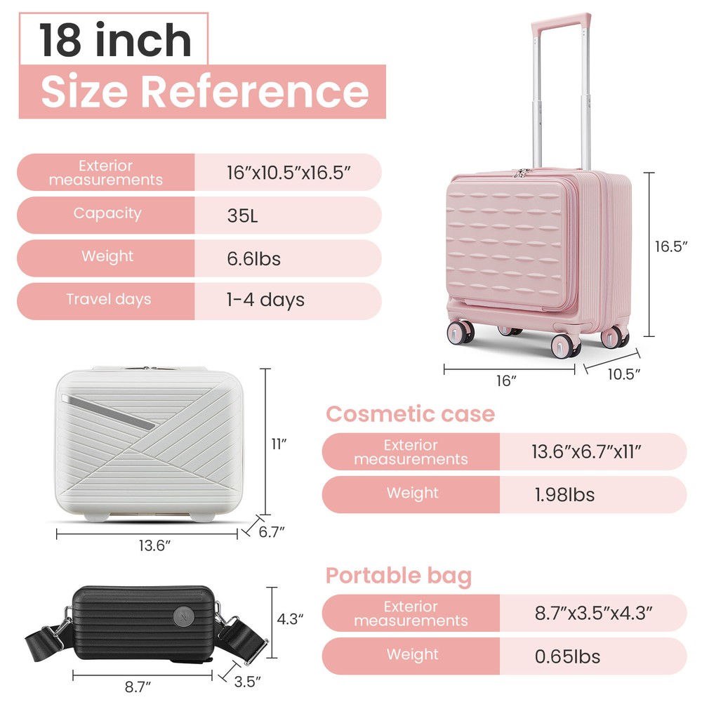Specification Product Information Item Code:W2098P183687 Product Type:General Item Product Name:18" Carry On Luggage with Front Open Door &Laptop Interlayer, Hard Shell Suitcase Built-In TSA Luggage Lock, Hardside Lightweight PC Travel Suitcase for Women Men with Spinner Wheels Airline Approved Place of Origin:China Main Color:Pink Main Material:PC Product Dimensions Assembled Length (in.):Not Applicable Assembled Width (in.):Not Applicable Assembled Height (in.):Not Applicable Weight (lbs.):Not Applicable Package Size Length (in.):16.00 Width (in.):10.00 Height (in.):16.00 Weight (lbs.):11.00 Product Features 【TSA Combination Lock】 TSA customs locks allow for more security and privacy during the journey, with the ability to perform non-destructive opening and inspection. 【Front Opening Compartment】This suitcase has a front compartment to categorize your computer or iPad and passport registry items for easy access, easy to separate electronic devices from clothing. 【Adjustable & Sturdy Handle】Ergonomic 3-step telescoping handle allows you to maneuver in tight spaces and provide effortless movement. Smooth ups and downs for more comfortable carrying. 【360°Double Wheels】The luggage rollers maneuver very smoothly whether the wheels are on the ground or airport floors. Reduced friction and shock absorption. 【Packaging】】Carry on Luggage Set include: 1*Crossbody Bag (Black), 1*Cosmetic Bag(White), 1*Carry-on Luggage (18 inch )
