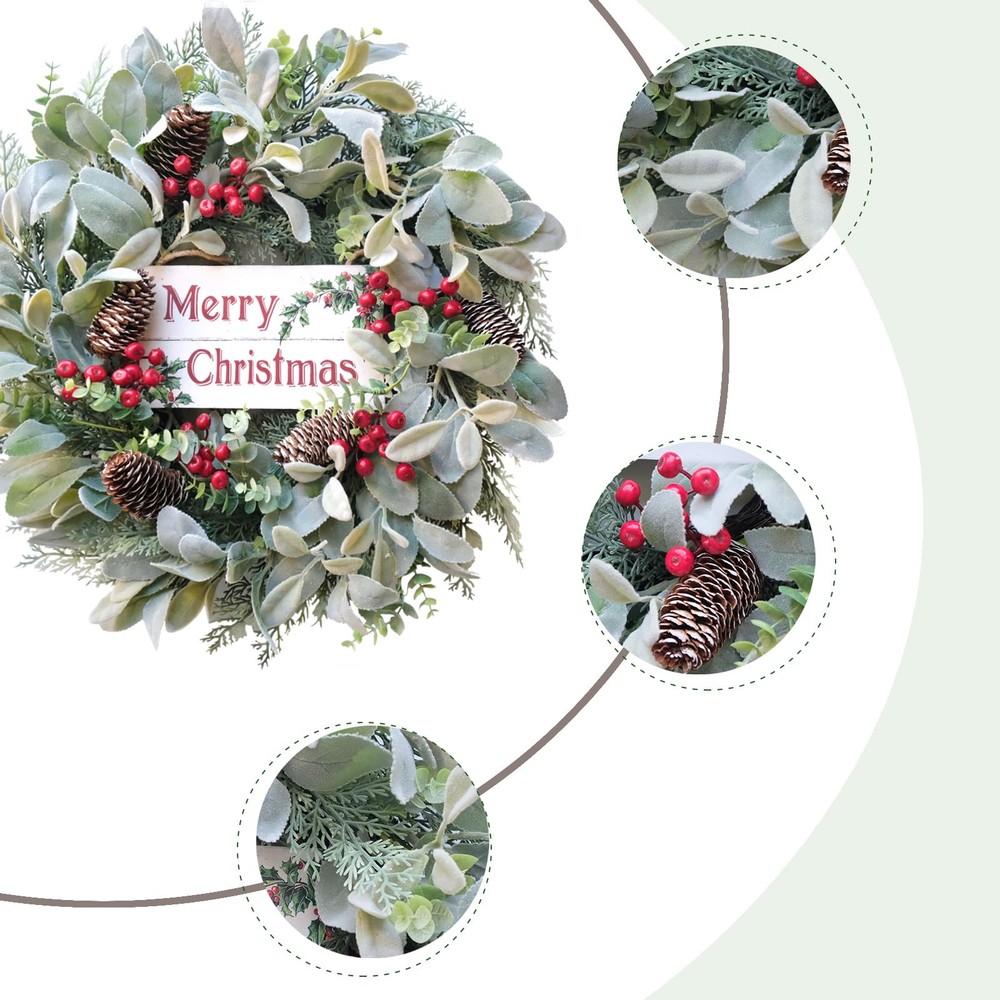 This wreath is absolutely stunning! The high-quality materials make it look so realistic—like fresh pine and berries. It’s sturdy, well-made, and adds instant festive charm to my front door. The mix of pine cones, eucalyptus, and berries gives it a cozy winter vibe. Perfect for Christmas decor or even year-round rustic style. I love that it won’t wilt or fade, and it’s such a great gift idea too! Makes my home feel so welcoming.