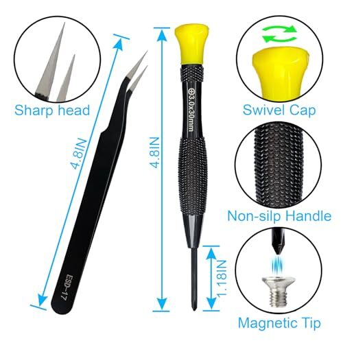 Return Policy Fast Delivery Trusted seller 18PCS Mini Precision Screwdriver Set With Case, Magnetic Small Flathead Phillips Pentalobe Torx Star Screwdriver Set Kit and Tweezers for Repairing Computer Eyeglass Phone Watch Product Description Blackened steel Wide Range of Applications: Precision screwdriver can easily tighten or loosen small screws in some household everyday products: glasses, watches, laptops, tablets, cameras, jewelry, Android / iPhone, toys and other electronic products Solid material: Small screwdriver sleeve rod Screwdriver sleeve rod is made of chromium-vanadium alloy steel blackening process,corrosion and oxidation resistant. The cutter head is magnetic and in addition, it is equipped with a magnetizer to make the screwdriver more capable of absorbing small screws. The ESD17 tweezers is made of stainless steel, painted to protect against static electricity and have prongs that can easily grip small screws Keep Organized: Mini screwdriver set with case is equipped with a transparent storage box to prevent loss, the screwdriver head comes in 4 different colors, red is a flathead screwdriver, yellow is a Phillips screwdriver, purple is a Pentalobe screwdriver, blue is a Torx screwdriver, and the handle is also marked with size and head edge, so it is easy to remove the screwdriver you want at a glance Compact Design: The head of the precision screwdriver kit is designed with a smooth rotating head, and the handle is covered with a fishscale frosted particle surface, which enables non-slip comfortable control and faster rotation of the screw when screwing What You Get: Precision Screwdriver Set With Case include 5 X red Flathead screwdrivers: 3/64IN(1.2) 1/16IN(1.5) 5/64IN(2.0) 3/32IN(2.5) 1/8IN(3.0); 4 X yellow Phillips screwdrivers: PH0000(1.2) PH000(1.5) PH00(2.0) PH0(3.0); 2 X purple Pentalobe screwdrivers:1/32IN(0.8) 3/64IN(1.2); 5 X blue Torx screwdrivers: T5 T6 T7 T8 T9; Tweezers: ESD17; Magnetizer; Transparent box Shipping Returns Payment Shipping Shipping is FREE to all addresses other than APO/PO boxes in the lower 48 states. All our stock ships from US-based warehouses. Shipped via USPS or UPS (depending on location and package weight) Unless stated otherwise, all orders will ship within 24-72 hours of your payment being processed. Check our feedback to see the great reviews of FAST shipping we offer. Returns Seller does not accept returns Payment We currently accept payment via eBay managed payments only. Once payment is cleared, we will dispatch your shipment within 1-3 business days. Please refer to the "Shipping" tab for more information regarding shipping speed to your destination.