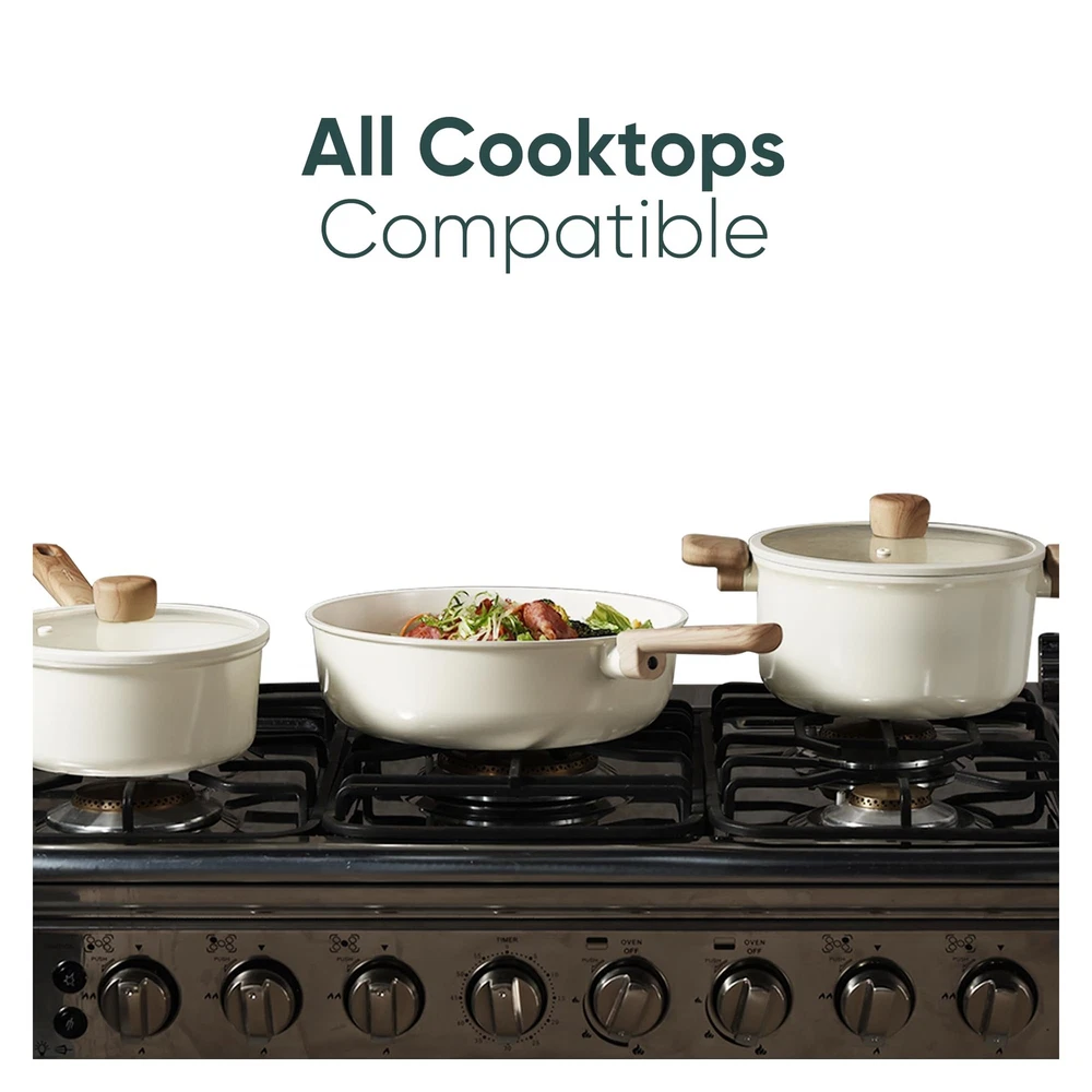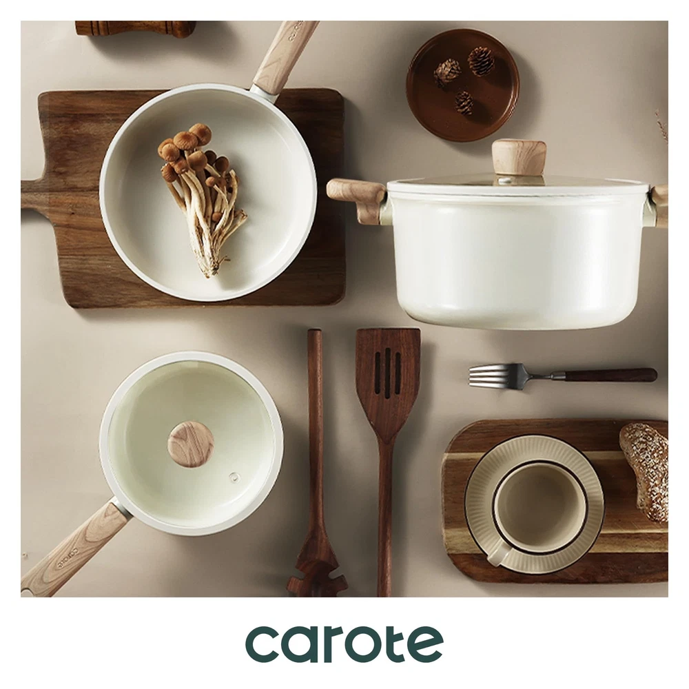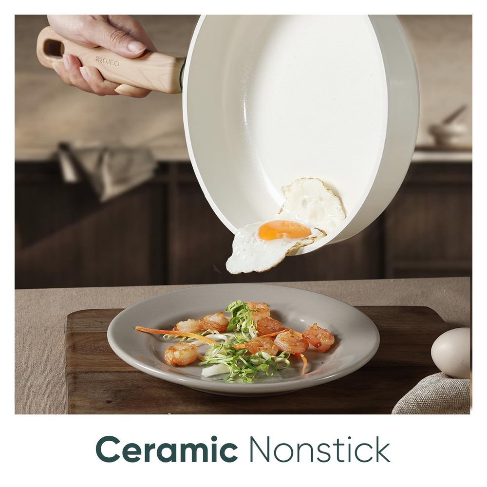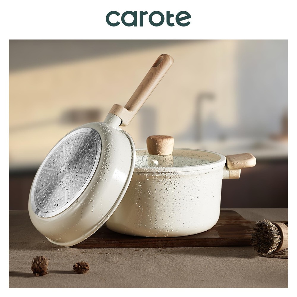 CAROTE 14Pcs Nonstick Ceramic Cookware Set, PFAS/PFOA Free, Cream White Pots and Pans Set Non Stick, Non-toxic Cookware,Kitchen Cooking Pan Set, Large Capacity Crafted with a non-toxic ceramic coating, our cookware brings high level non stick performance and elevate your cooking experience. The smooth ceramic coating doesn’t trap any food or sauce, and wipes clean with just a quick swipe or rinse, keeping your cookware looking brand new. Our cookware is free from harmful chemicals such as PFOA, PFAS, PTFE, lead and cadmium. With its robust design and high-quality ceramic coating, our cookware is built to withstand everyday cooking. While it's designed for durability, its non-stick surface ensures easy cleaning and consistent performance, meal after meal. Carote provides 12 months warranty from the date of purchase. Please don't hesitate to reach out if any quality problem. You will be guaranteed to get satisfying solution. Set includes: 8.5'' frying pan, 2-qt saucepan with lid, 5-qt sauté pan with lid, 7-qt casserole with lid, soup ladle, solid spatula,slotted spatula, 4*pan protectors.