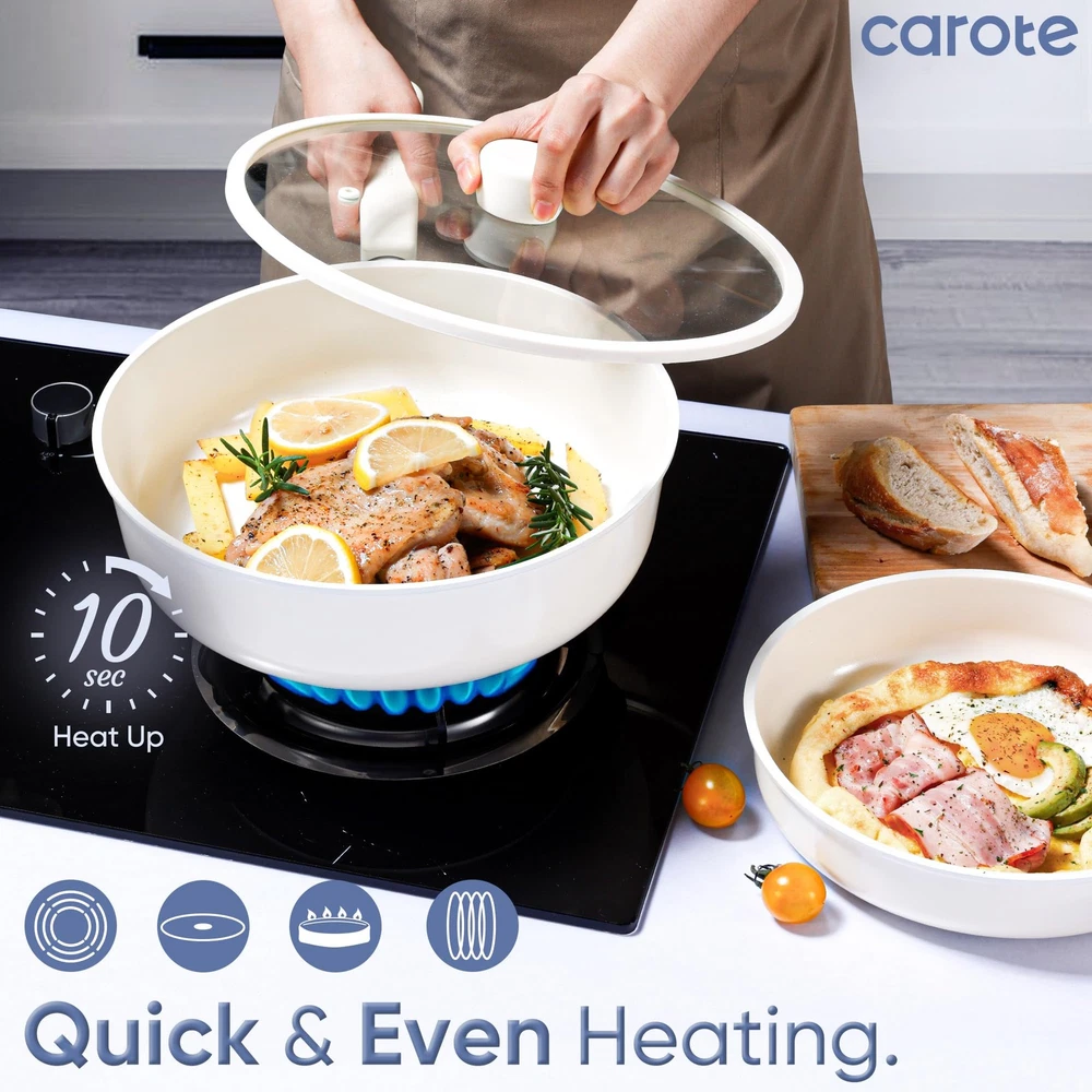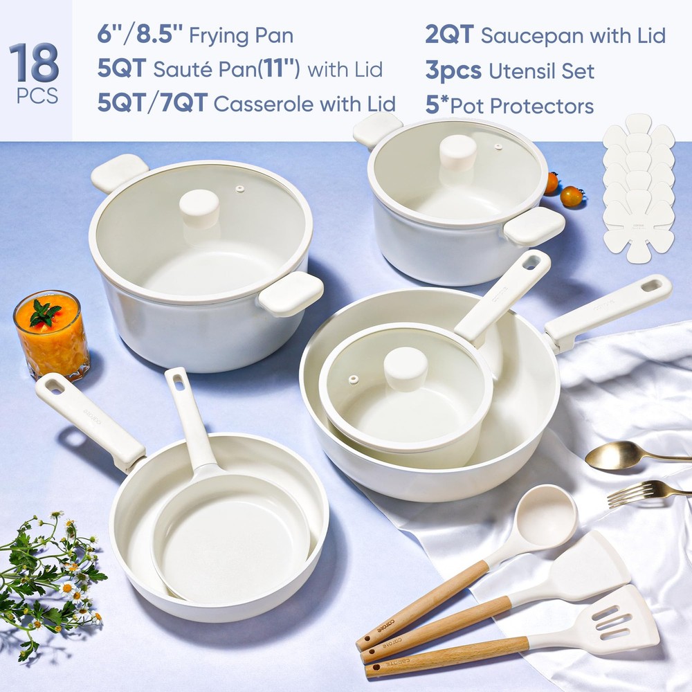 18Pcs Ceramic Pots and Pans Set Non Stick, Healthy Cookware Set, PFAS/PFOA Free, Kitchen Cooking Set with Frying Pans, Cream White Crafted with a non-toxic ceramic coating, our cookware brings high level non stick performance and elevate your cooking experience. The smooth ceramic coating doesn’t trap any food or sauce, and wipes clean with just a quick swipe or rinse, keeping your cookware looking brand new. Our cookware is free from harmful chemicals such as PFOA, PFAS, PTFE, lead and cadmium. With its robust design and high-quality ceramic coating, our cookware is built to withstand everyday cooking. While it's designed for durability, its non-stick surface ensures easy cleaning and consistent performance, meal after meal. provides 12 months warranty from the date of purchase. Please don't hesitate to reach out if any quality problem. You will be guaranteed to get satisfying solution. Set includes: 6'' fry pan, 8.5'' frying pan, 2-qt saucepan with lid, 5-qt sauté pan with lid, 5-qt casserole with lid, 7-qt casserole with lid, soup ladle, solid spatula,slotted spatula, 4*pan protectors.