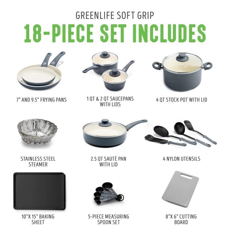 You may also like 7 Piece Nonstick Cookware Set Carbon Steel W/ Glass Lids & Bakelite Handles New 47.5 USD 50.0 USD Free shipping 5% off 10 Piece Nonstick Ceramic Cookware Set W/ Pouring Spouts Aluminum Design New 154.37 USD 162.49 USD Free shipping 5% off 10 Piece Ceramic Nonstick Aluminum Cookware Set Modern Square Design Cooking Set 154.37 USD 162.49 USD Free shipping 5% off 12-Piece Toxin-Free Nonstick Cookware Set Dishwasher Safe Durable Easy Cleanup 135.28 USD 142.4 USD Free shipping 5% off 10 Piece Nonstick Cookware Set Dishwasher Safe Riveted Cool Handles Glass Lids 41.53 USD 43.72 USD Free shipping 5% off 12 Piece Non-Stick Cookware Set Aluminum Ceramic Kitchen Cooking Essentials New 143.34 USD 150.88 USD Free shipping 5% off 20 Piece Nonstick Cookware Set Pots Pans Set Sturdy Secure W/Lid Dishwasher Safe 106.59 USD 112.2 USD Free shipping 5% off 12 Pc Non Stick Cookware Set Pots Pans W/ Lids Handles Cooking Tools Kitchen New 94.92 USD 99.92 USD Free shipping 5% off 12pcs Nonstick Aluminum Cookware Set Fry Pan Saucepan Dutch Oven Bakeware Green 93.72 USD 98.65 USD Free shipping 5% off 10 Pcs Non Stick Ceramic Cookware Set Aluminum Pots & Pans Dishwasher Safe New 84.22 USD 88.65 USD Free shipping 5% off 18 Piece Nonstick Cookware Set Kitchen Essentials Dishwasher Safe Utensils Red 59.34 USD 62.46 USD Free shipping 5% off Nonstick Cookware Set 14 Piece Soft Grip Handles Straining Lids Even Heat Base 94.86 USD 99.85 USD Free shipping 5% off The 18-piece cookware set with soft grip technology is all about comfort and control. Designed for effortless performance and cleanup, this set features our toxin-free Thermolon nonstick coating, which is free of PFAS, PFOA, lead, and cadmium. ’s healthy ceramic nonstick is not stuck in the past—that’s why our ceramic nonstick starts with sand and creates 60% less CO2 emissions during the curing phase than traditional coatings. The pans are also crafted with recycled aluminum, because we want your kids’ kids to cook healthy, too. Finished in vibrant colors, this set is outfitted with stay-cool handles to keep your cooking comfortable. Durable glass lids for a good look at any meal in progress without sacrificing heat. For all stove tops, except induction. Oven safe to 350°F. Dishwasher safe. This cookware set includes: 7" and 9. 5" open fry pans, 1-quart and 2-quart covered sauce pans, 4-quart covered Casserole, 2. 5-quart covered saute pan, stainless steel steamer, 10x15 inch baking sheet, 8x6 inch cutting board, 4 nylon utensils, and 5-piece measuring spoon set! Our healthy and easy-to-clean ceramic nonstick coating is derived from sand and free of PFAS, PFOA, lead, and cadmium for effortless cooking and quick cleanup Soft grip bakelite handles are designed to stay cool on the stovetop for maximum comfort Durable glass lids for a good look at any meal in progress without sacrificing heat. Made from recycled aluminum and reinforced with a wobble-free base for extra strength and even heating Dishwasher safe, but most messes wipe away Rivetless interior to prevent snags and food buildup You may also like 12L x 2 Deep fryers Commercial Deep Fryer Large Dual Tank Countertop Electric US 365.44 USD 384.67 USD Free shipping 5% off 16 Inch Oscillating Pedestal Fan 3 Speed Adjustable Height Indoor Air Circulator 32.01 USD 33.7 USD Free shipping 5% off 16 Inch Terra Cotta Plant Caddy W/ 5 Wheels UV Resistant Indoor Outdoor Use 34.91 USD 36.75 USD Free shipping 5% off 20V Variable Speed Cordless Palm Sander W/ Battery Charger Dust Bag Dual-grip US 66.96 USD 70.48 USD Free shipping 5% off Entertainment Cart Wood Garden Durable 2 Removable Trays Metal Frame Modern NEW 94.9 USD 99.9 USD Free shipping 5% off 2'3" X 4' Indoor Area Rug Navy Pile Height 1.25 in Polypropylene Livingroom New 25.52 USD 26.86 USD Free shipping 5% off Lockable Lid 19 Gal. Plastic Storage Box Bins Crate High-quality Tools Toys New 25.08 USD 26.4 USD Free shipping 5% off Ceiling Paint Primer Low VOC Stain Blocking Quick Dry Mold Resistant Gallon New 47.37 USD 49.86 USD Free shipping 5% off Camping Cookware Sets Pots Pan Cast Iron W/ Dutch Oven Lid Lifter 6 Pieces New 85.86 USD 90.38 USD Free shipping 5% off 3 Pack Ladder Back Barstool Adjustable Hight 360-Degree Swivel Leather Seat NEW 116.28 USD 122.4 USD Free shipping 5% off Round Wood Wall Mirror 21.6 Inch Modern Accent Home Décor Vanity Display New 73.36 USD 77.22 USD Free shipping 5% off Vintage Amber Champagne Flute Glass Set of 6 Dishwasher Safe Elegant Tableware 36.0 USD 37.89 USD Free shipping 5% off