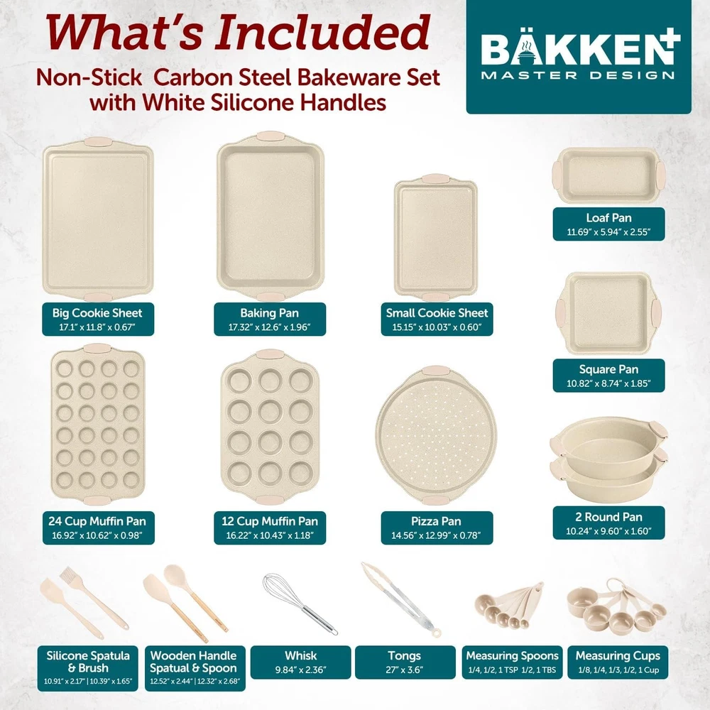 Material Carbon Steel Brand BAKKENMASTER Color White Marble Is Dishwasher Safe No Product Care Instructions Dishwasher Safe About this item COMPLETE 18-PIECE BAKEWARE SET: Includes various pans, trays, utensils, and measuring tools for versatile baking options. HIGH-QUALITY CONSTRUCTION: Made of durable carbon steel with a nonstick white marble coating inside and outside for easy release and cleaning. CONVENIENT SILICONE HANDLES: White silicone handles offer a comfortable grip and stay cool to the touch while baking. VERSATILE USE: Suitable for use in the oven, refrigerator, and freezer, making it perfect for baking a wide range of goods. TEMPERATURE RESISTANT: Withstands temperatures up to 446°F (230°C), ensuring reliable performance in high-heat baking environments.