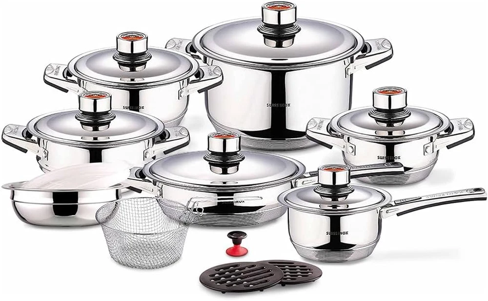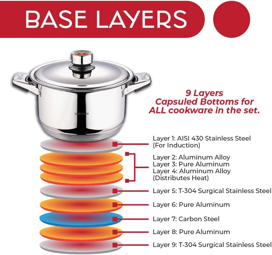 Swiss INOX Proline fully polished 9-ply capsuled bottom premium 18/10 induction compatible 18 piece t-304 heavy duty surgical stainless steel cookware set; great for induction cooking! Each pot comes with heat manage thermometer knob, so you know the exact temperature you're cooking your food European design along with Swiss quality control warrants that this cookware will last a lifetime Each pot is stackable to save time and energy while cooking; induction compatible "1. 1.7 Quart / 1.6 L Casserole with lid Measurements 6"" wide x 3"" height (measurements for pot only) 2. 3.3 Quart / 3.1 L Casserole with lid Measurements 8"" wide x 4"" height (measurements for pot only) 3. 6.7 Quart / 6.3 L Casserole with lid Measurements 9"" wide x 5.5"" height (measurements for pot only) 4. 3 Quart / 2.9 L Frypan with lid Measurements 9"" wide x 2.5"" height (measurements for pot only) 5. 3.3 Quart / 3 L Steamer Measurements 8"" wide x 4"" height (measurements for pot only) 6. 2 Qt / 1.8 L Saucepan with lid Measurements 6"" wide x 3.5"" height (measurements for pot only) 7. 8"" Mixing Bowl with lid 8. Frying Basket 9. Bakelite Mat x 2 pcs 10. Suction Knob Here are a breakdown of each of the 9 Layers which allows this cookware to cook food so Pure and evenly. Layer 1: AISI 430 Stainless Steel (For Induction) Layer 2: Aluminum Alloy (Distributes Heat) Layer 3: Pure Aluminum (Distributes Heat) Layer 4: Aluminum Alloy (Distributes Heat) Layer 5: T-304 Surgical Stainless Steel Layer 6: Pure Aluminum Layer 7: Carbon Steel Layer 8: Pure Aluminum Layer 9: T-304 Surgical Stainless Steel INDUCTION COMPATIBLE! WILL WORK ON ANY STOVE TOP!".