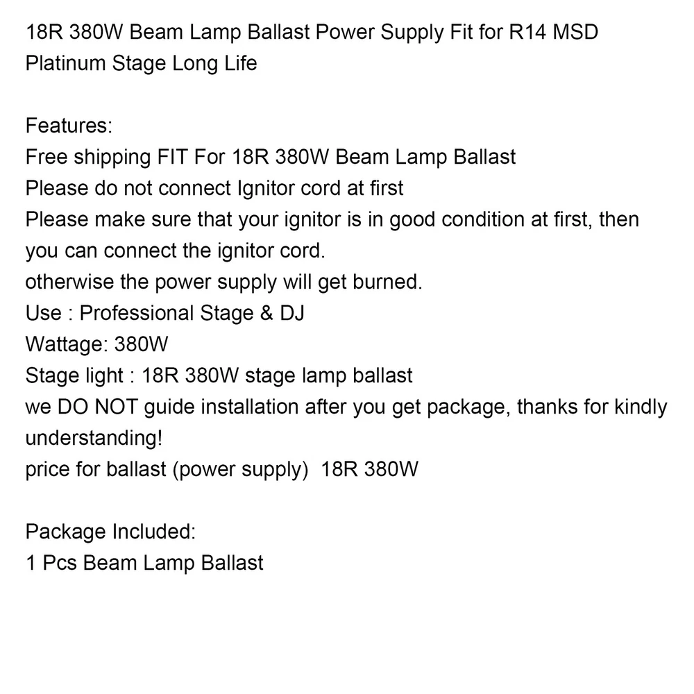 You may also like Replacement Bulb for 10R 260W Stage Lamp Moving Sharpy Beam Head Lighting US, 37.85 USD Free shipping Replacement Bulb for 7R 230W Stage Lamp Moving Sharpy Beam Head Lighting YU 33.85 USD Free shipping Replacement Bulb for 7R 230W Stage Lamp Moving Sharpy Beam Head Lighting 24.85 USD Free shipping Replacement Moving Head Beam Bulb 7/12R 230/280W Ballast Power Supply R7/12 MSD" 26.85 USD Free shipping 350W MSD 17R Lampharpy Beam Moving Head Replacement Bulbtagehow Lighting T 56.85 USD Free shipping 18R 380W Beam Lamp Ballast Power Supply Fit for R14 MSD Platinum Stage Long Life Features: Free shipping FIT For 18R 380W Beam Lamp Ballast Please do not connect Ignitor cord at first Please make sure that your ignitor is in good condition at first, then you can connect the ignitor cord. otherwise the power supply will get burned. Use : Professional Stage & DJ Wattage: 380W Stage light : 18R 380W stage lamp ballast we DO NOT guide installation after you get package, thanks for kindly understanding! price for ballast (power supply) 18R 380W Package Included: 1 Pcs Beam Lamp Ballast -About US Founded in 2012, VIPJQ have professional development and sales, and are involved in various products, providing customers with various high-quality products. Since its establishment, VIPJQ has always adhered to the service concept of "customer first" and the management concept of "pursuit of quality", and is committed to providing customers with high-quality original designs. We commit to provide you the best innovative, quality products & professional services with competitive prices. We value every customer, and we look forward to providing solutions for your business needs to help your business achieve its goals, please contact us immediately! We are all about you! We are a Japanese seller,but with large warehouse in USA. We are profesional on Auto Parts,Car Parts,Motorcycle Parts,3C,other hot sale items and so on. We aim to provide to customers high quality product and best service. -About Shipment&Returns The item usually will be dispatched within 3 days after you ordered.All are free shipping. And it usually takes 3-10 working days to delivery depends on buyers' address or other majeure on the way. If you are not satisfied with the items and want to return the item,we hope you could message us first,we will give you the return details, we think we could give you the best service to save your time and money.Thank you. -About Feedback&Customer Service If you are enjoy your shopping here,not only enjoy the items but also the service,we are appreciate you could give us a 5-star feedback. If you are not satisfied with the item,before you give us the negative feedback,we hope we could give you the best solution through our commutication. We think we could do it if you give us the chance.Thank you.