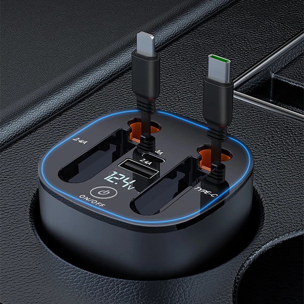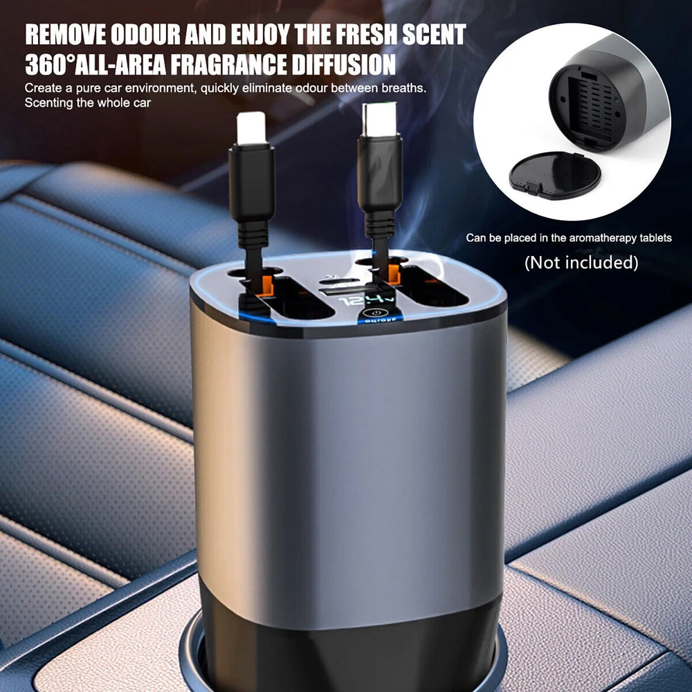 This car charger is a game-changer! It's super convenient with four charging ports, including USB-C and lightning, so you can charge any device. The retractable cable keeps things neat, and the mood lighting adds a cool vibe to my car. Even has an aromatherapy slot for a fresh scent—love the extra touch! Charges my phone crazy fast, and the compact design fits perfectly. No more juggling adapters, just plug and go. Really happy with this purchase!