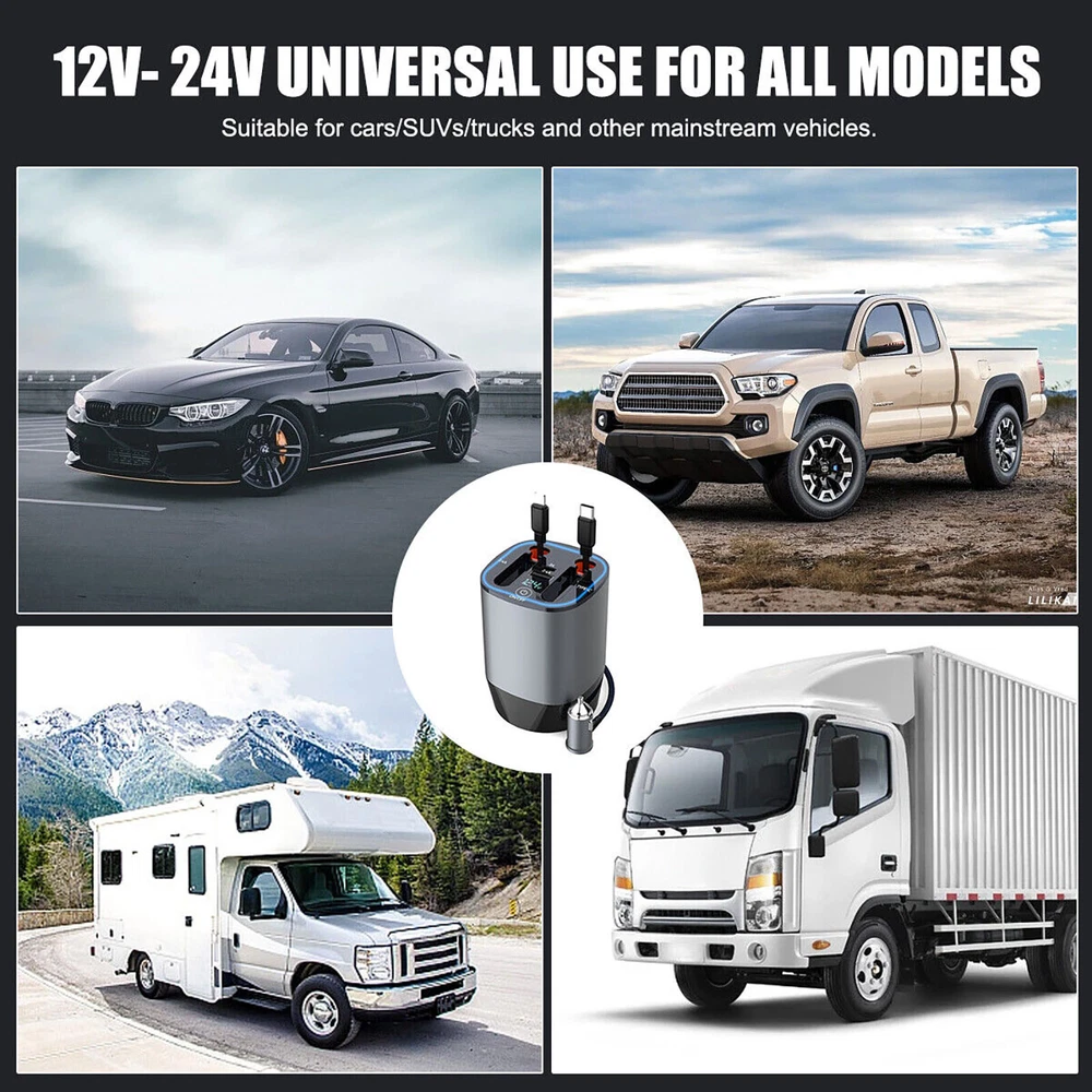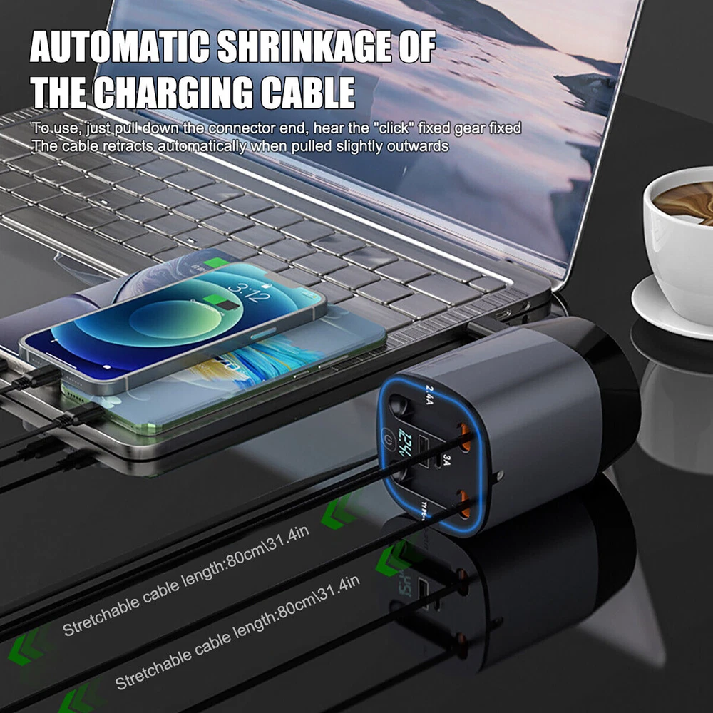 Product Description 100W 4IN1 Retractable Car Charger USB Type-C Cable For Phone Fast Charge Adapter Features: Four in one interface: Type-C cable+8 PIN cable+USB-C+USB-A four interface charging Comes with a retractable cable: Comes with an 80CM long retractable charging cable for easy storage and free adjustment of length Atmosphere lights: Three colors of atmosphere lights, embellishing the car space Aromatherapy compartment (aromatherapy tablets need to be provided by oneself): There is an aromatherapy tablet compartment at the bottom, where you can place your own aromatherapy tablets to freshen the car air Nylon woven cigarette lighter power cord Voltage display: Real time display of current voltage to understand changes in car voltage Specifications: Material: ABS+PC Extension line length: 80cm Input voltage: DC 12-24V Atmosphere light: blue, red, purple (can be turned off) Power output: TYPE-C: 5V/2A, 9V/2A, 12/1.5A (18W ) For iPhone: 5V/2.4A, USB: 5V/2.4A Package include: 1* Car multifunctional charger If you have any questions, please feel free to contact us via ebay. We usually respond within 24 hours. Payment Shipping Returns Contact Us We accept all verified payments from ebay. Orders will be shipped after receiving cleared payment. Payment due within 7 days after auction ends and for buy it now listings. We ship most of our orders within 24 hours, and may up to 48 hours for. If you want faster shipping way. Please contact us before making payment. Sometimes due to problems with our transportation company system, your shipping information may be delayed to update. We recommend that you try again after 3-4 days. If you still haven't checked the shipping information, you can contact us by ebay message. Always believe we can figure things out with communication, if it comes to return, the pacakge must be intact and the same as you receive. If you have any questions, please feel free to email our service specialists 24 Hours a Day, 7 Days a Week. We will reply you ASAP. Return/refund is accepted within 30 days after the buyer receives the item. NO exchange will be accepted after 30 days from the date when the item is received. Please contact us first before returning your product!!! If you have any questions, our Customer Service staffs welcome you to email us. We strive to answer all questions and resolve any problems as quickly as possible. You can contact us 7*24, we will reply at the first time, and we will surely solve your problems. Note: 1.We try our best to reply to your emails as soon as possible, however, due to high volume of daily incoming emails and time zone difference, we may not be able to reply your emails immediately. Please allow 1 business days for us to response. If you do not receive any reply from us, please check your email ensuring your mailbox has not reached full size. 2.Due to some ISP SPAM filter settings, you may not be able to receive our replies; if you have problems receiving our emails, you may need to use a different email account to contact us. 3.Please give us the opportunity to resolve any problem. We understand the concerns and frustrations you might have, and will try our best to resolve the issues. Please email us before leaving any negative feedback or open any dispute on PayPal. 4.We care about our valued customers, and will always try to help you. So if you have any problems, please e-mail us immediately. Payment We accept all verified payments from ebay. Orders will be shipped after receiving cleared payment. Payment due within 7 days after auction ends and for buy it now listings. Shipping We ship most of our orders within 24 hours, and may up to 48 hours for. If you want faster shipping way. Please contact us before making payment. Sometimes due to problems with our transportation company system, your shipping information may be delayed to update. We recommend that you try again after 3-4 days. If you still haven't checked the shipping information, you can contact us by ebay message. Returns Always believe we can figure things out with communication, if it comes to return, the pacakge must be intact and the same as you receive. If you have any questions, please feel free to email our service specialists 24 Hours a Day, 7 Days a Week. We will reply you ASAP. Return/refund is accepted within 30 days after the buyer receives the item. NO exchange will be accepted after 30 days from the date when the item is received. Please contact us first before returning your product!!! Contact Us If you have any questions, our Customer Service staffs welcome you to email us. We strive to answer all questions and resolve any problems as quickly as possible. You can contact us 7*24, we will reply at the first time, and we will surely solve your problems. Note: 1.We try our best to reply to your emails as soon as possible, however, due to high volume of daily incoming emails and time zone difference, we may not be able to reply your emails immediately. Please allow 1 business days for us to response. If you do not receive any reply from us, please check your email ensuring your mailbox has not reached full size. 2.Due to some ISP SPAM filter settings, you may not be able to receive our replies; if you have problems receiving our emails, you may need to use a different email account to contact us. 3.Please give us the opportunity to resolve any problem. We understand the concerns and frustrations you might have, and will try our best to resolve the issues. Please email us before leaving any negative feedback or open any dispute on PayPal. 4.We care about our valued customers, and will always try to help you. So if you have any problems, please e-mail us immediately. powered by