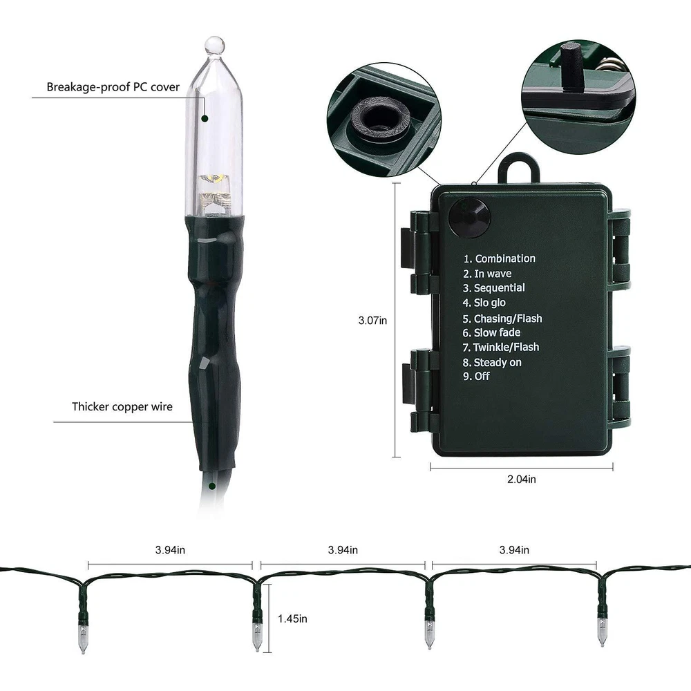 ✡✡✡TIPS: This item is WITHOUT REMOTE CONTROLLER , you can press the button on the battery box to choose the mode and the timer function is integrated into the lights, as long as you turn on the lights, it will be on for 6 hours and then it will be off automatically for 18 hours, which is very convenient to use and energy-saving Product Features LED mini Christmas decorative string lights are made with high-quality materials that can create a magical lighting experience for your room, window or office and add a beautiful decorative accent, designed for both indoors and outdoors . Suitable for your garden, patio, lawn, porch, gate, yard, bedroom, kitchen, etc. It is easy to use with battery operated (3 x AA size), which is energy saving and convenient , its warm white color can create a romantic sentiment. Perfect for spice up your decoration and adds welcome feelings to your party, restaurant and shops . IP65 waterproof rating of string lights and battery box is equipped with a timer function (pre-programmed timing sequence of 6 hours on, 18 hours off over each 24 hour period) and 8 modes (Combination,In Waves, Sequential, Slo Glo, Chasing/Flash, Slow Fade, Twinkle/Flash, Steady On). ADD TO CART - Let it set the right mood for your own lighting show and light up your celebration. General Specifications * Light color: Warm White(2700-3500K) * Battery: 3 x AA size 4.5 V (NOT INCLUDED) * LED quantity: 50pcs, 50 LED at 10cm/3.94in spacing * Cable length: 5m/16.4ft, lead length 50cm/1.64ft, lamp spacing 10cm/3.94in Package Included * 1 x Battery String Lights * 1 x User Manual [SAFE ENOUGHT] Powered by 3 AA battery(not included) allow you to hang anywhere, no plug needed, energy-saving and low consumption.You do not have to worry about the wires running all over the place, makes it very safe. [8 MODES LIGHTING] This LED mini light set with Combination, In waves, Sequential, Slow Glow, Chasing/Flash, Slow fade, Twinkle/Flash ect 8 lighting modes to suit different moods and occasions like parties, holidays, and celebrations. [TIMER FUNCTION] Built-in timer (6 hours ON and 18 hours OFF) will free your hands to turn on/off the Christmas lights and keep battery last as long as possible.This battery operated string lights is warm white, no harsh on eyes at night, comfortable and relaxing. [WATERPROOF OUTDOOR LIGHT] Christmas string light could withstand most unfavorable weather like raining and snowing,suitable for indoor and outdoor such as bedroom, pergola, tree, garden, patio etc.Which make every night starry nights, adding some whimsical ambiance. [WIDE APPLICATION] You can turn any space into a wonderland with the sparkling effects of our LED mini light. Ideal for Christmas, Valentine's Day, Easter, wedding, party and other celebration occasions even daily lighting decoration, great for indoor and outdoor decoration. Also perfect as gifts for family and friends. [SATISFACTION GUARANTEE] All of our battery powered string lights are tested for quality and safety. We will help you within 24 hours, please feel free to contact us.We are committed to providing you with a better shopping experience!