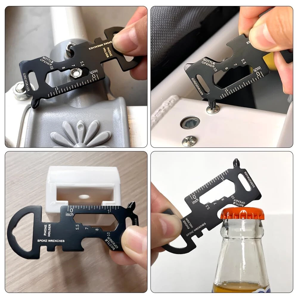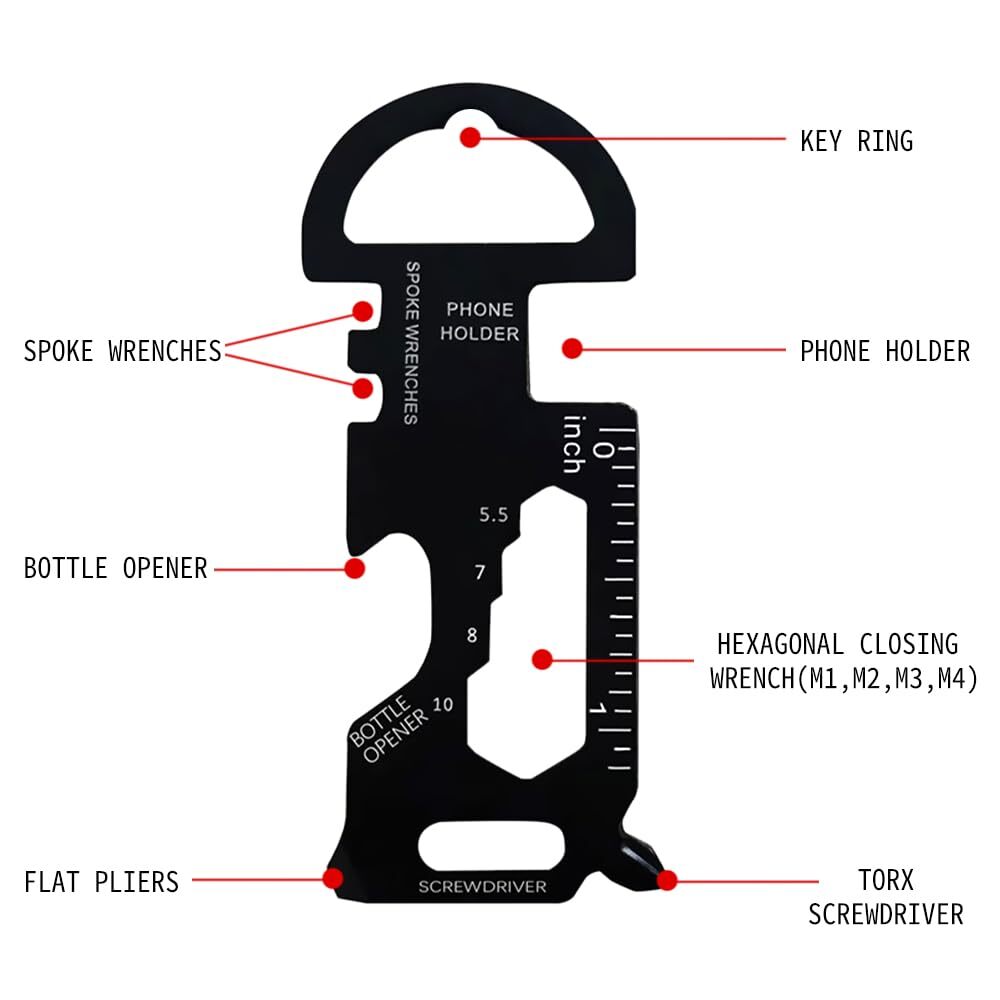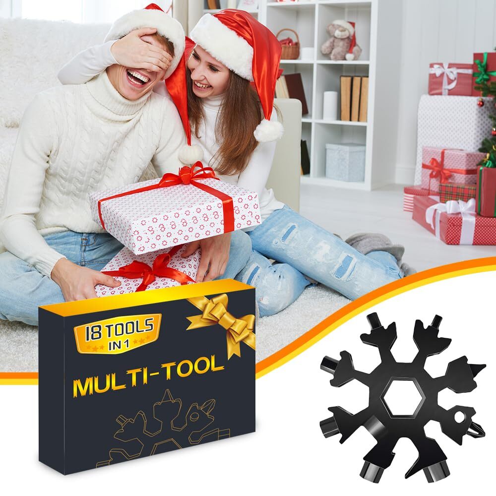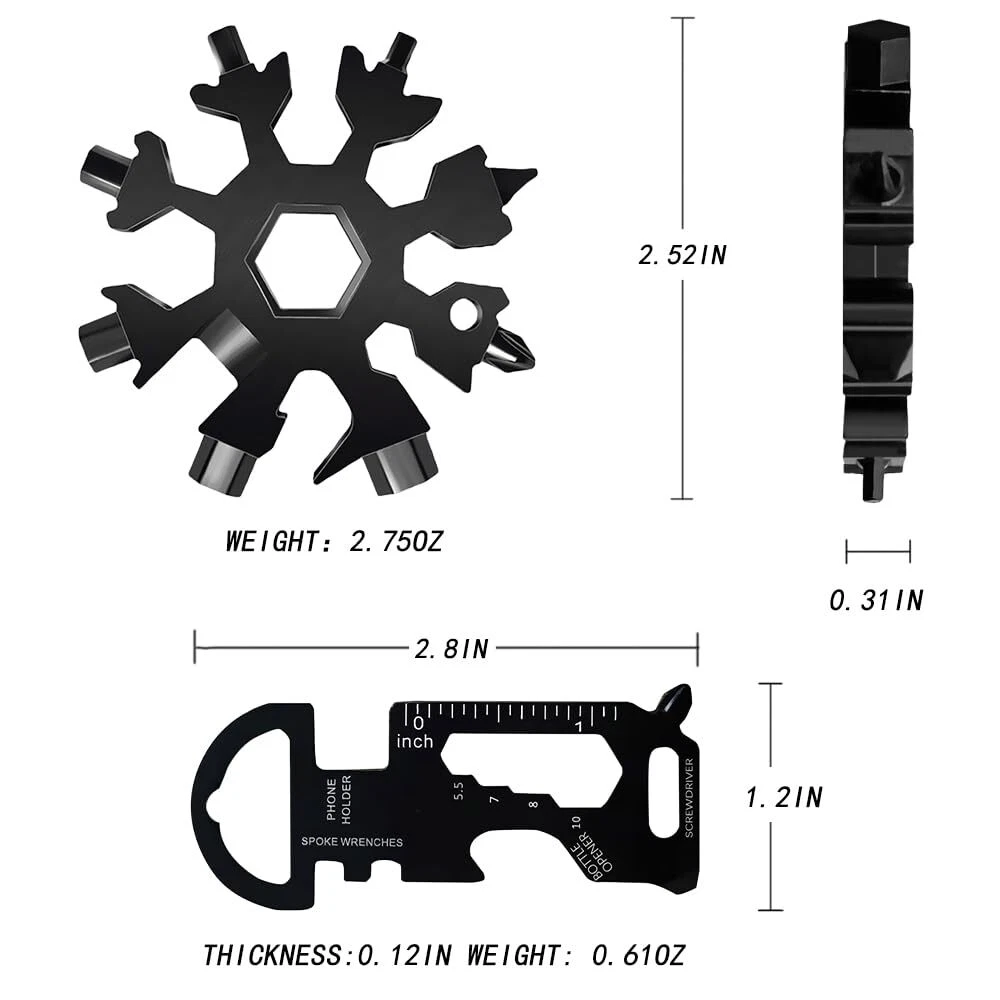 Best Stocking Stuffers Gifts for Men: The unique snowflake shaped design of the multi tool makes the dad men gift a novelty, handy and versatile. Small and practical. Cool gadgets for stocking stuffers, valentines day, fathers day gift, birthday gifts, gifts for men, husband, brother, son, great Christmas Xmas gifts for dad ... 18 Functions Tools: The 18 in 1 snowflake multitool gifts for men dad can be used as a Philips screwdriver, bicycle repair kit, slotted screwdriver, bottle opener, cross/flathead screwdriver, allen key, key Hole... High Quality & Extremely Robust: The 2024 UPGRADED snowflake multitool and keychain tool are made of super high quality chrome vanadium steel, electroplated, heat treatment, extremely strong, not easy to rust, bend or dull. Stronger and more durable, thicker and more sturdy, with smooth and exquisite surface. Space Saver Multitool: The snowflake multitool is small (2.36 " diameter) , but not too heavy (2.8 oz) connected to keychain or backpack with the included carabiners and keyrings. The multi tool can be used in travels, outdoor adventures, sports, camping, rescues... 8 in 1 Keychain Tool: The Key Shaped Pocket Tool contains 8 functions: key ring, spoke wrenches, bottle opener, holder, hexagonal closing wrench ( M1,M2,M3,), torx screwdriver, flat pliers. The length is 2.8in, width is 1.2in, weight is 0.61oz. You Will Get: 1* black snowflake multitool, 1* keychain multitool, 1* keyring, nice gift box.