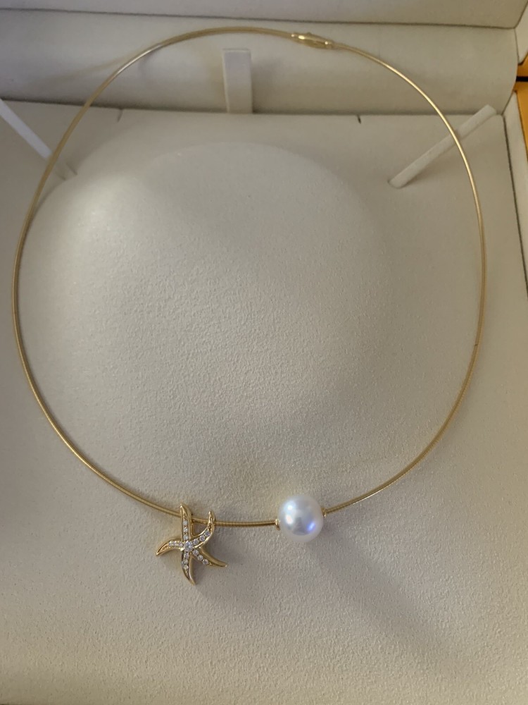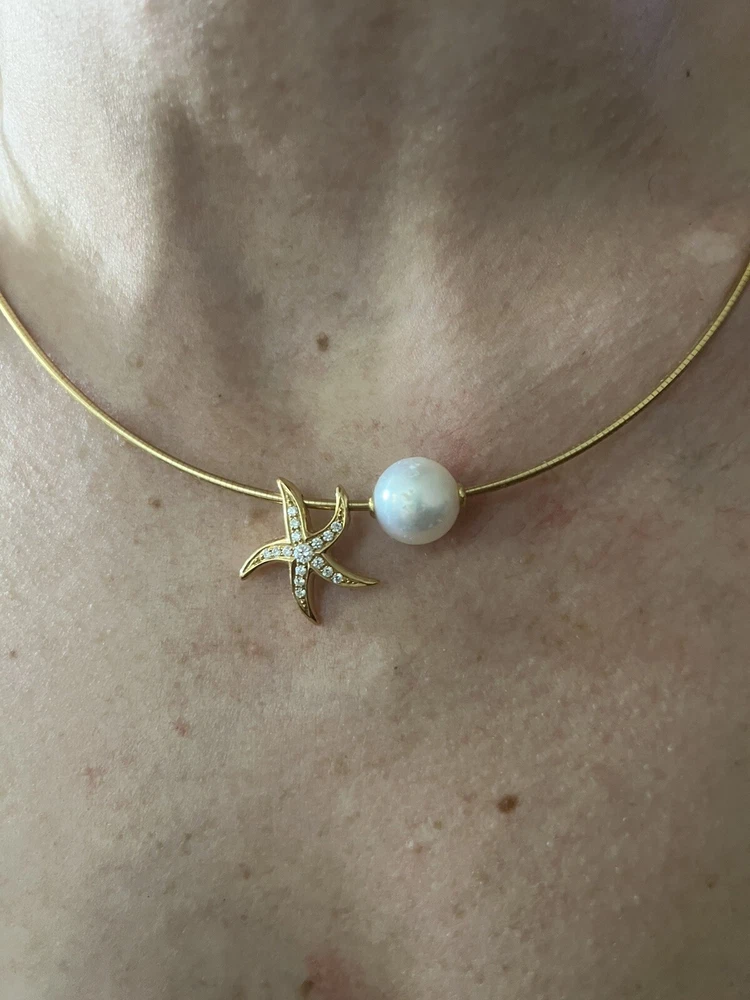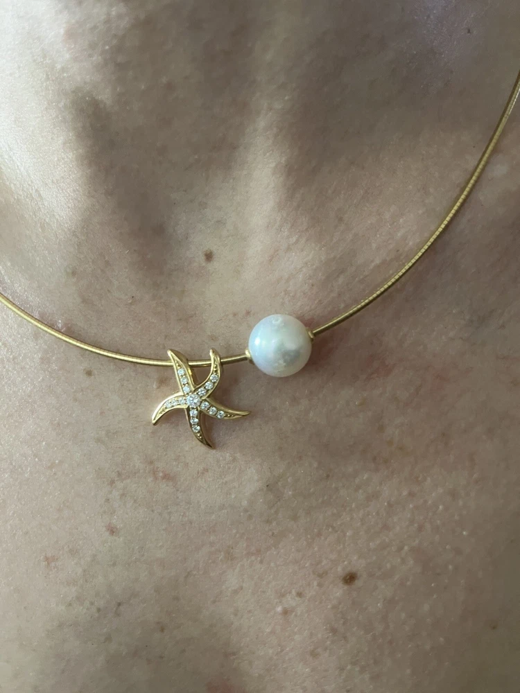 Paspaley 18kt 20” Omega Chain With Diamond Starfish And 12mm South Sea Pearl. Comes with cleaning cloth and certificate of authenticity. Perfect round white pearl with unique clasp. Paspaley pearls most expensive and finest in the world (Australia). If not 100% satisfied, can return Cannot find in US or Australia- design was discontinued many years ago